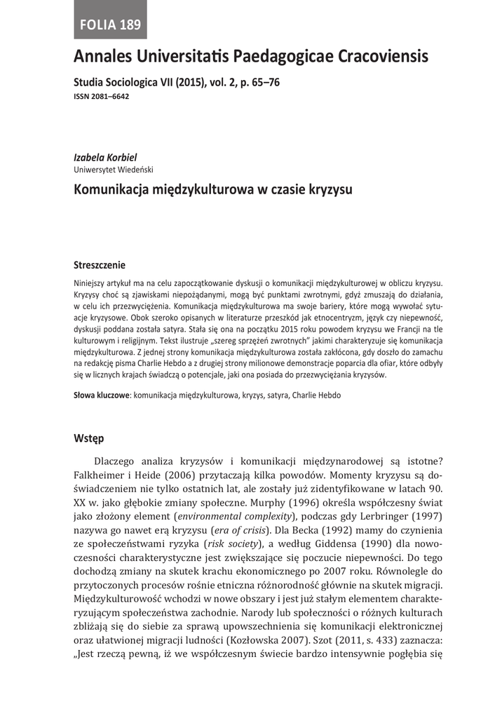 Folia 189 Annales Universitatis Paedagogicae Cracoviensis Studia Sociologica VII (2015), vol. 2, p. 65–76 ISSN 2081–6642 Izabela Korbiel Uniwersytet Wiedeński Komunikacja międzykulturowa w czasie kryzysu Streszczenie Niniejszy artykuł ma na celu zapoczątkowanie dyskusji o komunikacji międzykulturowej w obliczu kryzysu. Kryzysy choć są zjawiskami niepożądanymi, mogą być punktami zwrotnymi, gdyż zmuszają do działania, w celu ich przezwyciężenia. Komunikacja międzykulturowa ma swoje bariery, które mogą wywołać sytuacje kryzysowe. Obok szeroko opisanych w literaturze przeszkód jak etnocentryzm, język czy niepewność, dyskusji poddana została satyra. Stała się ona na początku 2015 roku powodem kryzysu we Francji na tle kulturowym i religijnym. Tekst ilustruje „szereg sprzężeń zwrotnych” jakimi charakteryzuje się komunikacja międzykulturowa. Z jednej strony komunikacja międzykulturowa została zakłócona, gdy doszło do zamachu na redakcję pisma Charlie Hebdo a z drugiej strony milionowe demonstracje poparcia dla ofiar, które odbyły się w licznych krajach świadczą o potencjale, jaki ona posiada do przezwyciężania kryzysów. Słowa kluczowe: komunikacja międzykulturowa, kryzys, satyra, Charlie Hebdo Wstęp Dlaczego analiza kryzysów i komunikacji międzynarodowej są istotne? Falkheimer i Heide (2006) przytaczają kilka powodów. Momenty kryzysu są doświadczeniem nie tylko ostatnich lat, ale zostały już zidentyfikowane w latach 90. XX w. jako głębokie zmiany społeczne. Murphy (1996) określa współczesny świat jako złożony element (environmental complexity), podczas gdy Lerbringer (1997) nazywa go nawet erą kryzysu (era of crisis). Dla Becka (1992) mamy do czynienia ze społeczeństwami ryzyka (risk society), a według Giddensa (1990) dla nowoczesności charakterystyczne jest zwiększające się poczucie niepewności. Do tego dochodzą zmiany na skutek krachu ekonomicznego po 2007 roku. Równolegle do przytoczonych procesów rośnie etniczna różnorodność głównie na skutek migracji. Międzykulturowość wchodzi w nowe obszary i jest już stałym elementem charakteryzującym społeczeństwa zachodnie. Narody lub społeczności o różnych kulturach zbliżają się do siebie za sprawą upowszechnienia się komunikacji elektronicznej oraz ułatwionej migracji ludności (Kozłowska 2007). Szot (2011, s. 433) zaznacza: „Jest rzeczą pewną, iż we współczesnym świecie bardzo intensywnie pogłębia się [66] Izabela Korbiel zjawisko zróżnicowań kulturowych poszczególnych obszarów czy społeczeństw, będących skutkiem nasilenia się procesów migracyjnych, wytwarzających nowe etniczne i kulturowe podziały, których obszar oddziaływania ukierunkowany jest na dawne, tradycyjne podziały etniczno-narodowe, a występujące głównie w Europie”. Komunikacja natomiast jest pierwszym i podstawowym krokiem w budowaniu więzi pomiędzy przedstawicielami odmiennych kultur. W literaturze najczęściej wyróżnia się cztery kategorie (Hepp 2006). Komunikacja międzynarodowa oznacza oficjalną komunikację pomiędzy państwami, upowszechnioną za pomocą mediów, następna w klasyfikacji komunikacja „rozwojowa” (development communication) dotyczy komunikacji medialnej wspierającej przemiany społeczne w krajach słabiej rozwiniętych. Przedmiotem analizy w przedłożonym tekście jest komunikacja międzykulturowa, oznaczająca komunikację interpersonalną przedstawicieli różnych kultur oraz powiązana z nią koncepcja komunikacji trans kulturowej. Ostatnia związana jest z procesem globalizacji i odbywa się pomiędzy różnymi kulturami, głównie za pośrednictwem mediów. W opinii Zdanowskiego (2000) kryzysy o podłożu kulturowym wynikają z trudności pogodzenia grupowego dążenia do utrzymania lub odzyskania tożsamości charakterystycznej dla danej grupy a procesami globalizacyjnymi i idącą za tym unifikacją. Jak zaznaczają Szot (2011), a także Kozłowska (2007) początkiem konfliktu może być błędne definiowanie tożsamości. Dzieje się tak najczęściej w społeczeństwach modernizujących się, gdzie powszechne procesy to zmiana podziału pracy i relacji wewnątrz społeczeństwa, indywidualizacja, szybko postępujące zmiany społeczne, identyfikowanie na nowo ról społecznych oraz niestabilność dotychczasowych instytucji i struktur. Członkowie różnych kultur mają problemy w rozumieniu innych z powodu odmiennych „systemów znaczeń” (Falkheimer, Heide 2006), najbardziej podstawowym jest język. Antropolog Edward T. Hall (1976), jeden z inicjatorów koncepcji komunikacji międzykulturowej, w latach 50. XX w., podkreślał drugi równie istotny czynnik, mianowicie kontekst. Kontekst zawiera informacje niewyartykułowane w przekazie, przy czym nierzadko jest istotniejszy niż sam przekaz słowny. Znaczenie kontekstu jest zróżnicowane w zależności od języka a stopień, w którym kontekst może wpływać na znaczenie zależy od kultury (Lim 2002). Z tego powodu dla prawidłowego odszyfrowania wiadomości, czyli odkodowania znaczenia, konieczna jest wiedza na temat kultury i języka nadawcy. Obok języka przeszkodą w efektywnej komunikacji mogą być różnice we wzorcach zachowań, mowa ciała oraz sygnały niewerbalne, które mogą być różnie interpretowane i blokować porozumienie. Komunikacja międzykulturowa może tym samym być zdefiniowana, jako studium zróżnicowanej interpersonalnej komunikacji pomiędzy członkami różnych kultur (Rogers, Hart 2002). Podobnie jak Hepp, autorzy zaznaczają oddzielność tej koncepcji od komunikacji międzynarodowej, która operuje w skali makro i skupia się na zagadnieniach władzy, polityki czy procesach kształtowania granic państwowych. Komunikacja międzykulturowa w czasie kryzysu [67] Ale kryzysy to także nagłe wydarzenia, zaburzające codzienność. Niewątpliwie kryzysem były zamachy w Paryżu wymierzone w redakcje satyrycznego pi