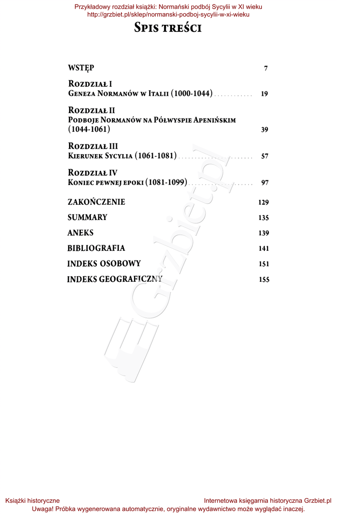 Przykładowy rozdział książki: Normański podbój Sycylii w XI wieku http://grzbiet.pl/sklep/normanski-podboj-sycylii-w-xi-wieku SPIS TREŚCI WSTĘP 7 RozDziALI GENEZA NoRMANÓW W ITALII (1000-1044). 19 ROZDZIAŁ II PonBOJE NoRMANów NA PÓŁWYSPIE APENIŃSKIM ( 1044-1061) 39 ROZDZIAŁ III KIERUNEK SYCYLIA (1061-1081). 57 ROZDZIAŁ IV KONIEC PEWNEJ EPOKI (1081-1099). 97 ZAKOŃCZENIE 129 SUMMARY 135 ANEKS 139 BIBLIOGRAFIA 141 INDEKS OSOBOWY 151 INDEKS GEOGRAFICZNY 155 Książki historyczne Internetowa księgarnia historyczna Grzbiet.pl Uwaga! Próbka wygenerowana automatycznie, oryginalne wydawnictwo może wyglądać inaczej. Przykładowy rozdział książki: Normański podbój Sycylii w XI wieku http://grzbiet.pl/sklep/normanski-podboj-sycylii-w-xi-wieku 148 BIBLIOGRAFIA Skinner P., The Tyrrhenian Coastal Cites under the Normans, red. G.A. Loud, A. Metcalfe, Leiden-Boston-Koln 2002, s. 75-96. Skoulatos B., Les persannages byzantins de l'Alexiade: analyse prosopographique et synthese, Louvain 1980. Smidt W., Die "Historia Normannorum" von Amatus, Stucli Gregoriani 3 ( 1948), s. 173-231. Sokołow N., Narodziny weneckiego imperium kolonialnego, tłum. Z. Dobrzy niecki, Warszawa 1985. Stanton C.D., Norman Naval Operations in the Mediterranean, Woodbridge 2011. Stanton C.D., Roger de Hauteville, Emir oj Sicily, Mediterranean Historical Re view 25/2 (2010 ), s. 113-132. Stanton C.D., The Naval Strategy oj Roger II, King oj Sicily, w: New Interpreta tions in Naval History, red. M. Yu, Annapolis 2009, s. 14-33. Stanton C. D., Ihe Use oj Naval Power in the Norman Conquest oj Southern Italy and Sicily, Haskins Society Journall9 ( 2007), s. 120-136. Stephensan P., Byzantium's Balkanian Frontier, Cambridge 2000. Stephensan P., Ihe legend ojBasil the Bulgar-Slayer, Cambridge 2003. Strzelczyk J., Wandalowie i ich afrykańskie państwo, Warszawa 1992. Takayama H., Amiratus in the Norman Kingdom oj Siciły - A Leading Office oj Arabie Origin in the RoyalAdministration, w: Papstgeschichte, Reichsgeschichtc, Landesgeschichte, red. E. Borchardt, E. Bunz, Wien 1998, s. 133-144. Takayama H., Ihe Administration oj the Norman Kingdom oj Sic iły, Leiden-New York-Koln 1993. Takayama H., Ihe Fatimid and Kałbite Governors in Sicily: 909-1044, Islamie Siciły II, Mediterranean World 13 ( 1992), s. 21-30. Theotok.is G., Ihe campaigns oj the Norman dukes oj southern Italy against Byzantium, in the years between 1071 and 1108 AD, PhD thesis, Glasgow 2010. Thierry A., Histoire de la conquete de l'Angleterre par les Normands, t. I-IV, Paris 1839. Vasilevsk.ij VG., Trudy, t. l, Sankt Petersburg 1908. Waley D.P., Combined Operations in Sicily, A.D. l 060-78, Papers of the British School at Rome, 22 ( 1954 ), s. 118-125. Wettinger G., Ihe Norman Heritage oj Malta: Godfrey Wettinger s~fts the evidence surronding Counts Roger 's visitin 1091, Treasures ofMalta l ( 1995 ), 3, s. 3-ł-39. WolfK.B., Ihe Normans and their HL\torians in Eleventh Century-Italy, Philadelphia 1995. Wolfgang F., Byzanz und die islamische We/t im fruhen 11. Jahrhwtdert. Geschich te der politischen Beziehungen von l 00 l bis l 055, Byzantina Vindobonensia 14, Wien 1981. Wolińska T., Rola Sycylii w wojnach wandalskich i gockich Justyniana Wielkiego, Przegląd Historyczny ( 2000), z. 3, s. 321-340. Wolińska T., Sycylia w polityce bizantyńskiej w FI-IX w., Łódź 2005. Wolińska T., Wareg w Bizancjum. Sycylijska przygoda Hara/da Hardraade, BaJ canica Posnaniensia. Acta et studia 15( 2009 ), s. 67-77. Yewdale R.B., Bohemand l, Prince oj Antioch, Princenton 1924. Książki historyczne Internetowa księgarnia historyczna Grzbiet.pl Uwaga! Próbka wygenerowana automatycznie, oryginalne wydawnictwo może wyglądać inaczej. Przykładowy rozdział książki: Normański podbój Sycylii w XI wieku http://grzbiet.pl/sklep/normanski-podboj-sycylii-w-xi-wieku INDEKS OSOBOWY Abelard, buntownik 73, S6, S7, 93, 94, 101 Abu Hafas, emir sycylijski 27, Adelajda, żona Rogera I 115, 124, 125, 127 Agryros, syn Melusa, buntownik i bizantyński katepan 32, 33, 34, 36, 39,41,43, -H,4S,SS Ahmad Ibn Umar Ibn Abd Allah Ibn al ·Aglab 116 al-Akhal, emir sycylijski 27 Aleksy I Komnen, cesarz bizantyński 16, 94,102, liS Ali Hasan 57 Amatus z Monte Cassino, kronikarz 13, 14, 19,20,21,22,2S,31,34,37,43,4S,60, 62,63, 75, 7S,S2,9S Amicus, buntownik S7, 93, 94, Anna Komnena, kronikarka 16,41,42 Arabowie 12, 27, 2S, S9-6S, S7, Arduin, buntownik 2S, 29, 30, Arduin zJoviensem, biskup 122 Argyritzos, buntownik z Bari S7, 94 Arkadiusz z Palenno 70 Asclettin 21 Asclettin, pan Acerenzy 34 Asclettin I1 z Acerenzy 39 Atenulf, książę Beneventu 31, 32, Aureolmus 46 Ayub i Ali, dowódcy arabskich najemników 76,77,109 Balalard, buntownik S4 BaJdwin i Gradilon, buntownicy S7, 93 Bazyli II, cesarz 7,S, 20,21,23, 26, 27,35 Bazyli Boiannes, katepan 7, 23, 24, 26, 27, 31 Bazyli Mesardonites, 22 Bechus (Abu-Bekr), pan Castro-novum 90, 91 Belcarned(Ibn-Hawwas), władca Palenno SS, 60, 69, 76, 77 Bemavert (Ibn-ei-Werd), emir Syrakuz SS, S~90,99,100, lOS, 106,114,115 Betumen( Ibn-Timna), władca Katanii i Sy rakuz SS, 62, 63, 65 Benthumen, muzułmanin z Katanii 99, 100 Boemund, syn Guiscarda 16, S2,97,9S,99, 101,102,104,113,114, 122,126 Bułgarzy7 Charnut, władca Castro-Johannis i Agri gentu 110, 111, 112, 126 Dato, krewny MeJusa 22, 24 de Brienne, konetabl1 02 Dezyderiusz, opat Monte Cassino 13, 14, SS Drago (Dragon), hrabia Apulii 28, 40, 41, 42, 43, 44, SS, 130 Drengot, ród 17, 35, 40 Elbus, zięć Guiscarda 98 Eliasz Cartomensis, konwertyta 99, 100, 132 Emma, córka Rogera I 113, 127 Eviscardus, Bretończyk 91 Exaugust, katepan 31, 32 Fatymidzi, dynastia 57 Filip, syna Grzegorza patrycjusza l O Filip, król Francji 113 Książki historyczne Internetowa księgarnia historyczna Grzbiet.pl Uwaga! Próbka wygenerowana automatycznie, oryginalne wydawnictwo może wyglądać inaczej. Przykładowy rozdział książki: Normański podbój Sycylii w XI wieku http://grzbiet.pl/sklep/normanski-podboj-s