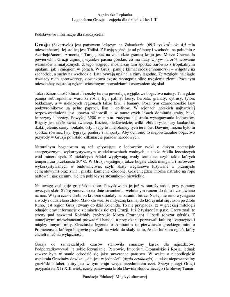 Agnieszka Lepianka Legendarna Gruzja – zajęcia dla dzieci z klas I-III Podstawowe informacje dla nauczyciela: Gruzja (Sakartvelo) jest państwem leżącym na Zakaukaziu (69,7 tys.km2, ok. 4,5 mln mieszkańców). Jej stolicą jest Tbilisi. Z Rosją sąsiaduje od północy i wschodu, na południu z Azerbejdżanem, Armenią i Turcją, zaś na zachodzie granicą kraju jest Morze Czarne. ¾ powierzchni Gruzji zajmują wysokie pasma górskie, co ma duży wpływ na zróżnicowanie warunków klimatycznych. Z tego względu można się tam spotkać zarówno z tropikalnymi upałami, jak i śniegiem w górach. W Gruzji panuje klimat śródziemnomorski – wilgotny na zachodzie, a suchy na wschodzie. Lata bywają upalne, a zimy łagodne. Ze względu na ciągle trwający ruch górotwórczy, stosunkowo często występują silne trzęsienia ziemi. Poza tym mieszkańcy często są nękani wiosennymi powodziami i osuwaniem się skał. Taka różnorodność klimatu i rzeźby terenu powodują wyjątkowe bogactwo natury. Tam gdzie panują subtropikalne warunki rosną figi, palmy, laury, herbata, granaty, cytrusy, tytoń, bakłażany, a w niektórych regionach także kiwi i banany. Poza tym czarnomorskie lasy podzwrotnikowe są pełne paproci, lian i epifitów. W rejonach górskich najbardziej rozpowszechniona jest uprawa winorośli, a w tamtejszych lasach dominują graby, buki, leszczyny i brzozy. Powyżej 3200 m n.p.m. zaczyna się strefa występowania lodowców. Bogaty jest także świat zwierząt. Kozice, niedźwiedzie, wilki, żbiki, rysie, tury kaukaskie, dziki, jelenie, sarny, szakale, orły i sępy to mieszkańcy tych terenów. Dawniej można było tu spotkać również lwy, tygrysy, pantery i lamparty. Aby ochronić to niepowtarzalne bogactwo przyrody w Gruzji powstało kilkanaście parków narodowych. Naturalnym bogactwem są też spływające z lodowców rzeki o dużym potencjale energetycznym, wykorzystywanym w elektrowniach wodnych, a także źródła leczniczych wód mineralnych. Z niektórych źródeł wypływają wody termalne, czyli takie których temperatura przekracza 20º C. W Gruzji występują także bogate złoża manganu i surowców wykorzystywanych w budownictwie, czyli: skały węglanowe (używane w przemyśle cementowym) oraz żwir , piaski, kamienie ozdobne. Gdzieniegdzie można natrafić na ropę naftową i gaz ziemny, ale ich pokłady są stosunkowo niewielkie. Na uwagę zasługuje gruzińskie złoto. Pozyskiwano je już w starożytności, przy pomocy owczych skór. Skórę zanurzano na dnie strumienia, wełnianym runem do dołu i zostawiano na noc. W tym czasie drobinki kruszcu osiadały na baranim futrze Następnie runo wyciągano z wody i oddzielano złoto. Mało kto wie, że mityczną krainą, do której udał się Jazon po Złote Runo, jest region Gruzji zwany do dziś Kolchidą. To nie przypadek, że w greckiej mitologii odnajdujemy informacje o ziemiach dzisiejszej Gruzji. Już 2 tysiące lat p.n.e. Grecy znali te tereny pod nazwami Kolchidy (wybrzeże Morza Czarnego) i Iberii (obszar górski). Z tamtejszymi mieszkańcami prowadzili handel, a przy okazji poznawali kulturę i zapożyczali między innymi mity. Gruzińska legenda o Amiranim to pierwowzór greckiego mitu o Prometeuszu, którego bogowie przykuli na wieki do skały za to, że dał ludziom ogień, który chcieli mieć na wyłączność. Gruzja od zamierzchłych czasów stanowiła smaczny kąsek dla najeźdźców. Podporządkowywali ją sobie Rzymianie, Persowie, Imperium Otomańskie i Rosja, jednak zawsze była w stanie odrodzić się jako suwerenne państwo. W walce o niepodległość wspierała Gruzinów dewiza: „siła jest w jedności” (dzala ertobaszia), a także niepowtarzalny gruziński alfabet, który jest w tym kraju wręcz przedmiotem czci. Szczyt potęgi Gruzji przypada na XI i XIII wiek, czasy panowania króla Dawida Budowniczego i królowej Tamar. Fundacja Edukacji Międzykulturowej Agnieszka Lepianka Legendarna Gruzja – zajęcia dla dzieci z klas I-III Po całej Gruzji rozsiane są zabytki pamiętające zamierzchłe czasy. Warto wspomnieć o przepięknej architekturze bardzo starych chrześcijańskich kościołów (Gruzja jako druga w 317 r. przyjęła chrześcijaństwo). Bogactwo przyrody, zabytki i gościnność tamtejszych ludzi sprawiają, że Gruzja jest wymarzonym miejscem do wypoczynku. Fundacja Edukacji Międzykulturowej