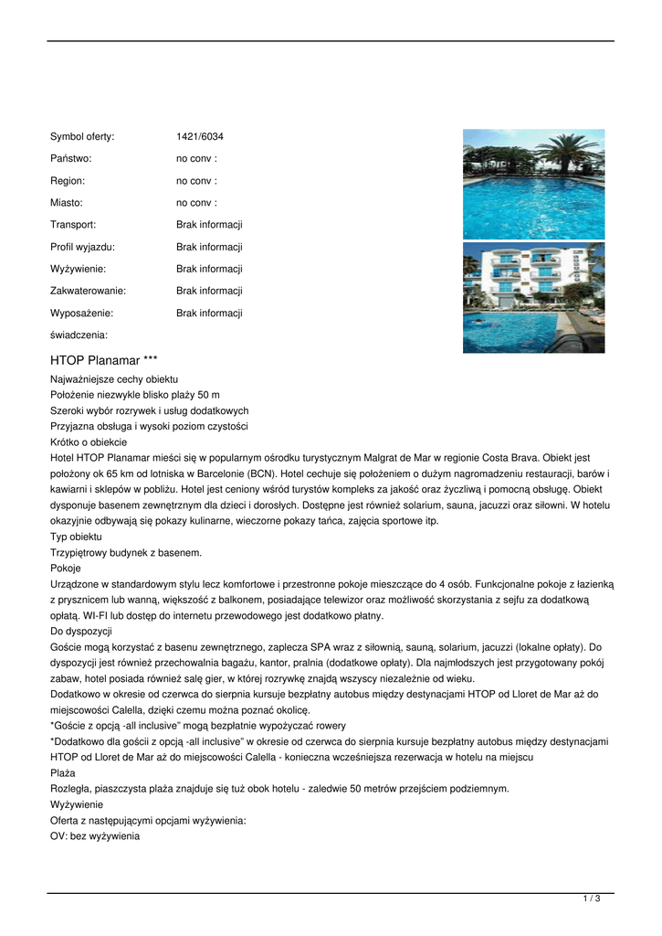 Symbol oferty: 1421/6034 Państwo: no conv : Region: no conv : Miasto: no conv : Transport: Brak informacji Profil wyjazdu: Brak informacji Wyżywienie: Brak informacji Zakwaterowanie: Brak informacji Wyposażenie: Brak informacji świadczenia: HTOP Planamar *** Najważniejsze cechy obiektu Położenie niezwykle blisko plaży 50 m Szeroki wybór rozrywek i usług dodatkowych Przyjazna obsługa i wysoki poziom czystości Krótko o obiekcie Hotel HTOP Planamar mieści się w popularnym ośrodku turystycznym Malgrat de Mar w regionie Costa Brava. Obiekt jest położony ok 65 km od lotniska w Barcelonie (BCN). Hotel cechuje się położeniem o dużym nagromadzeniu restauracji, barów i kawiarni i sklepów w pobliżu. Hotel jest ceniony wśród turystów kompleks za jakość oraz życzliwą i pomocną obsługę. Obiekt dysponuje basenem zewnętrznym dla dzieci i dorosłych. Dostępne jest również solarium, sauna, jacuzzi oraz siłowni. W hotelu okazyjnie odbywają się pokazy kulinarne, wieczorne pokazy tańca, zajęcia sportowe itp. Typ obiektu Trzypiętrowy budynek z basenem. Pokoje Urządzone w standardowym stylu lecz komfortowe i przestronne pokoje mieszczące do 4 osób. Funkcjonalne pokoje z łazienką z prysznicem lub wanną, większość z balkonem, posiadające telewizor oraz możliwość skorzystania z sejfu za dodatkową opłatą. WI-FI lub dostęp do internetu przewodowego jest dodatkowo płatny. Do dyspozycji Goście mogą korzystać z basenu zewnętrznego, zaplecza SPA wraz z siłownią, sauną, solarium, jacuzzi (lokalne opłaty). Do dyspozycji jest również przechowalnia bagażu, kantor, pralnia (dodatkowe opłaty). Dla najmłodszych jest przygotowany pokój zabaw, hotel posiada również salę gier, w której rozrywkę znajdą wszyscy niezależnie od wieku. Dodatkowo w okresie od czerwca do sierpnia kursuje bezpłatny autobus między destynacjami HTOP od Lloret de Mar aż do miejscowości Calella, dzięki czemu można poznać okolicę. *Goście z opcją -all inclusive” mogą bezpłatnie wypożyczać rowery *Dodatkowo dla gościi z opcją -all inclusive” w okresie od czerwca do sierpnia kursuje bezpłatny autobus między destynacjami HTOP od Lloret de Mar aż do miejscowości Calella - konieczna wcześniejsza rezerwacja w hotelu na miejscu Plaża Rozległa, piaszczysta plaża znajduje się tuż obok hotelu - zaledwie 50 metrów przejściem podziemnym. Wyżywienie Oferta z następującymi opcjami wyżywienia: OV: bez wyżywienia 1/3 BB: śniadania HB: śniadania i obiadokolacje AI: All inclusive (pełne wyżywienie w restauracji, woda, napoje bezalkoholowe, lokalne alkohole: wino, piwo; napoje w barze 10:00 - 0:00, przekąski od 10:00 - 0:00 (wyłączając godziny posiłków), lody i słodycze. Dodatkowo bezpłatny wstęp na imprezy, pokazy, uczestnictwo w rozrywkach, bezpłatne przejazdy autobusem kursującym między destynacjami HTOP) Program ramowy Dzień 1 - wylot z Polski, przylot, transfer do hotelu, zakwaterowanie w hotelu Dzień 1-8 - pobyt i aktywność własna Dzień 8 - opuszczanie pokoi, oczekiwanie na transfer, transfer na lotnisko, przylot do Polski Godziny odlotu i przylotu Kraków › Barcelona Girona 9:35 › 12:15 (PN, PT) Barcelona Girona › Kraków 6:30 › 9:10 (PN, PT) Cena zawiera -7 noclegów -wyżywienie wg wybranej opcji -przelot samolotem Kraków - Barcelona Girona - Kraków -ubezpieczenie KL, NNW i bagażu -transfer lotnisko-hotel-lotnisko -2 bagaże podręczne (1 bagaż do 10 kg o wymiarach 55cm x 40cm x 20cm, 2 mały bagaż podręczny o wymiarach 35cm x 20cm x 20 cm) Cena nie zawiera -bagaż rejestrowy do 15 kg w obie strony (sezon niski) - dopłata 195 zł/szt. Cena obowiązuje w dniu rezerwacji. Sezon niski obejmuje daty w okresie: 01/10/15 - 20/12/15 05/01/16 - 31/05/16 01/10/16 - 20/12/16 -bagaż rejestrowy do 15 kg w obie strony (sezon wysoki) - dopłata 295 zł/szt. Cena obowiązuje w dniu rezerwacji. Sezon wysoki obejmuje daty w okresie: 21/12/15 - 04/01/16 01/06/16 - 30/09/16 Dzieci/ulgi -1 i 2 dziecko do 11,99 lat na łóżku pomocniczym - zniżka 20% -dzieci do lat 1,99 przy 2 osobach dorosłych - stała cena 380 zł Suplementy/pozostałe -pokój 1-osobowy - dopłata 40% -ubezpieczenie KR 5% wartości rezerwacji Uwagi -zaliczka 30% wartości rezerwacji dla ofert opartych na transporcie lotniczym rejsowym -przed zakupem prosimy o sprawdzenie dostępności terminów i obiektów TERMINY: CENNIK: Długość pobytu: dni Grupa cenowa: 2/3 Waluta: PLN Aktualne ceny z systemu S.A.R.T. (-) - cena usługi, podatku kalkulowana przy osobie lub gratis (*) - kwota wliczona w cenę standardową 3/3