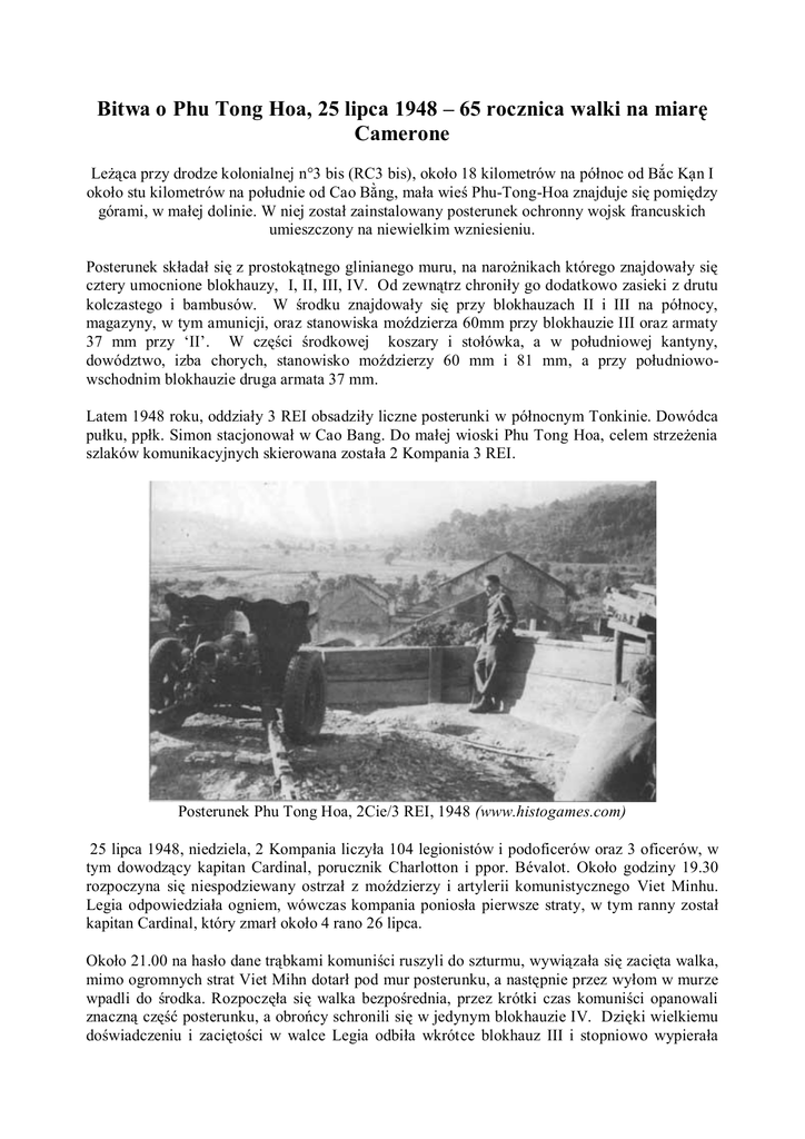 Bitwa o Phu Tong Hoa, 25 lipca 1948 – 65 rocznica walki na miarę Camerone Leżąca przy drodze kolonialnej n°3 bis (RC3 bis), około 18 kilometrów na północ od Bắc Kạn I około stu kilometrów na południe od Cao Bằng, mała wieś Phu-Tong-Hoa znajduje się pomiędzy górami, w małej dolinie. W niej został zainstalowany posterunek ochronny wojsk francuskich umieszczony na niewielkim wzniesieniu. Posterunek składał się z prostokątnego glinianego muru, na narożnikach którego znajdowały się cztery umocnione blokhauzy, I, II, III, IV. Od zewnątrz chroniły go dodatkowo zasieki z drutu kolczastego i bambusów. W środku znajdowały się przy blokhauzach II i III na północy, magazyny, w tym amunicji, oraz stanowiska moździerza 60mm przy blokhauzie III oraz armaty 37 mm przy ‘II’. W części środkowej koszary i stołówka, a w południowej kantyny, dowództwo, izba chorych, stanowisko moździerzy 60 mm i 81 mm, a przy południowowschodnim blokhauzie druga armata 37 mm. Latem 1948 roku, oddziały 3 REI obsadziły liczne posterunki w północnym Tonkinie. Dowódca pułku, ppłk. Simon stacjonował w Cao Bang. Do małej wioski Phu Tong Hoa, celem strzeżenia szlaków komunikacyjnych skierowana została 2 Kompania 3 REI. Posterunek Phu Tong Hoa, 2Cie/3 REI, 1948 (www.histogames.com) 25 lipca 1948, niedziela, 2 Kompania liczyła 104 legionistów i podoficerów oraz 3 oficerów, w tym dowodzący kapitan Cardinal, porucznik Charlotton i ppor. Bévalot. Około godziny 19.30 rozpoczyna się niespodziewany ostrzał z moździerzy i artylerii komunistycznego Viet Minhu. Legia odpowiedziała ogniem, wówczas kompania poniosła pierwsze straty, w tym ranny został kapitan Cardinal, który zmarł około 4 rano 26 lipca. Około 21.00 na hasło dane trąbkami komuniści ruszyli do szturmu, wywiązała się zacięta walka, mimo ogromnych strat Viet Mihn dotarł pod mur posterunku, a następnie przez wyłom w murze wpadli do środka. Rozpoczęła się walka bezpośrednia, przez krótki czas komuniści opanowali znaczną część posterunku, a obrońcy schronili się w jedynym blokhauzie IV. Dzięki wielkiemu doświadczeniu i zaciętości w walce Legia odbiła wkrótce blokhauz III i stopniowo wypierała atakujących. W trakcie tych starć śmiertelnie ranny został porucznik Charlotton. Około godziny 23. legioniści opanowali sytuację, a Wietnamczycy niespodziewanie ustąpili. Na terenie posterunku i w jego sąsiedztwie legioniści znaleźli ponad 40 zabitych komunistów. Rzeczywiste straty nie są znane, wiadomo, że w atak na posterunek było zaangażowanych około 5 tysięcy żołnierzy Viet Minhu. Dowodzenie kompania przejął jedyny ocalały oficer, ppor. Bevalot, oddział stracił 22 zabitych, a ponad 30 zostało rannych. Od rana obrońcy skupili się na wzmacnianiu umocnień posterunku i pogrzebach zabitych towarzyszy broni. Dzięki nawiązaniu łączności radiowej z garnizonem w Bac Kan wsparcia z powietrza udzieliły obrońcom dwa myśliwce Spitfire ostrzeliwując pobliskie wzgórza. Także 26 lipca obrońcy otrzymali zaopatrzenie zrzucone na spadochronach z transportowych Ju52. 27 lipca wylądował w pobliżu posterunku samolot zwiadowczy Storch, który podjął próbę ewakuacji najciężej rannych. Najważniejsza jednak dla obrońców była wiadomość, iż idzie im na pomoc odsiecz z Cao Bang na czele z dowódcą 3 REI, ppłk Simon bohater 13 DBLE z Bir Hakeim. Upragniona odsiecz dociera do Phu Tong Hoa wieczorem, około 19.00, była środa 28 lipca. Legia zwyciężyła! Pułkownik Simon oddając honory swoim legionistom powiedział: « Vous vous êtes montrés dignes de vos anciens du 3e Etranger ; la résistance héroïque du poste de Phu Tong Hoa s’inscrira parmi les grands faits d’armes de la Légion étrangère. Je vous en remercie » Bitwa o mały posterunek Phu Tong Hoa, męstwo legionistów i walka do końca, zwycięskiego końca, była jednym z kolejnych Camerone’ów Legii Cudzoziemskiej. W 1993 r., w 45 rocznicę bitwy została wydana pamiątkowa odznaka, zaprojektowana przez kapitana DURAND, produkcja FIA Lyon, wszystkie egzemplarze z numeracją rzymską. (Andrew Mitchell collection/Ireland) źródła tekstu i ilustracji http://www.histogames.com/HTML/chronologie/epoque_contemporaine/conflits_modernes/batai lle/phu-tong-hoa.php Krzysztof Schramm Sekcja Historyczna Stowarzyszenia Byłych Żołnierzy i Przyjaciół Legii Cudzoziemskiej w Polsce