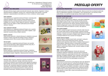 43-100 Tychy, ul. Budowlanych 75 (pasaż E.Leclerc) Tel. 791 324 123, [email protected] www.rajskimotyl.eu Facebook: Rajski Motyl PRZEGLĄD OFERTY PREZENTY DLA MALUSZKA PAKOWANIE PREZENTÓW Oferujemy Państwu bogaty wybór prezentów dla maluszka i jego rodziców. Oryginalne i ciekawe upominki zarówno na pępkowe i chrzciny, jak i z okazji pierwszego roczku dziecka. A wszystko wykonane z najwyższej jakości materiałów oraz w trosce o estetyczny i stylowy wygląd. Oferujemy pakowanie wszelkiego rodzaju prezentów. Można przynieść do nas zakupione podarunki, które my odpowiednio opakujemy i przyozdobimy lub też skomponować u nas stosowny zestaw podarunkowy, a my zajmiemy się jego oprawą. Każdy znajdzie coś dla siebie. Torty z pieluszek Torty wykonane są z oryginalnych pieluszek Pampers i zawierają wiele ciekawych dodatków, które na pewno zostaną wykorzystane w pielęgnacji dziecka, a samego maluszka na pewno ucieszą zabawki, znajdujące się w zestawie. Całość elegancko wykonana i opakowana. Będzie cieszyć oko i będzie w całości wykorzystany przez młodych rodziców i maluszka. KOSMETYKI NATURALNE Torty z pieluszek i ubranek Torty wykonane są z oryginalnych pieluszek Pampers oraz z wysokiej jakości ubranek dziecięcych. Elegancki torcik pięknie wygląda, a jego zawartość na pewno ucieszy młodych rodziców. Bukiety z ubranek Piękne bukiety wykonane z ubranek dziecięcych z dodatkiem sztucznych kwiatów to idealna wyprawka dla każdego malucha. Nietypowy i zaskakujący prezent, który na pewno zaskoczy obdarowanych. Tort na roczek Torcik wykonany z oryginalnych pieluszek Pampers oraz wysokiej jakości naczyń dla dziecka. Pięknie opakowana forma cieszy oko, a zawartość przyda się każdemu roczniakowi. Bukiet na roczek Bukiecik wykonany z oryginalnych pieluszek Pampers z dodatkiem sztucznych kwiatów umieszczony został w nocniku, który roczne dziecko powoli będzie oswajać. Oryginalny i zabawny prezent na Roczek. OLEJKI ETERYCZNE Naturalne olejki eteryczne i zapachowe stanowią niewidoczną, ale niezwykle ważną „dekorację” naszego codziennego otoczenia. Unosząca się w powietrzu woń stymuluje zmysły, pobudza do działania bądź uspokaja. W naszej ofercie mamy zarówno 100% naturalne olejki eteryczne, jak i kompozycje zapachowe stanowiące mieszaninę naturalnych i syntetycznych substancji zapachowych. Można je wykorzystywać do aromatyzacji powietrza w różnej postaci: do kominków ceramicznych, nawilżaczy powietrza, odkurzaczy itp. Naturalne mydła robione ręcznie Ręcznie robione mydła wykonane wyłącznie z naturalnych składników. Zawierają glicerynę roślinną, która w naturalny sposób utrzymuje odpowiednie nawilżenie skóry, a także starannie wyselekcjonowane ekstrakty z ziół leczniczych oraz roślinne substancje aktywne mające działanie pielęgnacyjne. Łączą w sobie elementy dekoracyjne i ozdobne z jednoczesnym aktywnym działaniem na skórę i cały organizm. Sole i pudry do kąpieli W solach i pudrach do kąpieli zastosowano naturalne olejki eteryczne oraz suszone płatki świeżo zerwanych kwiatów, mielonych owoców, suszonych i wonnych korzeni oraz odpowiednio dobranych ziół. Działają relaksująco i zalecane są osobom w każdym wieku. Dostępne na wagę, w ciekawych flakonach oraz w postaci kul musujących. Perełki i kawior do kąpieli Perełki do kąpieli w kształcie dużych kulek, zwierzątek i serduszek z całkowicie rozpuszczalną żelatynową otoczką, zawierają skondensowane zapachowe olejki roślinne o działaniu relaksacyjnym i natłuszczającym. Natomiast kawior to mikroperełki zawierające bogactwo minerałów i olejków roślinnych, który doskonale oczyszcza, ujędrnia i nawilża skórę. Relaksuje ciało i korzystnie wpływa na układ nerwowy po kąpieli Olejki i oliwki do kąpieli Olejki i oliwki do kąpieli pielęgnują i chronią całe ciało przed szkodliwymi wpływami środowiska, zanieczyszczeniem powietrza, zmianami temperatury, poprawiają ukrwienie skóry, wzmacniają ją i odżywiają. Pomagają rozładować stresy, relaksują i regenerują całe ciało. Olejki zawierają specjalne dodatki, które tworzą na skórze cieniutką warstewkę ochronną zapobiegając jej wysuszaniu. Żele pod prysznic Żele pod prysznic przeznaczone są do pielęgnacji ciała, jego odprężenia, relaksu oraz usuwania zmęczenia i wytworzenia dobrego nastroju w czasie oraz po kąpieli. Mają pozytywne działanie na skórę, ze względu na ich składniki w postaci olejków i ekstraktów z roślin oraz wyciągi z owoców. Dostępne są również peelingi żelowe z drobinami pumeksu wulkanicznego w postaci gęstych żeli oraz peelingi solne do twarzy i ciała wykonane na bazie oleju z oliwek oraz drobnoziarnistej soli z Morza Martwego. 43-100 Tychy, ul. Budowlanych 75 (pasaż E.Leclerc) Tel. 791 324 123, [email protected] www.rajskimotyl.eu Facebook: Rajski Motyl 43-100 Tychy, ul. Budowlanych 75 (pasaż E.Leclerc) Tel. 791 324 123, [email protected] www.rajskimotyl.eu Facebook: Rajski Motyl ŚWIECE KOSMETYKI NATURALNE Świece aromatyczne Oferujemy bogaty wybór aromatycznych świec, których zapach przenosi w magiczny świat zmysłowych doznań. Proponujemy świece rustykalne z eleganckimi zawieszkami, które są idealne na prezent, a także eleganckie świece zapachowe w różnym kształcie. Oferujemy zapachy owocowe, kawowe, herbaciane, kwiatowe oraz wiele innych. Balsamy do ciała Receptura balsamów oparta jest na bazie wysokiej jakości składników naturalnych m.in. masła shea (karité), masła kakaowego, masła kokosowego, olejku migdałowego, olejku z pestek winogron, oleju jojoba i oleju arganowego. To wyjątkowo cenne surowce do pielęgnacji skóry. Gwarantują natłuszczenie i nawilżenie skóry oraz jej głęboką regenerację. Świece dekoracyjne Oryginalnym prezentem będzie świeca w kształcie bukietu kwiatów albo kwiatków w doniczce. Nietypowy, elegancki prezent, który ucieszy każdeg