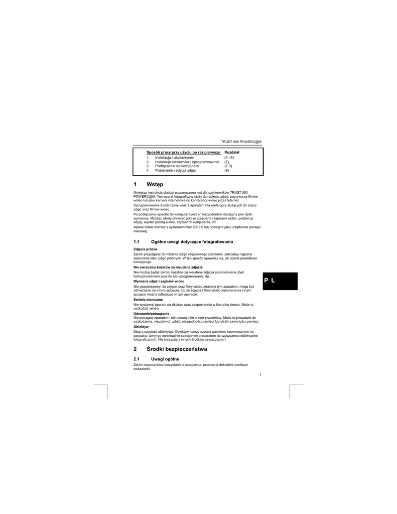 TRUST 550 POWERC@M Sposób pracy przy użyciu po raz pierwszy Instalacja i użytkowanie 1. Instalacja sterownika i oprogramowania 2. Podłączanie do komputera 3. Pobieranie i edycja zdjęć 4. 1 Rozdział (4 i 6) (7) (7.3) (9) Wstęp Niniejsza instrukcja obsługi przeznaczona jest dla użytkowników TRUST 550 POWERC@M. Ten aparat fotograficzny służy do robienia zdjęć, nagrywania filmów wideo lub jako kamera internetowa do konferencji wideo przez Internet. Oprogramowanie dostarczone wraz z aparatem ma wiele opcji służących do edycji zdjęć oraz filmów wideo. Po podłączeniu aparatu do komputera jest on bezpośrednio dostępny jako dysk wymienny. Możesz wtedy otwierać pliki ze zdjęciami i zapisami wideo, poddać je edycji, wysłać pocztą e-mail, zapisać w komputerze, itd. Aparat działa również z systemem Mac OS 9.0 lub nowszym jako urządzenie pamięci masowej. 1.1 Ogólne uwagi dotyczące fotografowania Zdjęcia próbne Zanim przystąpisz do robienia zdjęć wyjątkowego zdarzenia, zalecamy najpierw wykonanie kilku zdjęć próbnych. W ten sposób upewnisz się, że aparat prawidłowo funkcjonuje. Nie zwracamy kosztów za nieudane zdjęcia Nie można żądać zwrotu kosztów za nieudane zdjęcia spowodowane złym funkcjonowaniem aparatu lub oprogramowania, itp. P L Wymiana zdjęć i zapisów wideo Nie gwarantujemy, że zdjęcia oraz filmy wideo zrobione tym aparatem, mogą być odtwarzane na innym sprzęcie, lub że zdjęcia i filmy wideo wykonane na innym sprzęcie można odtwarzać w tym aparacie. Światło słoneczne Nie wystawiaj aparatu na dłuższy czas bezpośrednio w kierunku słońca. Może to uszkodzić sensor. Uderzanie/potrząsanie Nie potrząsaj aparatem i nie uderzaj nim o inne przedmioty. Może to prowadzić do uszkodzenia, nieudanych zdjęć, niezgodności pamięci lub utraty zawartości pamięci. Obiektyw Dbaj o czystość obiektywu. Obiektyw należy czyścić wacikiem kosmetycznym na patyczku. Umyj go ewentualnie specjalnym preparatem do czyszczenia obiektywów fotograficznych. Nie korzystaj z innych środków czyszczących. 2 2.1 Środki bezpieczeństwa Uwagi ogólne Zanim rozpoczniesz korzystanie z urządzenia, przeczytaj dokładnie poniższe wskazówki. 1 TRUST 550 POWERC@M - Aparat Trust 550 PowerC@m nie wymaga specjalnej konserwacji. Do czyszczenia aparatu korzystaj z delikatnej, wilgotnej ściereczki. - Przy czyszczeniu nie korzystaj z silnych środków, takich jak terpentyna. Mogą one zniszczyć materiał. - W żadnym przypadku nie zanurzaj urządzenia w cieczy. Jest to niebezpieczne i prowadzi do zniszczenia urządzenia. Nie używaj urządzenia w pobliżu wody. - Uważaj, żeby nic nie stało na przewodzie. Nie używaj urządzenia w miejscu, gdzie kabel może się zniszczyć lub zostać uszkodzony wskutek chodzenia po nim. - Nie naprawiaj urządzenia samodzielnie. Jeśli otworzysz urządzenie, możesz dotknąć elementów znajdujących się pod napięciem. - Urządzenie należy oddać do naprawy pracownikom serwisu w następujących okolicznościach: - Jeśli urządzenie wystawione było na deszcz, miało kontakt z wodą lub inną cieczą. 2.2 Baterie - Załączone baterie alkaliczne nie nadają się do ponownego naładowania. Nie próbuj ich ładować, ponieważ może prowadzić to do wybuchu. - Nigdy nie wrzucaj baterii do ognia. Baterie mogą wybuchnąć. - Nigdy nie przedziurawiaj baterii. - Przechowuj baterie poza zasięgiem małych dzieci. - W aparacie należy używać baterii alkalicznych AA lub akumulatorków NiMH AA (minimalnie 1800 mAh). - Kiedy baterie alkaliczne są wyczerpane, dowiedz się, gdzie w Twojej okolicy znajduje się punkt, gdzie można je oddawać. Wskazówka: Standardowe baterie NiCD AA nie nadają się do tego urządzenia. Wskazówka: Nie używaj starych baterii wraz z nowymi, ponieważ stare baterie mogą wyczerpać nowe. Wskazówka: Usuń baterie z aparatu, jeśli nie korzystasz z niego przez dłuższy czas. Oszczędzisz w ten sposób baterie. 3 Certyfikat Produkt spełnia główne wymogi oraz wszelkie odnośne postanowienia zawarte w obowiązujących normach europejskich. Deklaracja zgodności (DoC) znajduje się na stronie www.trust.com/13805/ce. 4 4.1 Baterie oraz pamięć Wkładanie oraz wyjmowanie baterii 1. Otwórz komorę baterii (13, rysunek 2) znajdującą się z boku aparatu przesuwając pokrywę komory delikatnie w dół, a następnie podważając ją. 2. Włóż dwie baterie alkaliczne AA (dostarczone wraz z aparatem) do aparatu zwracając uwagę na oznaczenia na wewnętrznej stronie pokrywy komory. 3. Zamknij komorę baterii przesuwając pokrywę na swoje miejsce. 4. Aparat Trust 550 PowerC@m jest teraz gotowy do użytku. 2 TRUST 550 POWERC@M Wskazówka: Umieszczenie baterii w niewłaściwy sposób może spowodować uszkodzenie aparatu. W takim wypadku przepada gwarancja. Wskazówka: Standardowe baterie NiCd AA nie nadają się do tego urządzenia. Korzystaj z akumulatorków NiMH AA (minimalnie 1800 mAh). Wskazówka: Baterie nie są ładowane, gdy aparat podłączony jest do portu USB komputera. 4.2 Wkładanie oraz usuwanie karty pamięci Aparat Trust 550 PowerC@m posiada 8 MB pamięci roboczej (SDRAM). Korzystając z karty pamięci masz pewność, że zdjęcia oraz filmy wideo nie zostaną usunięte podczas wymiany baterii. Pamięć robocza musi być zasilana, w innym wypadku zdjęcia oraz filmy wideo zostaną usunięte. Jeśli nie korzystasz z aparatu przez dłuższy czas, zalecamy przeniesienie zdjęć oraz filmów wideo z pamięci aparatu do komputera. Dzięki temu nie utracisz zdjęć ani filmów wideo. Pamięć roboczą można rozszerzyć za pomocą karty pamięci SD lub MMC (nie dostarczona z aparatem). Zaletą karty pamięci jest to, że zdjęcia oraz filmy wideo nie zostaną usunięte, gdy baterie się wyczerpią lub podczas wymiany baterii. Zastosuj się do poleceń podanych poniżej, aby włożyć opcjonalną kartę pamięci SD lub MMC do aparatu. 1. Otwórz pokrywę komory baterii przesuwa