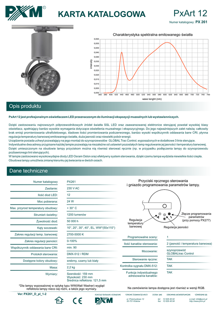 R PxArt 12 KARTA KATALOGOWA Numer katalogowy: PX 261 intensity Charakterystyka spektralna emitowanego światła Opis produktu PxArt 12 jest profesjonalnym oświetlaczem LED przeznaczonym do iluminacji ekspozycji muzealnych lub wystawienniczych. Dzięki zastosowaniu najnowszych półprzewodnikowych źródeł światła SSL LED oraz zaawansowanej elektronice sterującej powstał wysokiej klasy oświetlacz, spełniający bardzo wysokie wymagania dotyczące oświetlenia muzealnego i ekspozycyjnego. Do jego najważniejszych zalet należą: całkowity brak emisji promieniowania ultrafioletowego, śladowe ilości promieniowania podczerwonego, bardzo wysoki współczynnik oddawania barw CRI, płynna regulacja temperatury barwowej emitowanego światła, duża jasność oraz niewielki pobór energii. Urządzenie posiada uchwyt pozwalający na jego montaż do szynoprzewodów GLOBAL Trac Control, wyposażonych w dodatkowe 3 linie sterujące. Indywidualne dwa adresy przypisane każdej lampie pozwalają na niezależne od ustawień pozostałych lamp regulowanie jej jasności i temperatury barwowej. Dzięki umieszczonym na obudowie lampy przyciskom można nią również sterować ręcznie (np. w przypadku podłączenia lampy do szynoprzewodu pozbawionego linii sterujących). W lampie zastosowano wysokowydajne diody LED Osram Oslon oraz efektywny system sterowania, dzięki czemu lampa wydziela niewielkie ilości ciepła. Obudowa lampy umożliwia zmianę kierunku jej świecenia w dwóch osiach. Dane techniczne Numer katalogowy Zasilanie: 230 V AC Ilość diod LED: 12 Moc pobierana: 24 W Max. przyrost temperatury obudowy: Strumień świetlny: Przyciski ręcznego sterowania i gniazdo programowania parametrów lampy. PX261 + 30° C Żywotność diod: 50 000 h Kąty soczewek: 10°, 20°, 30°, 40°, EL, WW*(50x110°) Zakres regulacji temp. barwowej: Złącze programowania parametrów (przy pomocy PX277) 1200 lumenów Regulacja temperatury barwowej Regulacja jasności 2700-5000 K 1 Programowalne sceny: Zakres regulacji jasności: 0-100% Współczynnik oddawania barw CRI: min. 90 2 (jasność i temperatura barwowa) Ilość kanałów sterowania: szynoprzewód GLOBALtrac Control Mocowanie: Protokół sterowania: Dostępne kolory obudowy: Masa: Wymiary: DMX-512 / RDM Sterowanie ręczne: TAK Kontrolka sygnału DMX-512: TAK Funkcja indywidualnego adresowania kanałów: TAK srebrny, czarny lub biały 2,2 kg Szerokość: 159 mm Wysokość: 230 mm Średnica reflektora: 121,5 mm *Dla lampy wyposażonej w optykę typu WW(Wall Washer) wygląd reflektora lampy nieco się różni, a także jego wymiary. Ver: PX261_D_pl_1-2 Konsole teatralne i estradowE Na zamówienie lampa dostępna jest również w wersji RGB. Cyfrowe ściemniacze mocy ul. Przemysłowa 12 30-701 Kraków SYSTEM dmx Sterowniki ARCHITEKTONICZNE tel: 12 626 46 92 fax: 12 626 46 94 OŚWIETLENIE LED e-mail: [email protected] http://www.pxm.pl R PX 261 Rysunek techniczny Schemat podłączenia 1 3 DMX+ GND 4 5 1 szynoprzewód 3-fazowy DMX GLOBALtrac control 2 końcówka zasilająca 3 przewód zasilania 4 przewód DMX (2 żyły w ekranie) 5 adapter GLOBALtrac GAC100 DMX- 230 207 (wersja WW-wallwasher) 56,5 2 Ø121,5 159 Wymiary w milimetrach Kąty rozsyłu strumienia świetlnego Parametry świetlne: Kąt świecenia 20° ø1,05m ø0,35m 3m ø0,7m ø0,35m 980 lx 450 lx ø1,06m ø1,46m 4700 lx ø0,53m 1m 1m 1m ø0,18m 9200 lx 2m 2m 19300 lx ø2,19m Konsole teatralne i estradowE Cyfrowe ściemniacze mocy ul. Przemysłowa 12 30-701 Kraków 1820 lx ø0,73m 1m 2350 lx ø1,59m 2m 5050 lx 220 lx 480 lx 1070 lx ø0,53m 40° 3m 2350 lx 30° 2m 10° SYSTEM dmx Sterowniki ARCHITEKTONICZNE tel: 12 626 46 92 fax: 12 626 46 94 OŚWIETLENIE LED e-mail: [email protected] http://www.pxm.pl