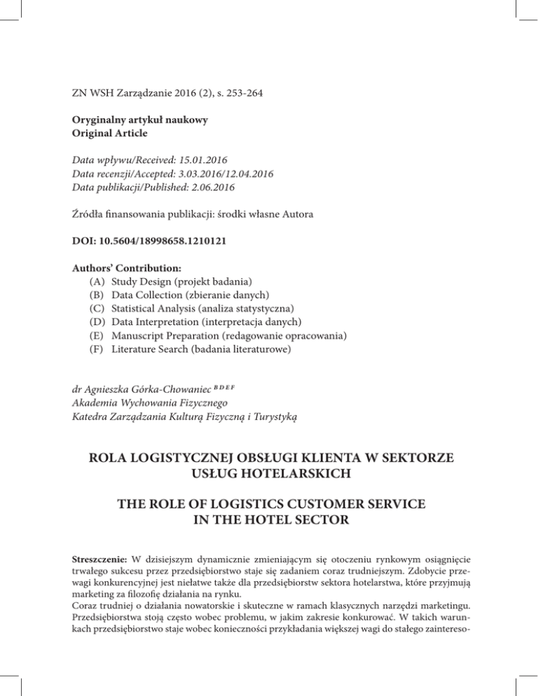 ZN WSH Zarządzanie 2016 (2), s. 253-264 Oryginalny artykuł naukowy Original Article Data wpływu/Received: 15.01.2016 Data recenzji/Accepted: 3.03.2016/12.04.2016 Data publikacji/Published: 2.06.2016 Źródła finansowania publikacji: środki własne Autora DOI: 10.5604/18998658.1210121 Authors’ Contribution: (A) Study Design (projekt badania) (B) Data Collection (zbieranie danych) (C) Statistical Analysis (analiza statystyczna) (D) Data Interpretation (interpretacja danych) (E) Manuscript Preparation (redagowanie opracowania) (F) Literature Search (badania literaturowe) dr Agnieszka Górka-Chowaniec B D E F Akademia Wychowania Fizycznego Katedra Zarządzania Kulturą Fizyczną i Turystyką ROLA LOGISTYCZNEJ OBSŁUGI KLIENTA W SEKTORZE USŁUG HOTELARSKICH THE ROLE OF LOGISTICS CUSTOMER SERVICE IN THE HOTEL SECTOR Streszczenie: W dzisiejszym dynamicznie zmieniającym się otoczeniu rynkowym osiągnięcie trwałego sukcesu przez przedsiębiorstwo staje się zadaniem coraz trudniejszym. Zdobycie przewagi konkurencyjnej jest niełatwe także dla przedsiębiorstw sektora hotelarstwa, które przyjmują marketing za filozofię działania na rynku. Coraz trudniej o działania nowatorskie i skuteczne w ramach klasycznych narzędzi marketingu. Przedsiębiorstwa stoją często wobec problemu, w jakim zakresie konkurować. W takich warunkach przedsiębiorstwo staje wobec konieczności przykładania większej wagi do stałego zaintereso- 254 Zeszyty Naukowe Wyższej Szkoły Humanitas. Zarządzanie wania poziomem satysfakcji swoich klientów. Nawiązanie trwałego dialogu z klientem, precyzyjne definiowanie jego oczekiwań może stać się sposobem na wzmocnienie pozycji konkurencyjnej przedsiębiorstwa na rynku. W artykule zwrócono uwagę na istotną rolę oraz znaczenie obsługi klienta oraz wpływu, jakie wywierają one na poziom konkurencyjności poszczególnych podmiotów w sektorze usług hotelarskich. Uwzględniając literaturę źródłową, autorka artykułu stwierdza, iż implementacja na odpowiednim poziomie logistycznej obsługi klienta odgrywa istotną rolę w poziomie jakości świadczonych usług hotelarskich, co przekłada się na osiąganie przewagi konkurencyjnej podmiotów w analizowanej branży. Słowa kluczowe: usługi, sektor hotelarstwa, logistyczna obsługa klienta Abstract: In present dynamically changing market environment, succeeding permanently becomes more and more challenging for an enterprise. Gaining competitive advantage is also harder for companies of hotel sector, which treat marketing as a philosophy of market activity. More difficult become innovative and effective actions within classical marketing tools. Enterprises frequently face the problem in which area complete. In such conditions an enterprise is made to pay more attention to permanent interest in satisfaction level of its customers. Establishing stable dialog with a client, precise defining his/her needs may become a way to strengthen the company’s competitive position on the market. The article highlights the crucial role of customer service and its influence on particular parties competitive level in hotel services sector. Analysing the source bibliography the article’s author states that implementing at the right stage the logistics customer service is significant for the quality level of hotel service, which reflects gaining competitive advantage by parties in the analysed branch. Keywords: service, hotel sector, logistics customer service Wstęp Współczesne otoczenie, w którym funkcjonują obecnie podmioty gospodarcze sektora hotelarstwa, stawia przed nimi nowe wyzwania. Współczesny rynek podlega ciągłym przemianom, szczególnie ze względu na otoczenie ekonomiczne, prawne, społeczne i informacyjne. Obecnie sektor usług charakteryzuje wysoka ekspansja, która utożsamiana jest w szczególności z wysokim popytem konsumpcyjnym. Sytuacja taka generuje doskonałe podłoże do osiągania przez poszczególne podmioty wysokich zysków, które warunkują dalszy rozwój sektora usług hotelarskich. Marketing – utożsamiany przez Ph. Kotlera z procesem społecznym – umożliwia ponowną refleksję nad tym procesem, i to nie tylko w kontekście miejsca w nim rynku jako kategorii ekonomicznej, ale też w kontekście miejsca w nim usług z wszelkimi tego następstwami. Także określenie „menedżerski” wywołuje wiele odniesień, dotyczy bowiem sposobu i zakresu działania, zasobów niezbędnych do tego działania, a także oczekiwanych efektów działania. Istotne stają się więc aspekty przedmiotowe i podmiotowe procesu społecznego. Wiele implikacji niesie także jego temporalny charakter, zwłaszcza w sferze usług hotelarskich. Nadrzędnym celem obsługi klienta jest jego pozyskanie, zaspokojenie ujawnionych przez niego potrzeb Rola logistycznej obsługi klienta w sektorze usług hotelarskich 255 oraz spowodowanie z uwzględnieniem wysokiej jakości świadczonych usług jego powrotów. Zadowolony klient staje się nic niekosztującym przekazem reklamowym świadczonych usług podmiotów sektora hotelarstwa. W artykule zwrócono uwagę na istotną rolę oraz znaczenie obsługi klienta oraz wpływu, jaki wywiera na poziom konkurencyjności w sektorze usług hotelarskich. Z uwzględnianiem literatury źródłowej autorka artykułu stwierdza, iż implementacja na odpowiednim poziomie logistycznej obsługi klienta odgrywa istotną rolę w poziomie jakości świadczonych usług hotelarskich, co przekłada się na osiąganie przewagi konkurencyjnej podmiotów w analizowanej branży. 1. Systemowe uwarunkowania rozwoju usług Twórcą definicji „usługa”, akceptowanej przez American Marketing Association, jest W.J. Santon, określający ją jako odrębnie występującą działalność, dostarczającą określonych korzyści, które nie są koniecznie związane ze sprzedażą produktów lub innych usług1. Uwzględniając różnorodność kryteriów wykorzystywanych przy definiowaniu usł