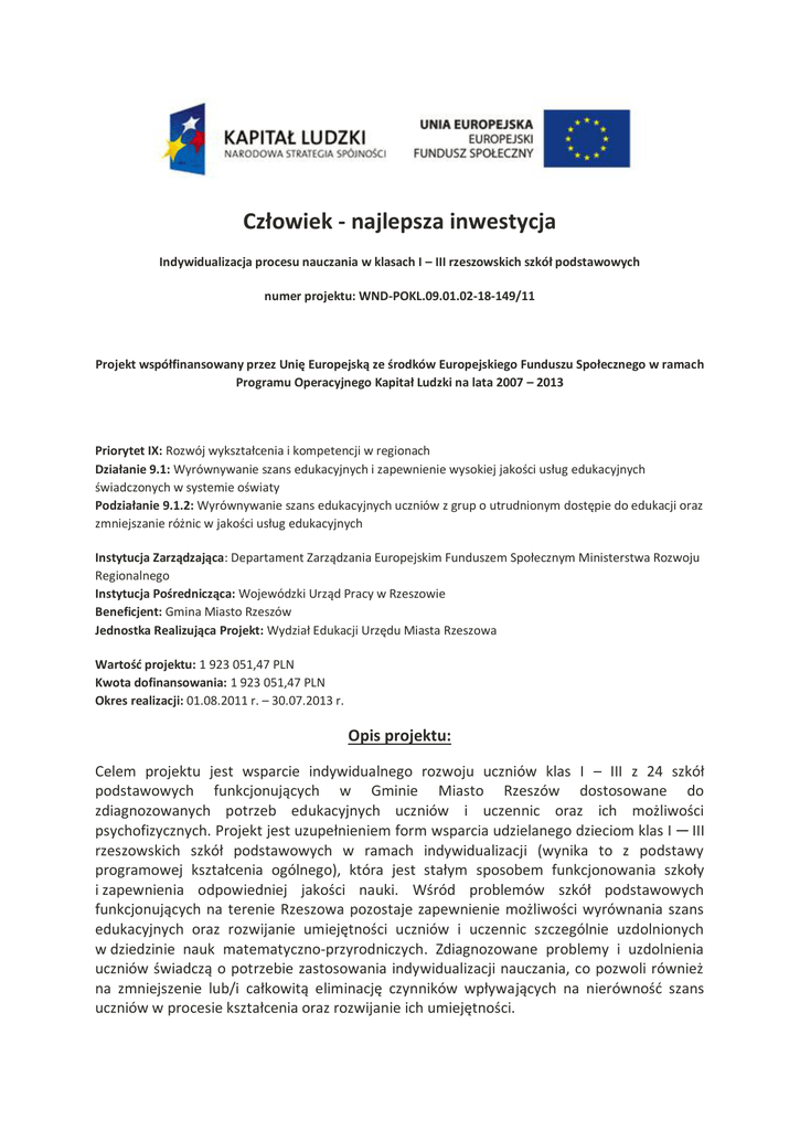Człowiek - najlepsza inwestycja Indywidualizacja procesu nauczania w klasach I – III rzeszowskich szkół podstawowych numer projektu: WND-POKL.09.01.02-18-149/11 Projekt współfinansowany przez Unię Europejską ze środków Europejskiego Funduszu Społecznego w ramach Programu Operacyjnego Kapitał Ludzki na lata 2007 – 2013 Priorytet IX: Rozwój wykształcenia i kompetencji w regionach Działanie 9.1: Wyrównywanie szans edukacyjnych i zapewnienie wysokiej jakości usług edukacyjnych świadczonych w systemie oświaty Podziałanie 9.1.2: Wyrównywanie szans edukacyjnych uczniów z grup o utrudnionym dostępie do edukacji oraz zmniejszanie różnic w jakości usług edukacyjnych Instytucja Zarządzająca: Departament Zarządzania Europejskim Funduszem Społecznym Ministerstwa Rozwoju Regionalnego Instytucja Pośrednicząca: Wojewódzki Urząd Pracy w Rzeszowie Beneficjent: Gmina Miasto Rzeszów Jednostka Realizująca Projekt: Wydział Edukacji Urzędu Miasta Rzeszowa Wartość projektu: 1 923 051,47 PLN Kwota dofinansowania: 1 923 051,47 PLN Okres realizacji: 01.08.2011 r. – 30.07.2013 r. Opis projektu: Celem projektu jest wsparcie indywidualnego rozwoju uczniów klas I – III z 24 szkół podstawowych funkcjonujących w Gminie Miasto Rzeszów dostosowane do zdiagnozowanych potrzeb edukacyjnych uczniów i uczennic oraz ich możliwości psychofizycznych. Projekt jest uzupełnieniem form wsparcia udzielanego dzieciom klas I ─ III rzeszowskich szkół podstawowych w ramach indywidualizacji (wynika to z podstawy programowej kształcenia ogólnego), która jest stałym sposobem funkcjonowania szkoły i zapewnienia odpowiedniej jakości nauki. Wśród problemów szkół podstawowych funkcjonujących na terenie Rzeszowa pozostaje zapewnienie możliwości wyrównania szans edukacyjnych oraz rozwijanie umiejętności uczniów i uczennic szczególnie uzdolnionych w dziedzinie nauk matematyczno-przyrodniczych. Zdiagnozowane problemy i uzdolnienia uczniów świadczą o potrzebie zastosowania indywidualizacji nauczania, co pozwoli również na zmniejszenie lub/i całkowitą eliminację czynników wpływających na nierówność szans uczniów w procesie kształcenia oraz rozwijanie ich umiejętności. Zakres rzeczowy projektu: Projekt obejmuje: 1. Przeprowadzenie następujących rodzajów zajęć dla uczniów klas I – III: a) zajęcia dla dzieci z trudnościami w czytaniu i pisaniu, w tym także zagrożonych dysleksją, b) zajęcia dla dzieci z trudnościami w zdobywaniu umiejętności matematycznych, c) gimnastyka korekcyjna dla dzieci z wadami postawy, d) zajęcia socjoterapeutyczne i psychoedukacyjne dla dzieci z zaburzeniami komunikacji społecznej, e) zajęcia logopedyczne dla dzieci z zaburzeniami rozwoju mowy, f) zajęcia rozwijające zainteresowania uczniów szczególnie uzdolnionych w dziedzinie nauk matematyczno-przyrodniczych. 2. Doposażenie bazy dydaktycznej szkół podstawowych w materiały dydaktyczne oraz specjalistyczny sprzęt niezbędne do realizacji zaplanowanych zajęć dodatkowych. Efekty realizacji projektu: Realizacja wyżej wymienionych działań przyczyni się do: 1. Poprawy umiejętności płynnego czytania, czytania ze zrozumieniem i poprawnego pisania. 2. Poprawy sprawności rachunkowej oraz umiejętności logicznego myślenia oraz rozwijania zdolności uczniów szczególnie uzdolnionych w dziedzinie nauk matematycznoprzyrodniczych. 3. Rozwijania umiejętności radzenia sobie z uczuciami i stresem oraz asertywności. 4. Zwiększenia aktywności ruchowej oraz wyrobienia nawyków zachowywania prawidłowej postawy ciała. 5. Zniwelowania lub/i wyeliminowania wad wymowy uczniów. Stan realizacji projektu: ROK 2011 W dniu 28 lipca Gmina Miasto Rzeszów złożyła wniosek o dofinansowanie projektu w Wojewódzkim Urzędzie Pracy w Rzeszowie. W dniu 3 sierpnia Wojewódzki Urząd Pracy w Rzeszowie podjął decyzję o przyznaniu dofinansowania projektu ze środków Unii Europejskiej w ramach Europejskiego Funduszu Społecznego. W dniu 21 września podpisano umowę o dofinansowanie projektu pomiędzy Wojewódzkim Urzędem Pracy w Rzeszowie a Gminą Miasto Rzeszów. We wrześniu w szkołach podstawowych biorących udział w projekcie została przeprowadzona diagnoza uczniów uczęszczających w roku szkolnym do klas I oraz zostały zebrane informacje, czy uczniowie zdiagnozowani w 2010 roku potrzebują jeszcze wsparcia. Diagnoza została przeprowadzona przez zespół nauczycieli odpowiedzialnych za opracowanie i wdrożenie działań ukierunkowanych na indywidualizację procesu nauczania i wychowania uczniów klas I – III powołany przez dyrektora każdej z 24 szkół podstawowych. Zarządzeniem Nr VI/335/2011 Prezydenta Miasta Rzeszowa z dnia 12 października 2011 r. został ustalony Regulamin uczestnictwa w projekcie. 28 października zostało wszczęte postępowanie przetargowe na wyłonienie wykonawców do przeprowadzenia zajęć dodatkowych, pozalekcyjnych, wspierających indywidualizację procesu dydaktycznego uczniów w 24 rzeszowskich szkołach podstawowych. W listopadzie została zakończona rekrutacja uczniów i uczennic klas I – III szkół podstawowych biorących udział w projekcie. Zespół nauczycieli z każdej szkoły podstawowej, powołany przez dyrektora, zgodnie z Regulaminem uczestnictwa w projekcie, utworzył listę podstawową i rezerwową uczestników projektu. 30 listopada został ogłoszony przetarg na dostawę pomocy dydaktycznych niezbędnych do prowadzenia zajęć dodatkowych realizowanych w ramach projektu. 1 grudnia został rozstrzygnięty przetarg na realizację zajęć dodatkowych. Wyłoniono firmę NZOZ PODKARPACKIE Centrum Logopedyczne ,,GADUŁA” S.C. do przeprowadzenia zajęć dla dzieci z trudnościami w czytaniu i pisaniu, w tym także zagrożonych dysleksją; zajęć dla dzieci z trudnościami w zdobywaniu podstawowych umiejętności matematycznych, zajęć logopedycznych dla dzieci z zaburzeniami rozwoju mowy oraz firmę Fund