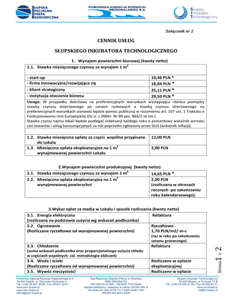 Załącznik nr 2 CENNIK USŁUG SŁUPSKIEGO INKUBATORA TECHNOLOGICZNEGO 1. Wynajem powierzchni biurowej (kwoty netto) 1.1. Stawka miesięcznego czynszu za wynajem 1 m2 - start-up - firma innowacyjna/rozwijająca się 10,46 PLN * 18,84 PLN * - klient strategiczny - instytucja otoczenia biznesu 25,11 PLN * 29,50 PLN * Uwaga: W przypadku dzierżawy na preferencyjnych warunkach występująca różnica pomiędzy stawką czynszu dzierżawnego po cenach rynkowych a stawką czynszu dzierżawnego na preferencyjnych warunkach stanowić będzie pomoc publiczną w rozumieniu art. 107 ust. 1 Traktatu o Funkcjonowaniu Unii Europejskiej (Dz.U. z 2004r. Nr 90 poz. 864/2 ze zm.) Stawka czynsz najmu lokali będzie podlegać indeksacji każdego roku o procentowy wskaźnik wzrostu cen towarów i usług konsumpcyjnych za rok poprzedni ogłoszony przez GUS (wskaźnik inflacji). 1.2. Stawka miesięczna opłaty za części wspólne przypisane do Lokalu 1.3. Miesięczna opłata eksploatacyjna na 1 m2 wynajmowanej powierzchni Lokalu 12,00 PLN 2,00 PLN 2.Wynajem powierzchni produkcyjnej (kwoty netto) 2.1. Stawka miesięcznego czynszu za wynajem 1 m2 14,65 PLN * 2.2. Miesięczna opłata eksploatacyjna na 1 m2 2,00 PLN wynajmowanej powierzchni (rozliczana w okresach rocznych -po zakończeniu roku kalendarzowego). 3.Wykaz opłat za media w Lokalu i sposób rozliczania (kwoty netto) 3.1. Energia elektryczna Refaktura (rozliczana na podstawie zużycia wg wskazań podlicznika) 3.2. Ogrzewanie Ryczałtowo (Rozliczane ryczałtowo od wynajmowanej powierzchni) 1,70 PLN/m2/ m-c Refaktura (suma wskazań podlicznika oraz proporcjonalnego zużycia chłodu w częściach wspólnych- zał. metodologia obliczeń) 3.4. Woda i ścieki (Rozliczane ryczałtowo od wynajmowanej powierzchni) 3.5. Wywóz nieczystości Pomorska Agencja Rozwoju Regionalnego S.A. 76-200 Słupsk, ul. Obrońców Wybrzeża 2 Tel. (+48) 59 841 28 92 / Fax 59 841 32 61 www.parr.slupsk.pl www.sse.slupsk.pl [email protected] Sąd Rejonowy Gdańsk-Północ w Gdańsku KRS 0000052733 NIP 839 00 29 569 – REGON 770719284 Kapitał zakładowy, wpłacony w całości 28 834 600 zł Nr konta 30 1240 3770 1111 0000 4068 1180 PN-EN ISO 9001:2009 Rozliczane w opłacie eksploatacyjnej Rozliczane w opłacie Słupski Inkubator Technologiczny 76-200 Słupsk, ul. Portowa 13 B Tel. (+48) 59 846 81 00 / Fax 59 846 81 01 www.sit.slupsk.pl [email protected] Strona 3.3. Chłodzenie 1z2 (raz w roku po zakończeniu sezonu grzewczego) (Rozliczane ryczałtowo od wynajmowanej powierzchni) 4.1. 4.2. 4.3. 4.4. 4.Opłaty dodatkowe (kwoty netto) Pilot do bramy wjazdowej Karta dostępu Klucze do pokoju Wykupienie stałego miejsca parkingowego eksploatacyjnej 150 ,00 PLN 20,00 PLN 10,00 PLN 80,00 PLN /m-c 5.Usługi teleinformatyczne (kwoty netto) 5.1. Opłata za łącze do internetu za 1Mbit /s symetrycznie 70,00 PLN /m-c 5.2. Abonament telefoniczny 35,00 PLN/m-c 5.3. Połączenia lokalne 0,07 PLN /min 5.4. Połączenia międzystrefowe 0,07 PLN/min 5.5. Połączenia do sieci komórkowych (Plus, Orange, T0,24 PLN/min mobile) 5.6. Połączenia do sieci komórkowych Play 0,37 PLN/min. 5.7. Wykorzystanie zasobów serwerowni - wstawienie urządzeń do szafy RACK (6U) 100,00 PLN/m-c - wstawienie szafy RACK do serwerowni (do 15U) 100,00 PLN/m-c - opłata instalacyjna – każdorazowo określana w zależności od zakresu koniecznych prac. 6.Wirtualne Biuro (kwoty netto) 6.1. Udostępnienie przedsiębiorcy dla potrzeb prowadzonej przez niego działalności gospodarczej adresu siedziby oraz adresu do 150,00 PLN/m-c korespondencji 7.Wynajem biurka na godziny (kwoty netto) Rozwiązanie dla ludzi wolnych zawodów i innych osób potrzebujących biurka do pracy w określonych przez siebie dniach i godzinach. 7.1 Wynajem biurka na 3h/m-c Strona * Stawka czynsz najmu podlega corocznej indeksacji od pierwszego dnia miesiąca następującego po miesiącu w którym nastąpi ogłoszenie poziomu Wskaźnika cen towarów i usług konsumpcyjnych (pot. inflacja). 2z2 7.2 Wynajem biurka na 5h/m-c 7.3 Wynajem biurka na 10h/m-c 7.4 Wynajem biurka na 15h/m-c 7.5 Wynajem biurka na 20/m-c 15,00 PLN 25,00 PLN 50,00 PLN 75,00 PLN 100 PLN Pomorska Agencja Rozwoju Regionalnego S.A. 76-200 Słupsk, ul. Obrońców Wybrzeża 2 Tel. (+48) 59 841 28 92 / Fax 59 841 32 61 www.parr.slupsk.pl www.sse.slupsk.pl [email protected] Sąd Rejonowy Gdańsk-Północ w Gdańsku KRS 0000052733 NIP 839 00 29 569 – REGON 770719284 Kapitał zakładowy, wpłacony w całości 28 834 600 zł Nr konta 30 1240 3770 1111 0000 4068 1180 PN-EN ISO 9001:2009 Słupski Inkubator Technologiczny 76-200 Słupsk, ul. Portowa 13 B Tel. (+48) 59 846 81 00 / Fax 59 846 81 01 www.sit.slupsk.pl [email protected]