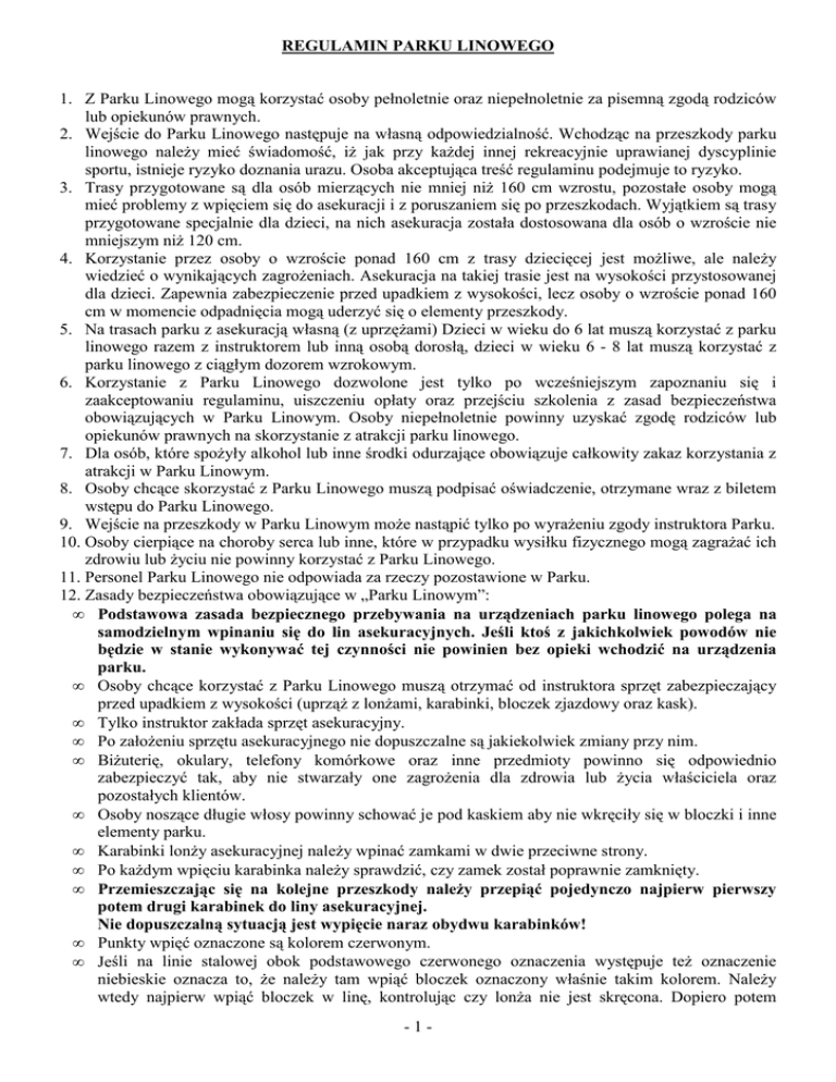 REGULAMIN PARKU LINOWEGO 1. Z Parku Linowego mogą korzystać osoby pełnoletnie oraz niepełnoletnie za pisemną zgodą rodziców lub opiekunów prawnych. 2. Wejście do Parku Linowego następuje na własną odpowiedzialność. Wchodząc na przeszkody parku linowego należy mieć świadomość, iż jak przy każdej innej rekreacyjnie uprawianej dyscyplinie sportu, istnieje ryzyko doznania urazu. Osoba akceptująca treść regulaminu podejmuje to ryzyko. 3. Trasy przygotowane są dla osób mierzących nie mniej niż 160 cm wzrostu, pozostałe osoby mogą mieć problemy z wpięciem się do asekuracji i z poruszaniem się po przeszkodach. Wyjątkiem są trasy przygotowane specjalnie dla dzieci, na nich asekuracja została dostosowana dla osób o wzroście nie mniejszym niż 120 cm. 4. Korzystanie przez osoby o wzroście ponad 160 cm z trasy dziecięcej jest możliwe, ale należy wiedzieć o wynikających zagrożeniach. Asekuracja na takiej trasie jest na wysokości przystosowanej dla dzieci. Zapewnia zabezpieczenie przed upadkiem z wysokości, lecz osoby o wzroście ponad 160 cm w momencie odpadnięcia mogą uderzyć się o elementy przeszkody. 5. Na trasach parku z asekuracją własną (z uprzężami) Dzieci w wieku do 6 lat muszą korzystać z parku linowego razem z instruktorem lub inną osobą dorosłą, dzieci w wieku 6 - 8 lat muszą korzystać z parku linowego z ciągłym dozorem wzrokowym. 6. Korzystanie z Parku Linowego dozwolone jest tylko po wcześniejszym zapoznaniu się i zaakceptowaniu regulaminu, uiszczeniu opłaty oraz przejściu szkolenia z zasad bezpieczeństwa obowiązujących w Parku Linowym. Osoby niepełnoletnie powinny uzyskać zgodę rodziców lub opiekunów prawnych na skorzystanie z atrakcji parku linowego. 7. Dla osób, które spożyły alkohol lub inne środki odurzające obowiązuje całkowity zakaz korzystania z atrakcji w Parku Linowym. 8. Osoby chcące skorzystać z Parku Linowego muszą podpisać oświadczenie, otrzymane wraz z biletem wstępu do Parku Linowego. 9. Wejście na przeszkody w Parku Linowym może nastąpić tylko po wyrażeniu zgody instruktora Parku. 10. Osoby cierpiące na choroby serca lub inne, które w przypadku wysiłku fizycznego mogą zagrażać ich zdrowiu lub życiu nie powinny korzystać z Parku Linowego. 11. Personel Parku Linowego nie odpowiada za rzeczy pozostawione w Parku. 12. Zasady bezpieczeństwa obowiązujące w „Parku Linowym”: • Podstawowa zasada bezpiecznego przebywania na urządzeniach parku linowego polega na samodzielnym wpinaniu się do lin asekuracyjnych. Jeśli ktoś z jakichkolwiek powodów nie będzie w stanie wykonywać tej czynności nie powinien bez opieki wchodzić na urządzenia parku. • Osoby chcące korzystać z Parku Linowego muszą otrzymać od instruktora sprzęt zabezpieczający przed upadkiem z wysokości (uprząż z lonżami, karabinki, bloczek zjazdowy oraz kask). • Tylko instruktor zakłada sprzęt asekuracyjny. • Po założeniu sprzętu asekuracyjnego nie dopuszczalne są jakiekolwiek zmiany przy nim. • Biżuterię, okulary, telefony komórkowe oraz inne przedmioty powinno się odpowiednio zabezpieczyć tak, aby nie stwarzały one zagrożenia dla zdrowia lub życia właściciela oraz pozostałych klientów. • Osoby noszące długie włosy powinny schować je pod kaskiem aby nie wkręciły się w bloczki i inne elementy parku. • Karabinki lonży asekuracyjnej należy wpinać zamkami w dwie przeciwne strony. • Po każdym wpięciu karabinka należy sprawdzić, czy zamek został poprawnie zamknięty. • Przemieszczając się na kolejne przeszkody należy przepiąć pojedynczo najpierw pierwszy potem drugi karabinek do liny asekuracyjnej. Nie dopuszczalną sytuacją jest wypięcie naraz obydwu karabinków! • Punkty wpięć oznaczone są kolorem czerwonym. • Jeśli na linie stalowej obok podstawowego czerwonego oznaczenia występuje też oznaczenie niebieskie oznacza to, że należy tam wpiąć bloczek oznaczony właśnie takim kolorem. Należy wtedy najpierw wpiąć bloczek w linę, kontrolując czy lonża nie jest skręcona. Dopiero potem -1- • • • • • • • • • • • • • • • • • • kolejno przepiąć karabinki z lonży asekuracyjnej tak aby na linie zjazdowej w pierwszej kolejności znajdował się bloczek zjazdowy. Kolejność jest oznaczona kolorami. Podczas zjazdu na bloczku należy trzymać się tylko lonży bloczka. Chwytanie w czasie zjazdu stalowej liny grozi poważnym skaleczeniem! Jedyną dopuszczalną pozycją zjazdu jest pozycja „siedząca”. Podczas dojeżdżania do podestu należy unieść nogi i lekko je zgiąć w kolanach tak aby zamortyzować ewentualne uderzenie o materac. W momencie zatrzymania należy chwycić ręką dodatkowej liny lub pętli aby nie odjechać od podestu. Nie wolno łapać się liny za bloczkiem aby powracający bloczek nie najechał nam na rękę. Uwaga!!! W ostatniej fazie zjazdu nie wyciągać przed siebie rąk w kierunku materaca. Jeśli nie udało nam się zatrzymać na podeście i zjechaliśmy z powrotem. Należy zaczekać aż się zatrzymamy, a następnie chwytając liny nośnej dociągnąć do podestu ustawiając się głową w kierunku jazdy. Po przejechaniu na linie powinno się zachować następującą kolejność przepinania sprzętu asekuracyjnego; najpierw wypinamy jeden karabinek i wpinamy go do pętli oplecionej wokół drzewa, następnie wypinamy bloczek i wpinamy go do ucha u boku uprzęży, jako ostatni wypinamy karabinek będący jeszcze na stalowej linie zjazdowej i wpinamy go do pętli asekuracyjnej. Podczas przechodzenia przez Park Linowy wskazany jest spokój, nie można skakać po przeszkodach i huśtać się na atrakcjach do tego nie przeznaczonych. Na pojedynczej przeszkodzie może znajdować się tylko jedna osoba. Na podeście mogą znajdować się maksymalnie dwie osoby. Osoby nieupoważnione nie mogą znajdować się pod trasami parku i w pobliżu zjazdów. W przypadku utraty 