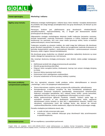 Temat operacyjny Marketing i reklama Ogólny zarys tematu Efektywna strategia marketingowa i reklama łączy różne metody i narzędzia dostosowane do produktu lub usługi danego przedsiębiorstwa oraz grup docelowych, do których są one adresowane. Pierwszym krokiem jest zdefiniowanie grup docelowych: młodzież/dorośli, specjaliści/studenci, mężczyźni/kobiety, itd., a drugim jest dostosowanie działań promocyjnych do danej grupy. Odpowiednia strategia marketingowa obejmuje środki tradycyjne (prywatne rozmowy, kontakt bezpośredni, materiały drukowane rozdawane w trakcie wydarzeń takich jak konferencje czy warsztaty, itd.) oraz nowe media (promocja online, konta w mediach społecznościowych, strona internetowa). Tradycyjne narzędzia są używane rzadziej, ale nadal mogą być efektywne dla docelowej grupy dorosłych specjalistów. Co więcej, dobrze jest przygotować materiały drukowane na potrzeby bezpośrednich spotkań z potencjalnymi klientami i zainteresowanymi stronami (broszury, ulotki z logiem i danymi kontaktowymi). Dla docelowej grupy studentów czy młodych specjalistów najbardziej skuteczne są nowe media i dlatego też najczęściej się z nich korzysta. Aby rozwinąć skuteczną strategię promocyjną i plan działań, należy podjąć następujące kroki: Zdefiniować produkt lub usługę przeznaczoną do sprzedaży Określić grupę docelową (lub kilka) Połączyć różne narzędzia (online, drukowane), tworząc tym samym strategię skrojoną na miarę Stworzyć dobrą reputację marki online Zróżnicować treści udostępniane użytkownikom Utrzymać wiadomości w formie prostej, krótkiej i czytelnej Kluczowe problemy i proponowane podejście Oto trzy najczęściej używane środki przekazu online zidentyfikowane w temacie „marketingu”, wraz z ich pożądanymi właściwościami: Strona internetowa: czytelna, prosta, przyjazna dla użytkownika, zaktualizowana Korespondencja e-mailowa rozsyłana do bazy kontaktowej pożądanych grup docelowych (instytucje kształcenia zawodowego, stowarzyszenia wolontariackie, federacje zrzeszające specjalistów, itd.): ciekawy temat, krótki i prosty komunikat, odpowiednie linki oraz newsy ze szczegółowymi informacjami w treści e-maila. Media społecznościowe (głównie Facebook, LinkedIn, Twitter): jedno logo na wszystkich serwisach w celu zbudowania rozpoznawalnej marki, regularnie aktualizowane strony (średnio co dwa dni) z odpowiednimi newsami, linkami oraz obrazkami, zróżnicowane treści dla każdego konta, aby dotrzeć do różnych użytkowników/klientów, krótkie wiadomości, zdjęcia lub obrazki przykuwające uwagę. Ponadto niezbędne jest dołożenie starań, aby Opracowano przez e-maile nie były oznaczane jako spam informacje i dane osobowe dotyczące grup docelowych były przechowywane w sposób bezpieczny. IDP we współpracy z pozostałymi partnerami. Projekt GOAL (nr projektu: 2013-1-GR1-GRU06-15317) został dofinansowany ze środków Komisji Europejskiej. Niniejsza publikacja odzwierciedla jedynie poglądy autora, a Komisja nie jest odpowiedzialna za jakiekolwiek użycie zawartych tu informacji. 1
