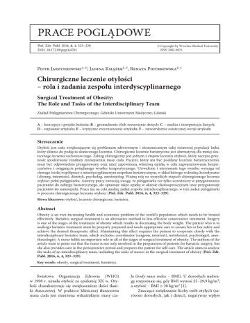 PRACE POGLĄDOWE Piel. Zdr. Publ. 2016, 6, 4, 323–329 DOI: 10.17219/pzp/64701 © Copyright by Wroclaw Medical University ISSN 2082-9876 Piotr JarzynkowskiA, D, Janina KsiążekE, F, Renata PiotrkowskaB, C Chirurgiczne leczenie otyłości – rola i zadania zespołu interdyscyplinarnego Surgical Treatment of Obesity: The Role and Tasks of the Interdisciplinary Team Zakład Pielęgniarstwa Chirurgicznego, Gdański Uniwersytet Medyczny, Gdańsk A – koncepcja i projekt badania; B – gromadzenie i/lub zestawianie danych; C – analiza i interpretacja danych; D – napisanie artykułu; E – krytyczne zrecenzowanie artykułu; F – zatwierdzenie ostatecznej wersji artykułu Streszczenie Otyłość jest stale zwiększającym się problemem zdrowotnym i ekonomicznym całej światowej populacji ludzi, który skłania do podjęcia skutecznego leczenia. Chirurgiczne leczenie bariatryczne jest alternatywą dla mniej skutecznego leczenia zachowawczego. Zabieg chirurgiczny jest jednym z etapów leczenia otyłości, który zaczyna przynosić spodziewane rezultaty zmniejszenia masy ciała. Pacjent, który ma być poddany leczeniu bariatrycznemu, musi być odpowiednio przygotowany oraz mieć zapewnioną właściwą opiekę w celu zagwarantowania bezpieczeństwa i osiągnięcia pożądanego wyniku terapeutycznego. Utrwalenie i utrzymanie tego wyniku wymaga od chorego ścisłej współpracy z interdyscyplinarnym zespołem bariatrycznym, w skład którego wchodzą: koordynator (chirurg, internista), dietetyk, psycholog, anestezjolog. Ważną rolę na wszystkich etapach chirurgicznego leczenia otyłości pełni pielęgniarka. Autorzy pracy zwracają uwagę, że pielęgniarka nie tylko uczestniczy w przygotowaniu pacjentów do zabiegu bariatrycznego, ale sprawuje także opiekę w okresie okołooperacyjnym oraz przygotowuje pacjentów do samoopieki. Praca ma na celu analizę zadań zespołu interdyscyplinarnego, w tym zadań pielęgniarki w procesie chirurgicznego leczenia otyłości (Piel. Zdr. Publ. 2016, 6, 4, 323–329). Słowa kluczowe: otyłość, leczenie chirurgiczne, bariatria. Abstract Obesity is an ever-increasing health and economic problem of the world’s population which needs to be treated effectively. Bariatric surgical treatment is an alternative method to less effective conservative treatment. Surgery is one of the stages of the treatment of obesity which results in decreasing the body weight. The patient who is to undergo bariatric treatment must be properly prepared and needs appropriate care to ensure his or her safety and achieve the desired therapeutic effect. Maintaining this effect requires the patient to cooperate closely with the interdisciplinary bariatric team, which includes: coordinator (surgeon, internist), nutritionist, psychologist, anesthesiologist. A nurse fulfils an important role in all of the stages of surgical treatment of obesity. The authors of the article want to point out that the nurse is not only involved in the preparation of patients for bariatric surgery, but she also provides care in the perioperative period and prepares the patient for self-care. The article aims to analyze the tasks of an interdisciplinary team, including the tasks of nurses in the surgical treatment of obesity (Piel. Zdr. Publ. 2016, 6, 4, 323–329). Key words: obesity, surgical treatment, bariatrics. Światowa Organizacja Zdrowia (WHO) w 1998 r. uznała otyłość za epidemię XX w. Otyłość charakteryzuje się zwiększeniem ilości tkanki tłuszczowej. W praktyce klinicznej tłuszczowa masa ciała jest mierzona wskaźnikiem masy cia- ła (body mass index – BMI). U dorosłych nadwagę rozpoznaje się, gdy BMI wynosi 25–29,9 kg/m², a otyłość – BMI ≥ 30 kg/m² [1]. Znaczące zwiększanie liczby osób otyłych (zarówno dorosłych, jak i dzieci), negatywny wpływ 324 nadwagi i otyłości na organizm, powstawanie powikłań w postaci: zaburzeń metabolicznych i sercowo-naczyniowych, chorób układu oddechowego, nowotworów, chorób przewodu pokarmowego, zmian kostno-stawowych, zaburzeń płodności, nietrzymania moczu, następstw psychologicznych i społecznych skłaniają do podjęcia skutecznego leczenia otyłości. Bariatria to dziedzina medycyny zajmująca się leczeniem otyłości patologicznej. Obejmuje kompleksowe leczenie polegające zarówno na terapii zachowawczej (przygotowanie indywidualnych programów dietetycznych, nauczenie pacjenta zasad właściwego żywienia i samokontroli), metodach nieoperacyjnych (implantacja balona żołądkowego), jak i zabiegach z zakresu chirurgii plastycznej i chirurgii przewodu pokarmowego – chirurgia bariatryczna [2, 3]. Ponieważ otyłość wpływa na wszystkie sfery funkcjonowania człowieka, jej leczeniem zajmuje się zespół interdyscyplinarny ds. leczenia otyłości, w skład którego wchodzą: koordynator, chirurg, dietetyk, psycholog, anestezjolog, fizjoterapeuta i pielęgniarka. Z zespołem współpracuje endokrynolog i psychiatra [4, 5]. Leczenie zachowawcze otyłości wymaga od pacjentów odpowiedniej motywacji, dyscypliny, konsekwencji w działaniu. Alternatywą dla leczenia zachowawczego jest chirurgia bariatryczna z zastosowaniem metod restrykcyjnych, wyłączających lub zabiegów dwuetapowych. Pierwsze doniesienia o chirurgicznym leczeniu otyłości ukazały się w 1936 r., kiedy Babcock opisał własne doświadczenia z zakresu wycięcia fartucha skórno-tłuszczowego bez trwałych wyników. W 1952 r. Henrikson usunął u 32-letniej kobiety 105 cm jelita cienkiego, uzyskując trwały rezultat. Za pionierów chirurgii bariatrycznej można uznać Printena i Masona, którzy w 1971 r. wykonali pierwsze operacje restrykcyjne na żołądku. Poprawa wyników chirurgicznego leczenia otyłości wiąże się z wprowadzeniem technik laparoskopowych [5–7]. Na wybór dostępu operacyjnego ma wpływ typ zabiegu oraz umiejętności chirurga wykonującego operację. Według europejskich i amerykańskich wytycznych zarówno do