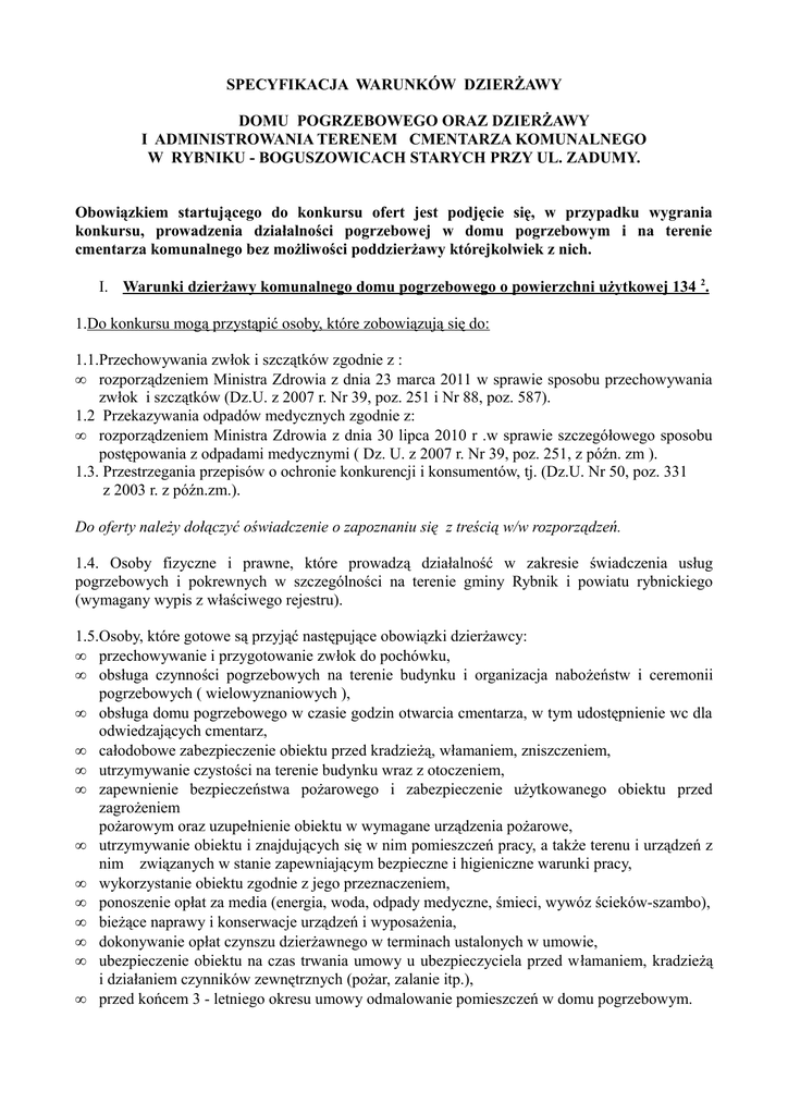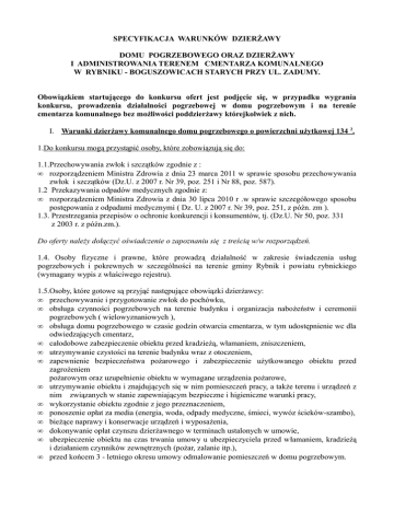 SPECYFIKACJA WARUNKÓW DZIERŻAWY DOMU POGRZEBOWEGO ORAZ DZIERŻAWY I ADMINISTROWANIA TERENEM CMENTARZA KOMUNALNEGO W RYBNIKU - BOGUSZOWICACH STARYCH PRZY UL. ZADUMY. Obowiązkiem startującego do konkursu ofert jest podjęcie się, w przypadku wygrania konkursu, prowadzenia działalności pogrzebowej w domu pogrzebowym i na terenie cmentarza komunalnego bez możliwości poddzierżawy którejkolwiek z nich. Ι. Warunki dzierżawy komunalnego domu pogrzebowego o powierzchni użytkowej 134 2. 1.Do konkursu mogą przystąpić osoby, które zobowiązują się do: 1.1.Przechowywania zwłok i szczątków zgodnie z : • rozporządzeniem Ministra Zdrowia z dnia 23 marca 2011 w sprawie sposobu przechowywania zwłok i szczątków (Dz.U. z 2007 r. Nr 39, poz. 251 i Nr 88, poz. 587). 1.2 Przekazywania odpadów medycznych zgodnie z: • rozporządzeniem Ministra Zdrowia z dnia 30 lipca 2010 r .w sprawie szczegółowego sposobu postępowania z odpadami medycznymi ( Dz. U. z 2007 r. Nr 39, poz. 251, z późn. zm ). 1.3. Przestrzegania przepisów o ochronie konkurencji i konsumentów, tj. (Dz.U. Nr 50, poz. 331 z 2003 r. z późn.zm.). Do oferty należy dołączyć oświadczenie o zapoznaniu się z treścią w/w rozporządzeń. 1.4. Osoby fizyczne i prawne, które prowadzą działalność w zakresie świadczenia usług pogrzebowych i pokrewnych w szczególności na terenie gminy Rybnik i powiatu rybnickiego (wymagany wypis z właściwego rejestru). 1.5.Osoby, które gotowe są przyjąć następujące obowiązki dzierżawcy: • przechowywanie i przygotowanie zwłok do pochówku, • obsługa czynności pogrzebowych na terenie budynku i organizacja nabożeństw i ceremonii pogrzebowych ( wielowyznaniowych ), • obsługa domu pogrzebowego w czasie godzin otwarcia cmentarza, w tym udostępnienie wc dla odwiedzających cmentarz, • całodobowe zabezpieczenie obiektu przed kradzieżą, włamaniem, zniszczeniem, • utrzymywanie czystości na terenie budynku wraz z otoczeniem, • zapewnienie bezpieczeństwa pożarowego i zabezpieczenie użytkowanego obiektu przed zagrożeniem pożarowym oraz uzupełnienie obiektu w wymagane urządzenia pożarowe, • utrzymywanie obiektu i znajdujących się w nim pomieszczeń pracy, a także terenu i urządzeń z nim związanych w stanie zapewniającym bezpieczne i higieniczne warunki pracy, • wykorzystanie obiektu zgodnie z jego przeznaczeniem, • ponoszenie opłat za media (energia, woda, odpady medyczne, śmieci, wywóz ścieków-szambo), • bieżące naprawy i konserwacje urządzeń i wyposażenia, • dokonywanie opłat czynszu dzierżawnego w terminach ustalonych w umowie, • ubezpieczenie obiektu na czas trwania umowy u ubezpieczyciela przed włamaniem, kradzieżą i działaniem czynników zewnętrznych (pożar, zalanie itp.), • przed końcem 3 - letniego okresu umowy odmalowanie pomieszczeń w domu pogrzebowym. 1.6.Osoby, które przedstawią propozycję najwyższej miesięcznej opłaty czynszowej za dzierżawiony obiekt (netto bez podatku VAT). 1.7.Osoby, które zobowiążą się do wpłaty kaucji zabezpieczającej w wysokości 8 000 zł. 2. Pozostałe warunki , które musi spełnić dzierżawca: 2.1. 2.2. 2.3. 2.4. 2.5. Zamieszczenie informacji o obowiązujących cenach usług w domu pogrzebowym, książki skarg i wniosków oraz regulaminu domu pogrzebowego w miejscu widocznym dla klientów. Zapoznanie się z obiektem - przed przystąpieniem do przetargu. W przypadku posiadania karawanu pogrzebowego - dołączyć odpis warunków technicznych karawanu zgodnie z przepisami Ministerstwa Zdrowia i Opieki Społecznej, tj. rozporządzenie Ministra Zdrowia z dn. 27 grudnia 2007 r. w sprawie wydawania pozwoleń i zaświadczeń na przewóz zwłok i szczątków ludzkich Dz.U. Nr 249, poz. 1866 z 2007 r. ) Po zawarciu umowy przedstawi umowę na odbiór odpadów medycznych oraz pozostałych odpadów bytowych z domu pogrzebowego. Dopuszczenie innych zakładów pogrzebowych i kamieniarskich do świadczenia swoich usług na terenie domu pogrzebowego, zgodnie z wyborem rodziny zmarłego. ΙΙ. Warunki administrowania terenu cmentarza komunalnego o powierzchni 37 246 m2. 1. Do konkursu mogą przystąpić osoby, które zobowiązują się do: 1.1.Dokonywania pochówków zgodnie z: • ustawą z dnia 31 stycznia 1959 r. o cmentarzach i chowaniu zmarłych,tj. (Dz.U.Nr.23, poz.295 z 2000 r. z póź.zm.), • rozporządzeniem Ministra Zdrowia z dn. 07 grudnia 2001 r. w sprawie postępowania ze zwłokami i szczątkami ludzkimi, tj. (Dz.U.Nr 153, poz.1783), • rozporządzeniem Ministrów Gospodarki Terenowej i Ochrony Środowiska oraz Opieki Społecznej z dn. 20 października 1972 r. w sprawie urządzania cmentarzy, prowadzenia ksiąg cmentarnych oraz chowaniu zmarłych, tj. (Dz.U.Nr 47, poz.299 z późn. zm.), • rozporządzeniem Ministra Zdrowia z dnia 23 marca 2011 r. w sprawie sposobu przechowywania zwłok i szczątków, tj. (Dz.U. Nr 23 z 2000 r. z późn. zm.), • ustawą z dnia 16 lutego 2007 r. o ochronie konkurencji i konsumentów, tj. (Dz.U. Nr 50, poz. 331 z 2003 r. z późn. zm.). Do oferty należy dołączyć oświadczenie o zapoznaniu się z treścią w/w ustawy i rozporządzeń. 1.2. Osoby, które są gotowe przyjąć następujące obowiązki dzierżawcy: • wykonywanie prac porządkowych wiosennych i jesiennych na terenie cmentarza (zgrabianie i wywóz liści, koszenie i wywóz traw i chwastów), • wykonywanie bieżących prac porządkowych (wywóz śmieci, likwidacja miejsc ich gromadzenia, usuwanie odpadów kamieniarskich), • wykonywanie bieżących napraw sieci wodociągowej na terenie cmentarza, • całoroczne utrzymanie parkingu (koszenie, sprzątanie, akcja zimowa), • konserwacja i bieżące naprawy ogrodzenia, • urządzanie nowych miejsc do pochówku na podstawie planu zagospodarowania cmentarza poprzez planowe zagospodarowanie poszczególnych kwater, • ponoszenie opłat za media (za wodę i wywóz śmieci z terenu cmentarza), • dokonywanie