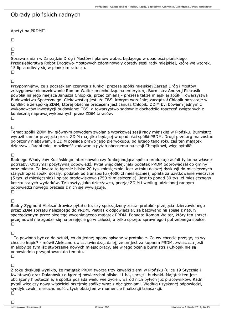 Płońszczak - Gazeta lokalna - Płońsk, Raciąż, Baboszewo, Czerwińsk, Dzierzążnia, Joniec, Naruszewo Obrady płońskich radnych Apetyt na PRDM Sprawa zmian w Zarządzie Dróg i Mostów i planów wobec będącego w upadłości płońskiego Przedsiębiorstwa Robót Drogowo-Mostowych zdominowały obrady sesji rady miejskiej, które we wtorek, 15 lipca odbyły się w płońskim ratuszu. Przypomnijmy, że z początkiem czerwca z funkcji prezesa spółki miejskiej Zarząd Dróg i Mostów zrezygnował nieoczekiwanie Roman Walter przechodząc na emeryturę. Burmistrz Andrzej Pietrasik powołał na jego miejsce Janusza Chłopika, przed zmianą - prezesa także miejskiej spółki Towarzystwa Budownictwa Społecznego. Ciekawostką jest, że TBS, którym wcześniej zarządzał Chłopik pozostaje w konflikcie ze spółką ZDiM, której obecnie prezesem jest Janusz Chłopik. ZDiM był bowiem jednym z wykonawców inwestycji budowlanej TBS, a towarzystwo sądownie dochodziło roszczeń związanych z konieczną naprawą wykonanych przez ZDiM tarasów. Temat spółki ZDiM był głównym powodem zwołania wtorkowej sesji rady miejskiej w Płońsku. Burmistrz wyraził zamiar przejęcia przez ZDiM majątku będącej w upadłości spółki PRDM. Drugi przetarg ma zostać ogłoszony niebawem, a ZDiM posiada prawo jego pierwokupu, od lutego tego roku zaś ten majątek dzierżawi. Radni mieli możliwość zadawania pytań obecnemu na sesji Chłopikowi, więc pytali& Radnego Władysław Kucińskiego interesowało czy funkcjonująca spółka produkuje asfalt tylko na własne potrzeby. Otrzymał pozytywną odpowiedź. Pytał więc dalej, jaki podatek PRDM odprowadzał do gminy oraz miasta. Ta kwota to łącznie blisko 20 tys. miesięcznie, lecz w toku dalszej dyskusji do miesięcznych stałych opłat spółki doszły: podatek od transportu (4600 zł miesięcznie), opłata za użytkowanie wieczyste (5 tys. zł miesięcznie) i opłata środowiskowa (750 zł miesięcznie). Jest to ponad 30 tys. zł miesięcznego kosztu stałych wydatków. Te koszty, jako dzierżawca, przejął ZDiM i według udzielonej radnym odpowiedzi nowego prezesa z nich się wywiązuje. Radny Zygmunt Aleksandrowicz pytał o to, czy sporządzony został protokół przejęcia dzierżawionego przez ZDiM sprzętu należącego do PRDM. Pietrasik odpowiedział, że bazowano na spisie z natury sporządzonym przez biegłego wyceniającego majątek PRDM. Ponadto Roman Walter, który ten sprzęt przejmował nie zgodził się na przejęcie go w całości, a tylko sprzętu sprawnego i potrzebnego spółce. - To powinno być co do sztuki, co do jednej opony spisane w protokole. Co wy chcecie przejąć, co wy chcecie kupić? - mówił Aleksandrowicz, twierdząc dalej, że on jest za kupnem PRDM, zwłaszcza jeśli miałoby za tym iść stworzenie nowych miejsc pracy, ale w jego ocenie burmistrz i Chłopik nie są odpowiednio przygotowani do tematu. Z toku dyskusji wynikło, że majątek PRDM tworzą trzy kawałki ziemi w Płońsku (ulice 19 Stycznia i Kwiatowa) oraz Dalanówku o łącznej powierzchni blisko 11 ha, sprzęt i budynki. Majątek ten jest obciążony hipotecznie, a spółka posiada wielu wierzycieli, wśród nich byłych już pracowników. Radni pytali więc czy nowy właściciel przejmie spółkę wraz z obciążeniami. Według uzyskanej odpowiedzi, syndyk zwolni nieruchomość z tych obciążeń w momencie finalizacji transakcji. http://www.plonszczak.pl Kreator PDF Utworzono 2 March, 2017, 16:45 Płońszczak - Gazeta lokalna - Płońsk, Raciąż, Baboszewo, Czerwińsk, Dzierzążnia, Joniec, Naruszewo W pierwszym przetargu, do którego nikt się nie zgłosił, syndyk oszacował wartość spółki na kwotę blisko 12,7 mln zł. Jest szansa, że wartość ta zostanie obniżona przy drugim przetargu. Z oczywistych względów radnych interesowało w jaki sposób ZDiM chce pokryć tak duże koszty kupna. Pietrasik odpowiedział, że w tym celu powołany został zespół, który szuka wszelkich rozwiązań tej kwestii, natomiast na tę chwilę pomysłem jest kredyt pod zastaw kupowanego majątku lub wydanie obligacji na ten cel. - Nie mówimy tu, że będzie to łatwe, będzie trudne, ale uważam, że warto ratować potencjał tej spółki mówił burmistrz, dodając, że decyzja o likwidacji PRDM zaskoczyła również jego, ponieważ zadłużenie, jakie miała spółka nie było tak dużym obciążeniem, by nie można było spróbować wyprowadzić jej na prostą. Pomysłem na wykorzystanie wyżej wspomnianego przez burmistrza potencjału spółki, byłoby według niego przeznaczenie go pod strefę ekonomiczną, bądź sprzedaż, a nawet oddanie (jeśli byłoby to zgodne z prawem) potencjalnemu, dużemu inwestorowi. Ponadto ZDiM korzystając z bocznicy kolejowej prowadzącej do bazy PRDM zaczął produkować asfalt, wobec czego stał się bardziej konkurencyjny w stosunku do podobnych spółek. W dyskusji pojawiły się informacje dotyczące kondycji ZDiM, który, na co wskazuje przeprowadzony w spółce audyt, zamknął miniony rok ze stratą 120 tys. zł. Spółka zatrudnia obecnie ponad 60 pracowników, a zajmuje się głównie remontem dróg i pracami brukarskimi. Jak przekonuje nowy prezes płynna praca zapewniona jest do końca roku, o tym co dalej zadecydują przetargi. Aktualnie trwają intensywne przygotowania do przetargu, który ogłosi syndyk. Jeśli ZDiM do tego przetargu nie przystąpi, straci prawo pierwokupu, a w trzecim przetargu PRDM będzie mógł zostać sprzedany w częściach. Dyskusję zakończyła niemerytoryczna wymiana zdań pomiędzy radnym Kucińskim a radną Bożeną Dzitowską, która zastanawiała się do czego mają zmierzać dotychczasowe pytania i co pytający mają na myśli tak je stawiając. Na takie, jedno z ostatnich postawionych przez radną, pytanie Kuciński zareagował ostro, prosząc, by go nie oceniano. O tym, czy ZDiM zdecyduje się na kupno PRDM zadecyduje zgromadzenie wspólników spółki, w tym 