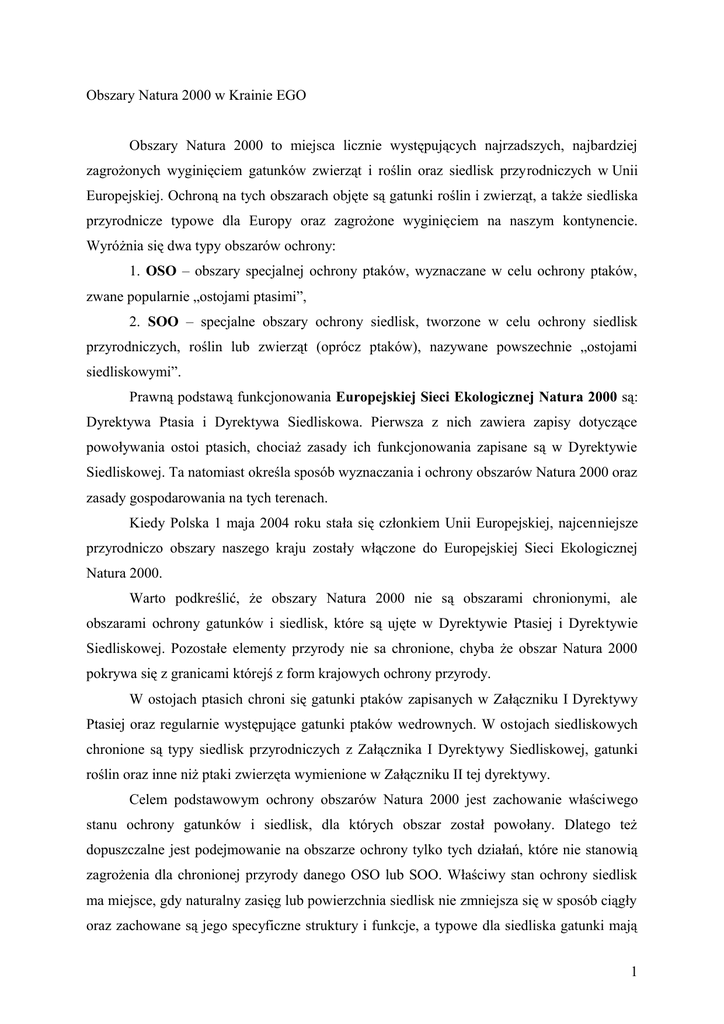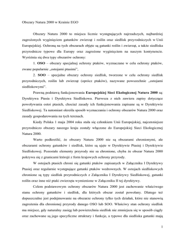 Obszary Natura 2000 w Krainie EGO Obszary Natura 2000 to miejsca licznie występujących najrzadszych, najbardziej zagrożonych wyginięciem gatunków zwierząt i roślin oraz siedlisk przyrodniczych w Unii Europejskiej. Ochroną na tych obszarach objęte są gatunki roślin i zwierząt, a także siedliska przyrodnicze typowe dla Europy oraz zagrożone wyginięciem na naszym kontynencie. Wyróżnia się dwa typy obszarów ochrony: 1. OSO – obszary specjalnej ochrony ptaków, wyznaczane w celu ochrony ptaków, zwane popularnie „ostojami ptasimi”, 2. SOO – specjalne obszary ochrony siedlisk, tworzone w celu ochrony siedlisk przyrodniczych, roślin lub zwierząt (oprócz ptaków), nazywane powszechnie „ostojami siedliskowymi”. Prawną podstawą funkcjonowania Europejskiej Sieci Ekologicznej Natura 2000 są: Dyrektywa Ptasia i Dyrektywa Siedliskowa. Pierwsza z nich zawiera zapisy dotyczące powoływania ostoi ptasich, chociaż zasady ich funkcjonowania zapisane są w Dyrektywie Siedliskowej. Ta natomiast określa sposób wyznaczania i ochrony obszarów Natura 2000 oraz zasady gospodarowania na tych terenach. Kiedy Polska 1 maja 2004 roku stała się członkiem Unii Europejskiej, najcenniejsze przyrodniczo obszary naszego kraju zostały włączone do Europejskiej Sieci Ekologicznej Natura 2000. Warto podkreślić, że obszary Natura 2000 nie są obszarami chronionymi, ale obszarami ochrony gatunków i siedlisk, które są ujęte w Dyrektywie Ptasiej i Dyrektywie Siedliskowej. Pozostałe elementy przyrody nie sa chronione, chyba że obszar Natura 2000 pokrywa się z granicami którejś z form krajowych ochrony przyrody. W ostojach ptasich chroni się gatunki ptaków zapisanych w Załączniku I Dyrektywy Ptasiej oraz regularnie występujące gatunki ptaków wedrownych. W ostojach siedliskowych chronione są typy siedlisk przyrodniczych z Załącznika I Dyrektywy Siedliskowej, gatunki roślin oraz inne niż ptaki zwierzęta wymienione w Załączniku II tej dyrektywy. Celem podstawowym ochrony obszarów Natura 2000 jest zachowanie właściwego stanu ochrony gatunków i siedlisk, dla których obszar został powołany. Dlatego też dopuszczalne jest podejmowanie na obszarze ochrony tylko tych działań, które nie stanowią zagrożenia dla chronionej przyrody danego OSO lub SOO. Właściwy stan ochrony siedlisk ma miejsce, gdy naturalny zasięg lub powierzchnia siedlisk nie zmniejsza się w sposób ciągły oraz zachowane są jego specyficzne struktury i funkcje, a typowe dla siedliska gatunki mają 1 zapewniony właściwy stan ochrony. O właściwym stanie ochrony gatunku mówimy wtedy, gdy liczebność lokalnej populacji gatunku lub jej zasięg nie zmniejsza się w sposób ciągły oraz istnieje dostatecznie duża powierzchnia siedlisk niezbędnych dla występowania tego gatunku. Sieć Natura 2000 w Polsce obejmuje 144 obszary ptasie i 817 obszarów siedliskowych (21 % powierzchni naszego kraju). W Krainie EGO utworzono dotychczas sześć obszarów należących do Europejskiej Sieci Ekologicznej Natura 2000. Są to: – Puszcza Romincka (PLH280005) o pow. 14754,3 ha – Puszcza Borecka (PLB280006) o pow. 18962,8 ha – Lasy Skaliskie (PLB280011) o pow. 12644,8 ha – Ostoja Borecka (PLH280016) o pow. 25340.1 ha – Ostoja Skaliska (PLH280017) o pow.12644,7 ha – Niecka Skaliska (PLH280049) o pow.11385,7 ha Puszcza Romincka (kod obszaru w Sieci Natura 2000 - PLH280005) to siedliskowy kompleks leśny na północnym-wschodzie województwa warmińsko-mazurskiego, którego część znajduje się na terytorium Rosji. Charakteryzuje się zróżnicowanym ukształtowaniem terenu, obecnością licznych cieków, występowaniem małych jeziorek i stosunkowo dużych obszarów torfowisk (jedno z nich zajmuje 150 ha). Puszcza leży na zapleczu moren czołowych fazy pomorskiej zlodowacenia Wisły. W silnie urozmaiconym krajobrazie znaczną powierzchnię zajmują pagórkowate wysoczyzny zbudowane z glin i piasków zwałowych. Liczne są wzgórza kemowe i moreny martwego lodu. Charakterystyczne są doliny rzek i mniejszych cieków, płynących w kierunku północnym (Błędzianka i jej dopływy - Bludzia, Czerwona Struga, Czarna oraz Żytkiejmska Struga z dopływami). Cieki te mają naturalny charakter, meandrują lub płyną w dolinach głęboko wciętych w podłoże. Dolina Błędzianki największej rzeki Puszczy wykształciła się w pasie utworów sandrowych. W dnie tej doliny często występują zagłębienia wytopiskowe. Można je spotkać także w innych fragmentach Puszczy (głównie w części północnej) i są one zwykle zatorfione. Na ciekach, zwłaszcza mniejszych, licznie występują tamy i rozlewiska bobrowe. Bardzo interesujące są torfowiska źródliskowe, wykształcone w postaci torfowisk kopułowych (np. w pobliżu rezerwatu "Czerwona Struga") i torfowisk wiszących np. w dolinie Błędzianki. Gliniaste pagórki i zbocza porośnięte są lasami, głównie liściastymi, z 2 lipą, klonem, wiązem górskim, grabem i domieszką świerka, natomiast piaszczyste wzniesienia - leszczynowo-świerkowym lasem mieszanym. Równiny są zajęte przez świeże bory sosnowe i świerkowe, a sporadycznie przez bór świerkowy. W zatorfionych dolinach cieków rosną nadrzeczne lasy jesionowo-olszowe. Zagłębienia pojezierne zajęte są przez torfowiska. Z powodu swojej malowniczej rzeźby terenu oraz dużego udziału świerka Puszcza Romincka przypomina lasy tajgi. Klimat Puszczy cechuje wyraźny charakter kontynentalny, co sprzyja występowaniu licznych elementów borealnych, zarówno wśród flory, jak i zespołów roślinnych. Niemal wszystkie zespoły leśne występują w borealnych odmianach, co wyraża się obecnością grupy gatunków o północnym typie zasięgu, często na reliktowych, izolowanych stanowiskach. Szczególnie wysoką naturalnością odznaczają się śródleśne torfowiska, na których występuje między innymi świerczyna na torfie Sphagno girgensohnii-Piceetum. Puszcza ma d