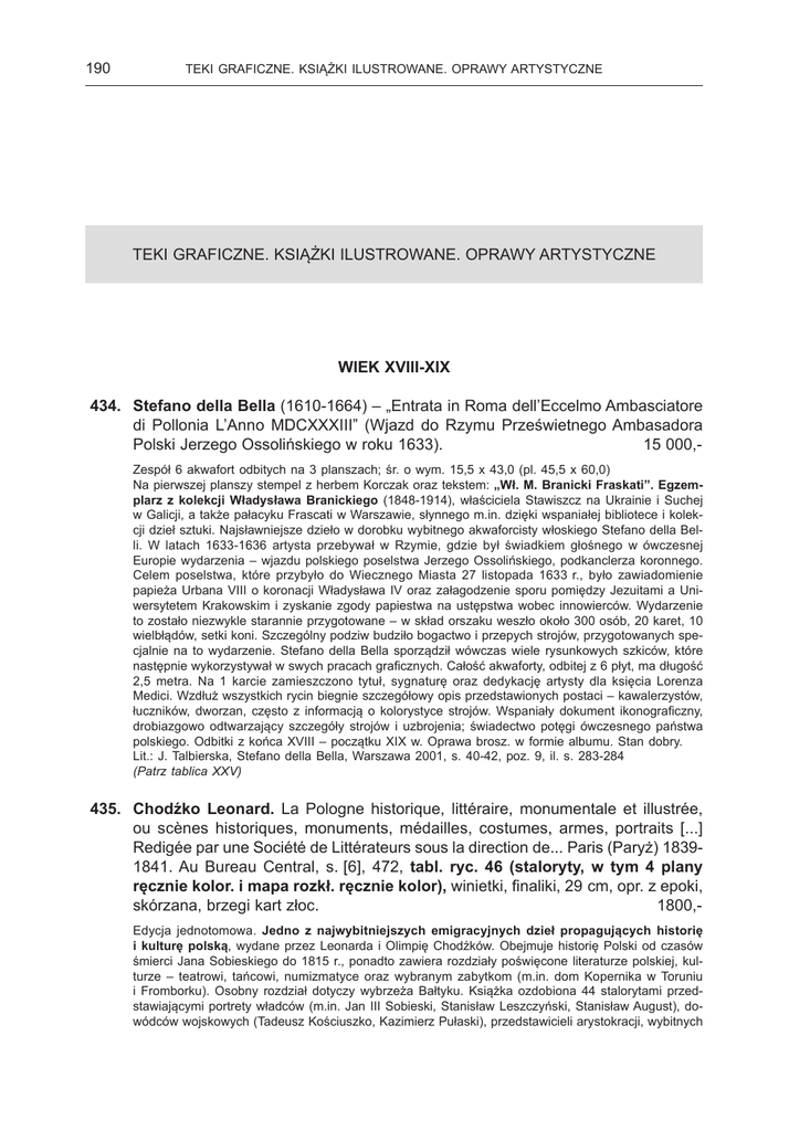 190 TEKI GRAFICZNE. KSIĄŻKI ILUSTROWANE. OPRAWY ARTYSTYCZNE TEKI GRAFICZNE. KSIĄŻKI ILUSTROWANE. OPRAWY ARTYSTYCZNE WIEK XVIII-XIX 434. Stefano della Bella (1610-1664) – „Entrata in Roma dell’Eccelmo Ambasciatore di Pollonia L’Anno MDCXXXIII” (Wjazd do Rzymu Prześwietnego Ambasadora Polski Jerzego Ossolińskiego w roku 1633). 15 000,Zespół 6 akwafort odbitych na 3 planszach; śr. o wym. 15,5 x 43,0 (pl. 45,5 x 60,0) Na pierwszej planszy stempel z herbem Korczak oraz tekstem: „Wł. M. Branicki Fraskati”. Egzemplarz z kolekcji Władysława Branickiego (1848-1914), właściciela Stawiszcz na Ukrainie i Suchej w Galicji, a także pałacyku Frascati w Warszawie, słynnego m.in. dzięki wspaniałej bibliotece i kolekcji dzieł sztuki. Najsławniejsze dzieło w dorobku wybitnego akwaforcisty włoskiego Stefano della Belli. W latach 1633-1636 artysta przebywał w Rzymie, gdzie był świadkiem głośnego w ówczesnej Europie wydarzenia – wjazdu polskiego poselstwa Jerzego Ossolińskiego, podkanclerza koronnego. Celem poselstwa, które przybyło do Wiecznego Miasta 27 listopada 1633 r., było zawiadomienie papieża Urbana VIII o koronacji Władysława IV oraz załagodzenie sporu pomiędzy Jezuitami a Uniwersytetem Krakowskim i zyskanie zgody papiestwa na ustępstwa wobec innowierców. Wydarzenie to zostało niezwykle starannie przygotowane – w skład orszaku weszło około 300 osób, 20 karet, 10 wielbłądów, setki koni. Szczególny podziw budziło bogactwo i przepych strojów, przygotowanych specjalnie na to wydarzenie. Stefano della Bella sporządził wówczas wiele rysunkowych szkiców, które następnie wykorzystywał w swych pracach graficznych. Całość akwaforty, odbitej z 6 płyt, ma długość 2,5 metra. Na 1 karcie zamieszczono tytuł, sygnaturę oraz dedykację artysty dla księcia Lorenza Medici. Wzdłuż wszystkich rycin biegnie szczegółowy opis przedstawionych postaci – kawalerzystów, łuczników, dworzan, często z informacją o kolorystyce strojów. Wspaniały dokument ikonograficzny, drobiazgowo odtwarzający szczegóły strojów i uzbrojenia; świadectwo potęgi ówczesnego państwa polskiego. Odbitki z końca XVIII – początku XIX w. Oprawa brosz. w formie albumu. Stan dobry. Lit.: J. Talbierska, Stefano della Bella, Warszawa 2001, s. 40-42, poz. 9, il. s. 283-284 (Patrz tablica XXV) 435. Chodźko Leonard. La Pologne historique, littéraire, monumentale et illustrée, ou scènes historiques, monuments, médailles, costumes, armes, portraits [...] Redigée par une Société de Littérateurs sous la direction de... Paris (Paryż) 18391841. Au Bureau Central, s. [6], 472, tabl. ryc. 46 (staloryty, w tym 4 plany ręcznie kolor. i mapa rozkł. ręcznie kolor), winietki, finaliki, 29 cm, opr. z epoki, skórzana, brzegi kart złoc. 1800,Edycja jednotomowa. Jedno z najwybitniejszych emigracyjnych dzieł propagujących historię i kulturę polską, wydane przez Leonarda i Olimpię Chodźków. Obejmuje historię Polski od czasów śmierci Jana Sobieskiego do 1815 r., ponadto zawiera rozdziały poświęcone literaturze polskiej, kulturze – teatrowi, tańcowi, numizmatyce oraz wybranym zabytkom (m.in. dom Kopernika w Toruniu i Fromborku). Osobny rozdział dotyczy wybrzeża Bałtyku. Książka ozdobiona 44 stalorytami przedstawiającymi portrety władców (m.in. Jan III Sobieski, Stanisław Leszczyński, Stanisław August), dowódców wojskowych (Tadeusz Kościuszko, Kazimierz Pułaski), przedstawicieli arystokracji, wybitnych TEKI GRAFICZNE. KSIĄŻKI ILUSTROWANE. OPRAWY ARTYSTYCZNE 435. L. Chodźko. Historia Polski. 1839-1841. 191 436. W. Hogarth. Dzieła graficzne. Polaków (m.in. Tadeusz Reytan, Joachim Lelewel, Wojciech Bogusławski), sceny historyczne (m.in. bitwa pod Kliszowem, plan pola elekcyjnego), widoki miast i zabytków (m.in. Warszawa, Kraków). Ryciny wykonane według rysunków cenionych polskich artystów, m.in. Jana Piotra Norblina, Franciszka Smuglewicza, Michała Stachowicza; rytowali graficy obcy oraz polscy (wśród nich Adam Piliński). Oprawa luksusowa wykonana przez A. Tarbesa (sygnowana nalepką): ciemnobrązowa skóra, na grzbiecie i licach tłocz. i złoc. motywy dekoracyjne. Próby pióra na k tyt. i spisie ilustracji zaklejone bibułą. Mapa naderwana. Na kartach i ilustracjach charakterystyczne zażółcenia i zabrudzenia, poza tym stan dobry. (Patrz ilustracja) 436. [Hogarth William]. Hannay James. The Complete Works of William Hogarth in a Series of One Hundred and Fifty Superb Engravings on Steel, from the Original Pictures. London and New York B.r. (II poł. XIX w.). The London Printing and Publishing Company, k. [2], s. XVIII, 201, tabl. ryc. 145 (winno być 150, staloryty), 30,5 cm, opr. z epoki, skórzana, brzegi k. złoc. 2400,Teka stalorytów wg Williama Hogartha (1697-1764) wybitnego angielskiego malarza, miedziorytnika i rysownika. Hogarth był cenionym portrecistą, ale najbardziej znany jest z cykli satyrycznych dzieł o moralizatorskim charakterze, odbijanych w formie miedziorytów: m.in. „Kariera rozpustnika”, „Kariera nierządnicy”, „Modne małżeństwo”, „Wybory”, „Ulica piwna” i „Pasaż ginu”. Do oferowanego wydania wstęp opracował James Hannay (1827-1873) szkocki powieściopisarz, dziennikarz, eseista i dyplomata. Tablice z pracami Hogartha zostały opatrzone komentarzem drukowanym we wcześniejszych edycjach autorstwa Johna Truslera (1735-1820) i E. F. Robertsa. Elegancka opr. sygnowana „Bumpus Ltd.”: brązowa skóra, grzbiet sześciopolowy, w polu 2. tłocz. i złoc. tytulatura. Na wyklejkach papier marm. John & Edward Bumpus Ltd. to znana, założona w 1780 r., londyńska firma, zajmująca się handlem książkami. W drugiej połowie XIX-wieku eleganckie oprawy dla sprzedawanych przez nią książek przygotowywali najlepsi ówcześni introligatorzy londyńscy m.in. Rivière & Son, Sangorski & Sutcliffe, sygnując je nazwą firmy. Brak 5 tablic. Miejscami zabrudzenia i zażó