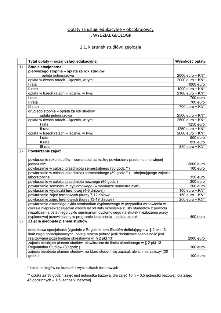 Opłaty za usługi edukacyjne – obcokrajowcy I. WYDZIAŁ GEOLOGII