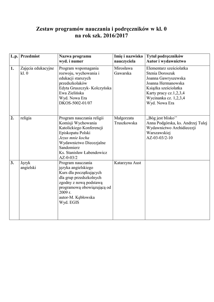 Zestaw programów nauczania i podręczników w kl. 0 na rok szk. 2016/2017 L.p. Przedmiot Nazwa programu wyd. i numer Imię i nazwisko Tytuł podręczników nauczyciela Autor i wydawnictwo 1. Zajęcia edukacyjne kl. 0 Program wspomagania Mirosława rozwoju, wychowania i Gawarska edukacji starszych przedszkolaków Edyta Gruszczyk- Kolczyńska Ewa Zielińska Wyd. Nowa Era DKOS-5002-01/07 Elementarz sześciolatka Stenia Doroszuk Joanna Gawryszewska Joanna Hermanowska Książka sześciolatka Karty pracy cz.1,2,3,4 Wycinanka cz. 1,2,3,4 Wyd. Nowa Era 2. religia ,,Bóg jest blisko’’ Anna Podgórska, ks. Andrzej Tulej Wydawnictwo Archidiecezji Warszawskiej AZ-03-03/2-10 3. Język angielski Program nauczania religii Małgorzata Komisji Wychowania Truszkowska Katolickiego Konferencji Episkopatu Polski Jezus mnie kocha Wydawnictwo Diecezjalne Sandomierz Ks. Stanisław Łabendowicz AZ-0-03/2 Program nauczania Katarzyna Aust języka angielskiego Kurs dla początkujących dla grup przedszkolnych zgodny z nową podstawą programową obowiązującą od 2009 r. autor-M. Kębłowska Wyd. EGIS
