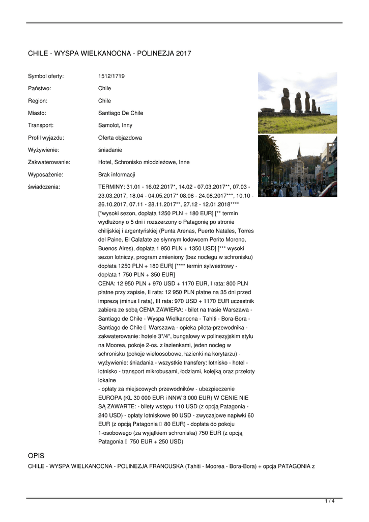 CHILE - WYSPA WIELKANOCNA - POLINEZJA 2017 Symbol oferty: 1512/1719 Państwo: Chile Region: Chile Miasto: Santiago De Chile Transport: Samolot, Inny Profil wyjazdu: Oferta objazdowa Wyżywienie: śniadanie Zakwaterowanie: Hotel, Schronisko młodzieżowe, Inne Wyposażenie: Brak informacji świadczenia: TERMINY: 31.01 - 16.02.2017*, 14.02 - 07.03.2017**, 07.03 - 23.03.2017, 18.04 - 04.05.2017* 08.08 - 24.08.2017***, 10.10 26.10.2017, 07.11 - 28.11.2017**, 27.12 - 12.01.2018**** [*wysoki sezon, dopłata 1250 PLN + 180 EUR] [** termin wydłużony o 5 dni i rozszerzony o Patagonię po stronie chilijskiej i argentyńskiej (Punta Arenas, Puerto Natales, Torres del Paine, El Calafate ze słynnym lodowcem Perito Moreno, Buenos Aires), dopłata 1 950 PLN + 1350 USD] [*** wysoki sezon lotniczy, program zmieniony (bez noclegu w schronisku) dopłata 1250 PLN + 180 EUR] [**** termin sylwestrowy dopłata 1 750 PLN + 350 EUR] CENA: 12 950 PLN + 970 USD + 1170 EUR, I rata: 800 PLN płatne przy zapisie, II rata: 12 950 PLN płatne na 35 dni przed imprezą (minus I rata), III rata: 970 USD + 1170 EUR uczestnik zabiera ze sobą CENA ZAWIERA: - bilet na trasie Warszawa Santiago de Chile - Wyspa Wielkanocna - Tahiti - Bora-Bora Santiago de Chile  Warszawa - opieka pilota-przewodnika - zakwaterowanie: hotele 3*/4*, bungalowy w polinezyjskim stylu na Moorea, pokoje 2-os. z łazienkami, jeden nocleg w schronisku (pokoje wieloosobowe, łazienki na korytarzu) - wyżywienie: śniadania - wszystkie transfery: lotnisko - hotel - lotnisko - transport mikrobusami, łodziami, kolejką oraz przeloty lokalne - opłaty za miejscowych przewodników - ubezpieczenie EUROPA (KL 30 000 EUR i NNW 3 000 EUR) W CENIE NIE SĄ ZAWARTE: - bilety wstępu 110 USD (z opcją Patagonia - 240 USD) - opłaty lotniskowe 90 USD - zwyczajowe napiwki 60 EUR (z opcją Patagonia  80 EUR) - dopłata do pokoju 1-osobowego (za wyjątkiem schroniska) 750 EUR (z opcją Patagonia  750 EUR + 250 USD) OPIS CHILE - WYSPA WIELKANOCNA - POLINEZJA FRANCUSKA (Tahiti - Moorea - Bora-Bora) + opcja PATAGONIA z 1/4 ARGENTYNĄ DZIEŃ 1: Zbiórka na lotnisku w Warszawie. Przelot przez jeden z portów lotniczych w Europie do Chile. DZIEŃ 2: Przylot do stolicy Chile, transfer do hotelu. Krótki odpoczynek po podróży. Zwiedzanie miasta - wzgórze San Cristóbal - stąd rozpościera się wspaniały widok na miasto i okolicę, znanego z ataku lotniczego na prezydenta Salvadore Allende Palacio de la Moneda, dzielnica rządowa, katedra. Nocleg. DZIEŃ 3: Wczesnym rankiem wyjazd do Canion Rio Maipo. Po drodze wizyta w największej chilijskiej winnicy Concha y Tora. Próba miejscowych win w celu uchwycenia smaku i dodania sobie odwagi przed mrożącą krew w żyłach przygodą na rzece Maipo. Przejazd w idyllicznym krajobrazie gór przy wtórze pieśni biesiadnych w wykonaniu rozochoconych członków wycieczkowego chóru. Dojazd do kanionu. Fakultatywnie przesiadka na pontony (ok. 40 USD). Prawdziwie męska przygoda, próba sił i charakteru. Spływ rwącą górską rzeką. Szczęśliwe ukończenie raftingu. Przejazd do słynnych ciepłych źródeł Banos Colina. Odprężająca kąpiel wśród majestatycznych gór. Przyjazd na nocleg do schroniska górskiego. DZIEŃ 4: Poranne rozbudzenie i śniadanie wśród urzekającego świata gór. Po śniadaniu trekking na punkt widokowy Laguna El Morado - stąd rozpościera się oszałamiający i rzucający na kolana widok na andyjski szczyt Cerro El Morado - 5 060 m n.p.m. Zejście do punktu startu. Po południu przejazd do Vina del Mar. Zakwaterowanie. Noc uciech doczesnych w największym kurorcie Chile. DZIEŃ 5: Zwiedzanie kurortu, okolicznych plaż, portowego miasta Valparaiso. Wjazd starą, niemiłosiernie skrzypiącą kolejką zębatą na punkt widokowy. Powrót do Santiago. Zakwaterowanie, nocleg. DZIEŃ 6: Wczesne śniadanie, przejazd na lotnisko i wylot na leżącą na końcu świata, skrytą i tajemniczą Wyspę Wielkanocną. Pierwsze spotkanie z posągami słynnych olbrzymów -moai”. Wycieczka piesza na wypełniony wodą krater wulkanu Rano Kao. Genialne widoki. Zwiedzanie słynnej z kultu człowieka - ptaka wioski ceremonialnej Orongo. Powrót do hotelu. Wieczorem obserwacja rozgwieżdżonego nieboskłonu. DZIEŃ 7: Po śniadaniu wykwaterowanie z pokoi i wyjazd na wycieczkę. Podziwiania kamiennych olbrzymów ciąg dalszy - wulkan Rano Raraku, gdzie wykuwano moai - sesja zdjęciowa między posągami. Słynna, dzika plaża Anakena, gdzie swój obóz miała misja Thora Heyerdahla. Powrót do cywilizacji, wizyta na bazarze rzemiosła artystycznego. Przejazd na lotnisko, wieczorem wylot na owiane legendą rajskie wyspy Pacyfiku - Polinezję Francuską. Przylot do Papeete, stolicy Tahiti. Przejazd do hotelu. Nocleg. DZIEŃ 8: Po śniadaniu wyjazd na wycieczkę po Tahiti. Oglądanie Point Venus, słynnej czarnej plaży, podziwianie wodospadów. Wizyta w Muzeum Tahiti i Wysp Archipelagu. Po południu transfer na oddaloną o 9 mil wyspę Moorea. Przejazd do hotelu nad oceanem. Nocleg na Moorea. DZIEŃ 9-10: Wycieczki piesze po okolicy, pływanie, sporty wodne lub fakultatywnie safari landroverami po wyspie - punkt widokowy Belvedere, plantacje wanilii i ananasów (ok. 45 EUR). Noclegi na Moorea. DZIEŃ 11: Przelot na wyspę Bora-Bora - uznawaną przez znawców za ósmy cud natury. Transfer katamaranem po niezwykłej urody turkusowych wodach. Błogi odpoczynek na jednej z najładniejszych wysp Polinezji, beztroskie baraszkowanie w ciepłych wodach, delektowanie się urodą Pacyfiku. Nocleg na Bora-Bora. DZIEŃ 12: Samodzielne pływanie z maską na rafie koralowej lub fakultatywnie wycieczka łodzią wokół wyspy, liczenie odcieni niebieskości wody, zabawy z rekinami i płaszczkami… W trakcie wycieczki lunch w stylu polinezyjskim na brzegu Oceanu (koszt wycieczki ok. 80 EUR, ale naprawdę warto). Nocleg na Bora-Bora. DZIEŃ 13: Odpoczynku ciąg dalszy lub dla chętnych minitrekking na pobliskie wzgórze lub też podgląd