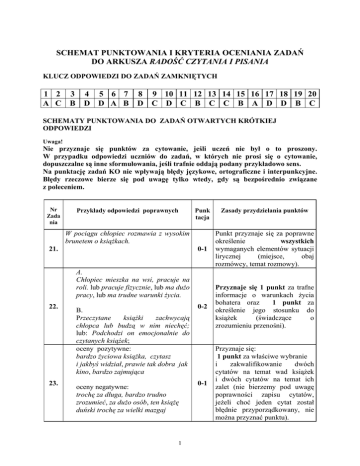 SCHEMAT PUNKTOWANIA I KRYTERIA OCENIANIA ZADAŃ DO ARKUSZA RADOŚĆ CZYTANIA I PISANIA KLUCZ ODPOWIEDZI DO ZADAŃ ZAMKNIĘTYCH 1 2 3 A C B 4 5 6 7 D D A B 8 9 10 11 12 13 14 15 16 17 18 19 20 D C D C B C C B A D D B C SCHEMATY PUNKTOWANIA DO ZADAŃ OTWARTYCH KRÓTKIEJ ODPOWIEDZI Uwaga! Nie przyznaje się punktów za cytowanie, jeśli uczeń nie był o to proszony. W przypadku odpowiedzi uczniów do zadań, w których nie prosi się o cytowanie, dopuszczalne są inne sformułowania, jeśli trafnie oddają podany przykładowo sens. Na punktację zadań KO nie wpływają błędy językowe, ortograficzne i interpunkcyjne. Błędy rzeczowe bierze się pod uwagę tylko wtedy, gdy są bezpośrednio związane z poleceniem. Nr Zada nia Przykłady odpowiedzi poprawnych Punk tacja 0-1 Punkt przyznaje się za poprawne określenie wszystkich wymaganych elementów sytuacji lirycznej (miejsce, obaj rozmówcy, temat rozmowy). 0-2 Przyznaje się 1 punkt za trafne informacje o warunkach życia bohatera oraz 1 punkt za określenie jego stosunku do książek (świadczące o zrozumieniu przenośni). 0-1 Przyznaje się: 1 punkt za właściwe wybranie i zakwalifikowanie dwóch cytatów na temat wad książek i dwóch cytatów na temat ich zalet (nie bierzemy pod uwagę poprawności zapisu cytatów, jeżeli choć jeden cytat został błędnie przyporządkowany, nie można przyznać punktu). W pociągu chłopiec rozmawia z wysokim brunetem o książkach. 21. A. Chłopiec mieszka na wsi, pracuje na roli. lub pracuje fizycznie, lub ma dużo pracy, lub ma trudne warunki życia. 22. 23. B. Przeczytane książki zachwycają chłopca lub budzą w nim niechęć; lub: Podchodzi on emocjonalnie do czytanych książek; oceny pozytywne: bardzo życiowa książka, czytasz i jakbyś widział, prawie tak dobra jak kino, bardzo zajmująca oceny negatywne: trochę za długa, bardzo trudno zrozumieć, za dużo osób, ten książę duński trochę za wielki mazgaj 1 Zasady przydzielania punktów 24. tu w oczy nikogo nie kole 0-1 lub: czas szybciej leci W podróży warto czytać, ponieważ wydaje się wówczas, że czas szybciej mija i podróż wydaje się krótsza (nie dłuży się tak). Można pożytecznie spędzić czas, rozwijając wyobraźnię. Pasjonująca lektura nie pozwala zasnąć, więc czytanie 25. zwiększa bezpieczeństwo podróży. 0-4 W podróży nie warto czytać, ponieważ trudno znaleźć wygodną pozycję, więc może boleć kręgosłup. Przy nieodpowiednim oświetleniu męczą się oczy. Rozmowy współpasażerów utrudniają rozumienie czytanego tekstu. Przyznaje się 1 punkt za wybranie i wypisanie właściwego cytatu (nie bierzemy pod uwagę poprawności zapisu cytatów). Przyznaje się: po 1 punkcie za każdy z trzech argumentów trafnie uzasadniających odpowiedź na pytanie oraz 1 pkt za zamknięcie trafnego uzasadnienia w 1-3 zdaniach. W ogóle nie punktujemy wypowiedzi pozbawionych argumentów lub niezgodnych z tematem. KRYTERIA OCENY OGŁOSZENIA Kryteria Zasady przyznawania punktów • Realizacja tematu • Podanie niezbędnych informacji (określenie miejsca giełdy, czasu jej trwania oraz organizatora). Dostosowanie wypowiedzi do sytuacji komunikacyjnej – zachęcenie do wzięcia udziału w giełdzie (wystarczy jeden zwrot o charakterze perswazyjnym). Kompozycja Zachowanie logicznej spójności wypowiedzi. Język i styl Przestrzeganie poprawności językowej i stylistycznej: poprawna odmiana wyrazów oraz łączenie wyrazów w zdania i zdań pojedynczych w zdania złożone, trafny dobór środków językowych (dopuszczalny jeden błąd). Ortografia i Przestrzeganie poprawności ortograficznej i interpunkcyjnej interpunkcja (dopuszczalny 1 błąd ortograficzny i 1 błąd interpunkcyjny). Razem: 2 Punktacja 0-2 0-1 0-1 0-1 0-5 KRYTERIA OCENY ZADANIA ROZSZERZONEJ ODPOWIEDZI 1. 2. Kryteria oceny I TEMAT (0-6 pkt) Tekst we fragmentach jest zgodny z tematem. Rozwinięcie obejmuje: a) podanie przykładów książek: akceptowanej i nieakceptowanej, b) uzasadnienie pozytywnej opinii (co najmniej jeden argument), c) uzasadnienie negatywnej opinii (co najmniej jeden argument), d) porównywanie, uogólnianie lub wnioskowanie. 3. Praca jest poprawna pod względem merytorycznym (nie zawiera błędu rzeczowego). II KOMPOZYCJA (0-3 pkt)* 4. Tekst ma kompozycję trójdzielną z zachowaniem właściwych proporcji. 5. Tekst jest spójny. 6. Tekst jest logicznie uporządkowany (nie pojawiają się nieuzasadnione powtórzenia). III JĘZYK I STYL (0-4 pkt)* 7 a. Poprawne (pod względem znaczeniowym) zastosowanie słownictwa, również w związkach frazeologicznych. 7 b. Poprawna odmiana wyrazów oraz łączenie wyrazów w zdania i zdań pojedynczych w zdania złożone (nie pojawia się powtarzanie tych samych struktur zdaniowych). Trafnie dobrane środki językowe (nie pojawiają się: wulgaryzmy, nieuza7 c. sadnione kolokwializmy, wielosłowie, wieloznaczność, mieszanie stylów, nieuzasadnione powtarzanie wyrazów, nadużywanie wyrazów obcych, nieuzasadnionych wyrażeń typu: praktycznie rzecz biorąc, dajmy na to, powiedzmy). 8. Styl jest funkcjonalny (dostosowany do sytuacji komunikacyjnej, formy wypowiedzi). IV ZAPIS (0-3 pkt)* 9. Ortografia Punktacja 0-1 0-1 0-1 0-1 0-1 0-1 0-1 0-1 0-1 0-3 3 bł. - 3 pkt 4 bł. - 2 pkt 5 bł. - 1 pkt 6 bł. - 0 pkt 0-1 0–2 0 bł. - 2 pkt 1 bł. - 1 pkt 2 bł. - 0 pkt 10. Interpunkcja (dopuszczalne 3 błędy). 0-1 Razem 0-16 * - Punktów z tych kategorii nie przyznaje się, jeśli praca zajmuje mniej niż połowę wyznaczonego miejsca. Uwaga! Przyznaje się 0 punktów za zadanie rozszerzonej odpowiedzi, jeżeli praca jest zupełnie niezgodna z tematem. 3