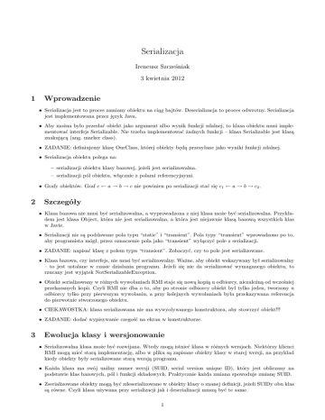 Serializacja Ireneusz Szcześniak 3 kwietnia 2012 1 Wprowadzenie • Serializacja jest to proces zamiany obiektu na ciąg bajtów. Deserializacja to proces odwrotny. Serializacja jest implementowana przez język Java. • Aby można było przesłać obiekt jako argument albo wynik funkcji zdalnej, to klasa obiektu musi implementować interfejs Serializable. Nie trzeba implementować żadnych funkcji – klasa Serializable jest klasą znakującą (ang. marker class). • ZADANIE: definiujemy klasę OurClass, której obiekty będą przesyłane jako wyniki funkcji zdalnej. • Serializacja obiektu polega na: – serializacji obiektu klasy bazowej, jeżeli jest serializowalna. – serializacji pól obiektu, włącznie z polami referencyjnymi. • Grafy obiektów. Graf c ← a → b → c nie powinien po serializacji stać się c1 ← a → b → c2 . 2 Szczegóły • Klasa bazowa nie musi być serializowalna, a wyprowadzona z niej klasa może być serializowalna. Przykładem jest klasa Object, która nie jest serializowalna, a która jest niejawnie klasą bazową wszystkich klas w Javie. • Serializacji nie są poddawane pola typu “static” i “transient”. Pola typy “transient” wprowadzono po to, aby programista mógł, przez oznaczenie pola jako “transient” wyłączyć pole z serializacji. • ZADANIE: napisać klasę z polem typu “transient”. Zobaczyć, czy to pole jest serializowane. • Klasa bazowa, czy interfejs, nie musi być serializowalny. Ważne, aby obiekt wskazywany był serializowalny – to jest ustalane w czasie działania programu. Jeżeli się nie da serializować wymaganego obiektu, to rzucany jest wyjątek NotSerializableException. • Obiekt serializowany w różnych wywołaniach RMI staje się nową kopią u odbiorcy, niezależną od wcześniej przekazanych kopii. Czyli RMI nie dba o to, aby po stronie odbiorcy obiekt był tylko jeden, tworzony u odbiorcy tylko przy pierwszym wywołaniu, a przy kolejnych wywołaniach była przekazywana referencja do pierwotnie stworzonego obiektu. • CIEKAWOSTKA: klasa serializowana nie ma wywyoływanego konstruktora, aby stowrzyć obiekt!!! • ZADANIE: dodać wypisywanie czegość na ekran w konstruktorze. 3 Ewolucja klasy i wersjonowanie • Serializowalna klasa może być rozwijana. Wtedy mogą istnieć klasa w różnych wersjach. Niektórzy klienci RMI mogą mieć starą implementację, albo w pliku są zapisane obiekty klasy w starej wersji, na przykład kiedy obiekty były serializowane starą wersją programu. • Każda klasa ma swój unilny numer wersji (SUID, serial version unique ID), który jest obliczany na podstawie klas bazowych, pól i funkcji składowych. Praktycznie każda zmiana spowoduje zmianę SUID. • Zserializowane obiekty mogą być zdeserializowane w obiekty klasy o znanej definicji, jeżeli SUIDy obu klas są równe. Czyli klasa używana przy serializacji jak i deserializacji muszą być te same. 1 • Chyba że zdefiniujemy pole: static final long serialVersionUID = 8131090907618007397L; • Wartość tego pola i jego nazwę dla danej klasy generuje program “serialver”. • Warto to pole zdefiniować dla serializacji, bo inaczej jego wartość będzie wyznaczana runtime. • Przy rozwoju klasy nie możemy: – zmieniać klasy bazowej – zminiać typu pól • Możemy: – dodawać nowe pola – zmieniać typy referencyjne na inne kompatybilne 4 Ponadprogramowe ciekawoski • Nowe wersje klasy przez wyprowadzenie nowej klasy. Programy, które spodziewają się starej wersji, czyli klasy bazowej, będą widzieć tylko tą klasę, a nowszej wersji nie. Wyprowadzanie nowej wersji klasy jest uporządkowane i nie wprowadza konieczności modyfikacji poprzedniej klasy. • Własna serializacja z java.io.Serializable: definicja prywatnych funkcji składowych readObject i readObject. Użycie funkcji defaultWriteObject i defaultReadObject z ObjectOutputStream. • Interfejs java.io.Externalizable deklaruje dwie funkcje: writeExternal i readExternal. Ten interfejs jest rozszerzeniem interfejsu java.io.Serializable. • Klasa może zdefiniować funkcje writeReplace i readReplace, które pozwalają na przetworzenie obiektu dla serializacji i deserializacji. 2