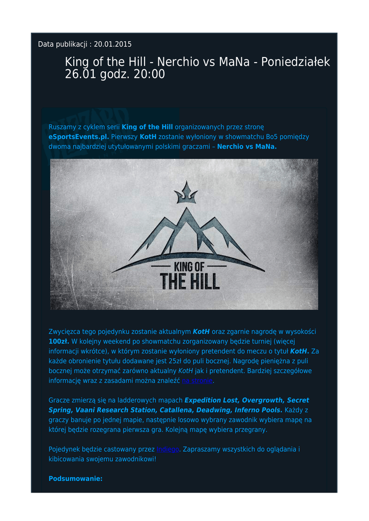 Data publikacji : 20.01.2015 King of the Hill - Nerchio vs MaNa - Poniedziałek 26.01 godz. 20:00 Ruszamy z cyklem serii King of the Hill organizowanych przez stronę eSportsEvents.pl. Pierwszy KotH zostanie wyłoniony w showmatchu Bo5 pomiędzy dwoma najbardziej utytułowanymi polskimi graczami – Nerchio vs MaNa. Zwycięzca tego pojedynku zostanie aktualnym KotH oraz zgarnie nagrodę w wysokości 100zł. W kolejny weekend po showmatchu zorganizowany będzie turniej (więcej informacji wkrótce), w którym zostanie wyłoniony pretendent do meczu o tytuł KotH. Za każde obronienie tytułu dodawane jest 25zł do puli bocznej. Nagrodę pieniężna z puli bocznej może otrzymać zarówno aktualny KotH jak i pretendent. Bardziej szczegółowe informację wraz z zasadami można znaleźć na stronie. Gracze zmierzą się na ladderowych mapach Expedition Lost, Overgrowth, Secret Spring, Vaani Research Station, Catallena, Deadwing, Inferno Pools. Każdy z graczy banuje po jednej mapie, następnie losowo wybrany zawodnik wybiera mapę na której będzie rozegrana pierwsza gra. Kolejną mapę wybiera przegrany. Pojedynek będzie castowany przez Indiego. Zapraszamy wszystkich do oglądania i kibicowania swojemu zawodnikowi! Podsumowanie: Kto: Nerchio vs MaNa Kiedy: Poniedziałek 26.01 godz. 20:00 Format: Bo5 Nagroda: 100zł + tytuł KotH Stream: http://twitch.tv/indystarcraft Źródło: esportsevents.pl Autor: Fanek Liczba wyświetleń strony: 1111 Data publikacji : 20.01.2015 Tagi: mana, Nerchio, King of the Hill Komentarz (0) dodaj komentarz Brak komentarzy dodaj komentarz Pozostałe nowości DreamHack Open: Valencia 2016 - Nerchio w półfinale - live! DreamHack Valencia to jedno z największych e-sportowych wydarzeń w Europie - dlatego nie mogło zabraknąć na nim StarCrafta II! W czasie rozgrywek 96 graczy będzie konkurować o 50 000 USD oraz 5 000 punktów WCS.Data publikacji: 16.07.20161 Aktualizacja 3.4 – Duże zmiany w rankingu StarCrafta II Na oficjalnym blogu Blizzarda pojawił się nowy wpis dotyczący tym razem zmian w rankingach: Ranking StarCrafta II jest areną dla niezwykle zaciętej rywalizacji. Do walki rusza wielu uczestników, ale tylko nieliczni awansują do ścisłej czołówki.Data publikacji: 03.07.20160 Rozpoczęcie trzeciego sezonu rankingowego 2016 Trzeci sezon tegorocznych rozgrywek ligowych w StarCrafta II uważamy za otwarty! Zresetowano pulę punktów premiowych oraz rankingi i przyznano nagrody za sezon drugi roku 2016.Data publikacji: 26.06.20160 Filmowy „Warcraft” już wkrótce w księgarniach! Powieść „Warcraft”, której wydanie zbiega się z polską premierą filmu „Warcraft. Początek” w reżyserii Duncana Jonesa, do księgarń trafi już 15 czerwca. Na kartach książki czytelnicy wkroczą w nowy wymiar emocji towarzyszących bohaterom fikcyjnych światów Azeroth i Draenor. Za sprawą Christie Golden, pisarki od lat cenionej przez fanów świata Warcraft, konflikt ludzi i orków nabierze jeszcze większej intensywności.Data publikacji: 13.06.20160 Blokada obecnego sezonu i darmowa zmiana nazwy postaci Jak czytamy na oficjalnym blogu Blizzarda: Obecny sezon rankingowy zbliża się ku końcowi i wkrótce zamknięte zostaną wszystkie ligi i dywizje. Kilka dni przed rozpoczęciem nowego sezonu, darmowa zmiana nazwy postaci w StarCraft II zostanie ponownie dodana do wszystkich kont, dla których funkcja ta nie jest obecnie dostępna.Data publikacji: 12.06.20160 Wszystkie nowości