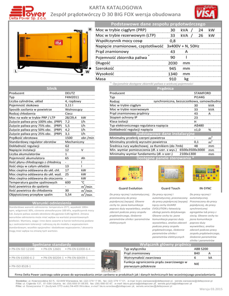 KARTA KATALOGOWA Zespół prądotwórczy D 30 BIG FOX wersja obudowana Podstawowe dane zespołu prądotwórczego Moc w trybie ciągłym (PRP) 30 kVA / 24 Moc w trybie rezerwowym (LTP) 33 kVA / 26 Współczynnik mocy cosϕ 0,8 Napięcie znamionowe, częstotliwość 3x400V + N, 50Hz Prąd znamionowy A 43 * l 90 Pojemność zbiornika paliwa Długość 2030 mm Szerokość 945 mm Wysokość 1340 mm Masa kg 910 *) Opcjonalnie dostępne zbiorniki paliwa o wiekszej pojemności Silnik Producent Typ Liczba cylindrów, układ Pojemność skokowa Sposób zasilania w powietrze Rodzaj chłodzenia Moc na wale w trybie PRP / LTP Zużycie paliwa przy 100% obc. (PRP) Zużycie paliwa przy 75% obc. (PRP) Zużycie paliwa przy 50% obc. (PRP) Zużycie paliwa przy 25% obc. (PRP) Prędkość obrotowa Standardowy regulator obrotów Dokładność regulacji Napięcie instalacji Liczba akumulatorów Pojemność akumulatora Ilość płynu chłodzącego z chłodnicą Ilość oleju w całym układzie Moc cieplna oddawana do ukł. chł. Moc cieplna oddawana do ukł. wyd. Moc cieplna oddawana do otoczenia Temperatura gazów spalinowych Ilość powietrza do spalania Ilość powietrza do chłodzenia Objętościowy przepływ spalin Prądnica DEUTZ F4M2011 4, rzędowy 3,11 l Wolnossący Ciecz 28/29,4 kW 7,2 l/h 5,5 l/h 4,2 l/h 3,1 l/h 1500 obr./min Mechaniczny G2 12 V 1 65 Ah l 13 l 17 kW 25 kW kW 600 °C m3/min 3 30 m /min 3 5,54 m /min Warunki odniesienia Standardowe warunki odniesienia: temperatura 25°C, wysokość 100m npm, wilgotność 30%, ciśnienie atmosferyczne 100 kPa, współczynnik mocy 0,8. Zużycie paliwa zostało określone dla gęstości 0,85 kg/dm3. Zmiana warunków odniesienia może mieć wpływ na wartości prezentowanych wielkości. Wymiary, waga i inne dane zawarte w karcie technicznej podane są z zastrzeżeniem tolerancji i odnoszą się do modelu z wyposażeniem standardowym; wszelkie opcjonalne i dodatkowe wyposażenie / akcesoria mogą mieć wpływ na zmianę tych wartości. Spełniane standardy • PN-EN ISO 12100 • PN-EN 12601 • PN-EN 61000-6-2 • PN-EN 60204-1 • PN-EN 60439-1 • PN-ISO 8528-1 kW kW • PN-EN 61000-6-4 Producent STAMFORD Typ PI144G synchroniczna, bezszczotkowa, samowzbudna Rodzaj Moc w trybie ciągłym 30 kVA Moc w trybie rezerwowym 33 kVA Prąd znamionowy prądnicy 43 A Stopień ochrony IP 23 Klasa izolacji H Typ elektronicznego regulatora napięcia AS480 Dokładność regulacji napięcia ±1,0 % Podstawowe dane instalacyjne Minimalny przekrój czerpni powietrza Minimalny przekrój wyrzutni powietrza 0,1 Średnica rury wydechowej za tłumikiem (do 7mb) 48 Min. wymiar pomieszczenia (dł. x szer. x wys.) 6500x3500x3000 Minimalny wymiar fundamentu (dł. x szer.) 2100x1300 m2 m2 mm mm mm Dostępne panele sterowania * Guard Evolution Guard Touch IN-SYNC Do pracy ręcznej i automatycznej, przeznaczony do pracy pojedynczej (wyspa). Głowne cechy to: jasna komunikacja poprzez duży wyswietlacz, analiza zdarzeń podczas pracy zespołu prądotwórczego, śledzenie parametrów silnika i parametrów elektrycznych Do pracy ręcznej i automatycznej, przeznaczony do pracy pojedynczej (wyspa). Łączy cechy GUARD EVOLUTION z łatwością obsługi panelu dotykowego. Głowne cechy to: jasna komunikacja poprzez duży wyswietlacz, analiza zdarzeń podczas pracy zespołu prądotwórczego, śledzenie parametrów silnika i parametrów elektrycznych Do pracy ręcznej i automatycznej. Przeznaczony do pracy pojedynczej, do pracy synchronicznej agregatów lub pracy z siecią. Głowne cechy to: jasna komunikacja poprzez duży wyswietlacz, analiza zdarzeń podczas pracy zespołu prądotwórczego, śledzenie parametrów silnika i parametrów Wyłącznik główny prądnicy Typ wyłącznika Prąd znamionowy Wytrzymałość zwarciowa Funkcja ograniczenia prądu zwarciowego w pierwszym półokresie ABB S200 B40 A 6 kA NIE Firma Delta Power zastrzega sobie prawo do wprowadzania zmian zarówno w produktach jak i danych technicznych bez wcześniejszego powiadamiania Wersja 03.2015