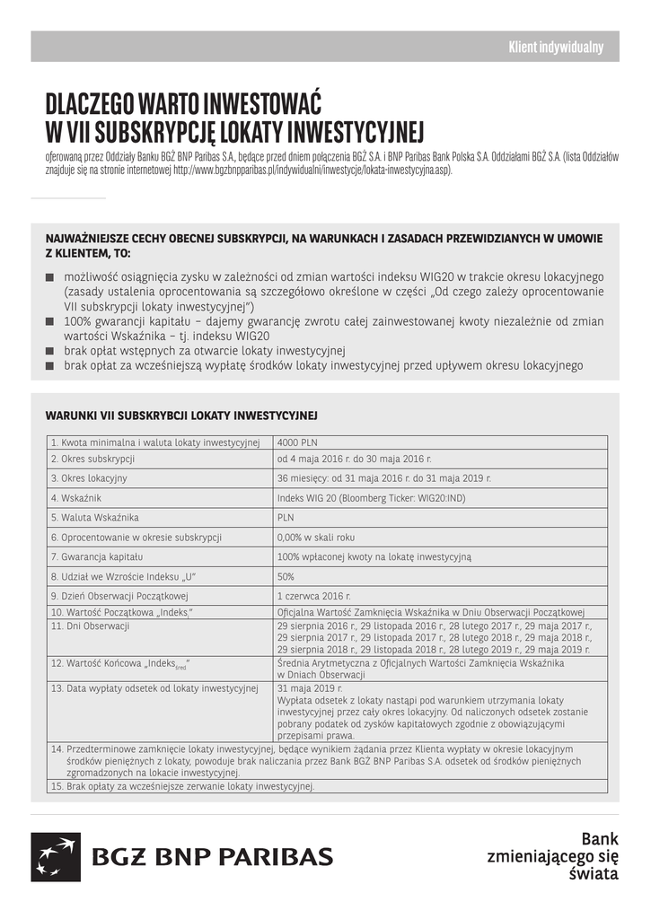 DLACZEGO WARTO INWESTOWAĆ W VII SUBSKRYPCJĘ LOKATY INWESTYCYJNEJ Klient indywidualny oferowaną przez Oddziały Banku BGŻ BNP Paribas S.A., będące przed dniem połączenia BGŻ S.A. i BNP Paribas Bank Polska S.A. Oddziałami BGŻ S.A. (lista Oddziałów znajduje się na stronie internetowej http://www.bgzbnpparibas.pl/indywidualni/inwestycje/lokata-inwestycyjna.asp). NAJWAŻNIEJSZE CECHY OBECNEJ SUBSKRYPCJI, NA WARUNKACH I ZASADACH PRZEWIDZIANYCH W UMOWIE Z KLIENTEM, TO: możliwość osiągnięcia zysku w zależności od zmian wartości indeksu WIG20 w trakcie okresu lokacyjnego (zasady ustalenia oprocentowania są szczegółowo określone w części „Od czego zależy oprocentowanie VII subskrypcji lokaty inwestycyjnej”) 100% gwarancji kapitału – dajemy gwarancję zwrotu całej zainwestowanej kwoty niezależnie od zmian wartości Wskaźnika – tj. indeksu WIG20 brak opłat wstępnych za otwarcie lokaty inwestycyjnej brak opłat za wcześniejszą wypłatę środków lokaty inwestycyjnej przed upływem okresu lokacyjnego WARUNKI VII SUBSKRYBCJI LOKATY INWESTYCYJNEJ 1. K wota minimalna i waluta lokaty inwestycyjnej 4000 PLN 2. Okres subskrypcji od 4 maja 2016 r. do 30 maja 2016 r. 3. Okres lokacyjny 36 miesięcy: od 31 maja 2016 r. do 31 maja 2019 r. 4. Wskaźnik Indeks WIG 20 (Bloomberg Ticker: WIG20:IND) 5. Waluta Wskaźnika PLN 6. Oprocentowanie w okresie subskrypcji 0,00% w skali roku 7. Gwarancja kapitału 100% wpłaconej kwoty na lokatę inwestycyjną 8. Udział we Wzroście Indeksu „U” 50% 9. Dzień Obserwacji Początkowej 1 czerwca 2016 r. 10. Wartość Początkowa „Indeksi” 11. Dni Obserwacji Oficjalna Wartość Zamknięcia Wskaźnika w Dniu Obserwacji Początkowej 29 sierpnia 2016 r., 29 listopada 2016 r., 28 lutego 2017 r., 29 maja 2017 r., 29 sierpnia 2017 r., 29 listopada 2017 r., 28 lutego 2018 r., 29 maja 2018 r., 29 sierpnia 2018 r., 29 listopada 2018 r., 28 lutego 2019 r., 29 maja 2019 r. Średnia Arytmetyczna z Oficjalnych Wartości Zamknięcia Wskaźnika 12. Wartość Końcowa „Indeksśred” w Dniach Obserwacji 13. Data wypłaty odsetek od lokaty inwestycyjnej 31 maja 2019 r. Wypłata odsetek z lokaty nastąpi pod warunkiem utrzymania lokaty inwestycyjnej przez cały okres lokacyjny. Od naliczonych odsetek zostanie pobrany podatek od zysków kapitałowych zgodnie z obowiązującymi przepisami prawa. 14. Przedterminowe zamknięcie lokaty inwestycyjnej, będące wynikiem żądania przez Klienta wypłaty w okresie lokacyjnym środków pieniężnych z lokaty, powoduje brak naliczania przez Bank BGŻ BNP Paribas S.A. odsetek od środków pieniężnych zgromadzonych na lokacie inwestycyjnej. 15. Brak opłaty za wcześniejsze zerwanie lokaty inwestycyjnej. Klient indywidualny DODATKOWE INFORMACJE DOTYCZĄCE INDEKSU WIG20 WIG20 to indeks giełdowy 20 największych i najbardziej płynnych spółek akcyjnych notowanych na Głównym Rynku Giełdy. Na dzień 6 kwietnia 2016 r. lista spółek WIG20 obejmuje: ALIOR BANK S.A. (ALR), ASSECO POLAND S.A. (ACP), Bank Zachodni WBK S.A. (BZW), CCC S.A. (CCC), CYFROWY POLSAT S.A. (CPS), ENEA S.A. (ENEA), ENERGA SA (ENG), EUROCASH S.A. (EUR), KGHM POLSKA MIEDŹ S.A. (KGH), Grupa Lotos S.A. (LTS), LPP S.A. (LPP), MBANK S.A. (MBK), ORANGE POLSKA S.A. (OPL), Bank Pekao S.A. (PEO), PGE Polska Grupa Energetyczna S.A. (PGE), PGNiG S.A. (PGN), PKN ORLEN S.A. (PKN), PKO BP S.A. (PKO), PZU S.A. (PZU), TAURON POLSKA ENERGIA S.A. (TPE). Uczestnikami indeksu WIG20 jest 20 największych i najbardziej płynnych spółek z Głównego Rynku GPW, z najwyższą pozycją w rankingu wyznaczanym w oparciu o dane po ostatniej sesji stycznia, kwietnia, lipca i października. Ranking obliczany jest na podstawie obrotów za ostatnie 12 miesięcy oraz wartości akcji w wolnym obrocie na dzień rankingu. W związku z tym powyższa lista spółek może ulec zmianie. Udział jednej spółki w indeksie nie może przekroczyć 15%. Pakiety spółek, których udziały są powyżej tych limitów są zmniejszane. WIG20 jest indeksem cenowym i przy jego obliczaniu nie uwzględnia się dochodów z tytułu dywidend. Informacje o wartości indeksów publikowane są m.in. na stronie internetowej Giełdy https://www.gpw.pl oraz na stronie agencji prasowej Bloomberg http://www.bloomberg.com/quote/WIG20:IND Informacje o wartości indeksów w poszczególnych Dniach Obserwacji podlegają publikacji na stronie www.bgzbnpparibas.pl oraz dostępne są w Oddziałach Banku BGŻ BNP Paribas S.A. będące przed dniem połączenia oddziałami BGŻ S.A. OD CZEGO ZALEŻY OPROCENTOWANIE VII SUBSKRYPCJI LOKATY INWESTYCYJNEJ Zysk, jaki wypracuje lokata inwestycyjna, jest uzależniony od kształtowania się wartości Wskaźnika, tj. indeksu WIG20 w okresie lokacyjnym. Oprocentowanie lokaty inwestycyjnej w skali 36 miesięcy (oraz w skali roku) obliczane jest w następujący sposób: gdzie U oznacza udział (równy 50%) we wzroście wartości indeksu. Przy czym: a) jeżeli w którymkolwiek z Dni Obserwacji oficjalna wartość Indeksu nie jest ustalona, do obliczenia oprocentowania przyjmuje się wartość Indeksu z pierwszego dnia roboczego następującego po tym Dniu Obserwacji, w którym oficjalna wartość Indeksu została ustalona; b) jeżeli w Dniu Obserwacji Początkowej oficjalna wartość Indeksu nie jest ustalona, do obliczenia oprocentowania przyjmuje się wartość Indeksu z pierwszego dnia roboczego następującego po Dniu Obserwacji Początkowej, w którym oficjalna wartość Indeksu została ustalona; c) w przypadku zaprzestania obliczania Wskaźnika zostanie on zastąpiony przez indeks wyznaczony przez Giełdę w jego miejsce. Wypłata odsetek z lokaty nastąpi w dniu 31 maja 2019 r. pod warunkiem utrzymania lokaty inwestycyjnej przez cały okres lokacyjny. Klient indywidualny RYZYKA ZWIĄZANE Z LOKATĄ INWESTYCYJNĄ Inwestycja w VII subskrypcję lokaty inwestycyjnej wiąże się z następującymi ryzykami: oprocentowanie VII subskrypcji lokaty inwestycyjnej może 