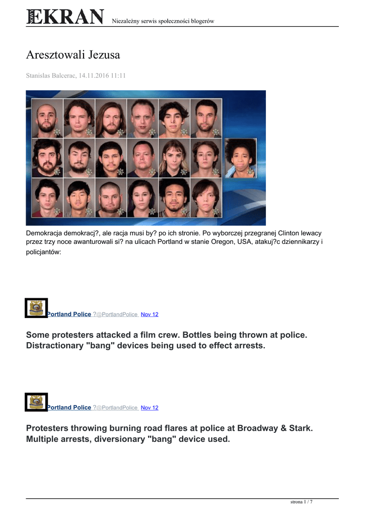 Niezależny serwis społeczności blogerów Aresztowali Jezusa Stanislas Balcerac, 14.11.2016 11:11 Demokracja demokracj?, ale racja musi by? po ich stronie. Po wyborczej przegranej Clinton lewacy przez trzy noce awanturowali si? na ulicach Portland w stanie Oregon, USA, atakuj?c dziennikarzy i policjantów: Portland Police ?@PortlandPolice Nov 12 Some protesters attacked a film crew. Bottles being thrown at police. Distractionary "bang" devices being used to effect arrests. Portland Police ?@PortlandPolice Nov 12 Protesters throwing burning road flares at police at Broadway & Stark. Multiple arrests, diversionary "bang" device used. strona 1 / 7 Niezależny serwis społeczności blogerów Stan Oregon (Bia?ystok USA) jest jednym z ostatnich bastionów lewicy, obok post?powej Kalifornii, Hawajów Obamy i ma?ego Rhode Island. Lewica zwalcza chrze?cija?stwo i promuje islam, ale sama te? wytworzy?a swój w?asny religijny dogmat, nienaruszalny oczywiscie, a ci którzy próbuj? go podwa?a? s? okrzykiwani heretykami i paleni na medialnym stosie. John Schindler ?@20committee 10.11 Postmodern liberalism is an ersatz religion. Core tenets of the faith aren't up for debate. Evidence is irrelevant. Heretics must be burned. Sze?? lat temu w Warszawie Robert Biedro? atakowa? policjanta swoj torebk?, czy?by po niedawnej ? wizycie Biedronia w Las Vegas sta? si? on now ikon? ameryka?skiej lewicy ? ? strona 2 / 7 Niezależny serwis społeczności blogerów Robert Biedro? ma ju? wida? swoich fanów w Portland, USA Policja w Portland zamiast u?ciska? i obca?owa? lewaków aresztowa?a 25 osób w czwartek, 19 w strona 3 / 7 Niezależny serwis społeczności blogerów pi?tek i 71 w sobot?. W niedziel? lewactwo ju? si? uspokoi?o. Patrz?c na fizjonomie aresztowanych lewaków (poni?ej ci aresztowani w sobot?) wida?, ?e niektórzy s? pod wp?ywem Sorosa a niektórzy pod wp?ywem crystal meth. Nie wiemy czy kto? z nas chcia?by mie? tych "obro?ców demokracji" jako s?siadów ? Obro cy demokracji czyli "m?odzi i wykszta?ceni z du?ych miast i wsi" ? strona 4 / 7 Niezależny serwis społeczności blogerów Wbrew temu co nam wciska Wyborcza i pose? Szejnfeld, to nie ogolone pa?y s? zagro?eniem dla demokracji tylko na?pani hipsterzy z d?ugimi w?osami i brodami. Lewacy i anarchi?ci od d?u?szego czasu siej? postrach tak?e w Europie, od Londynu po Berlin. Agresja, nietolerancja i nienawi?? to niestety dogmaty post?powej lewicy. Lewackie bojówki w Portland, USA strona 5 / 7 Niezależny serwis społeczności blogerów Lewackie bojówki w Pary?u Lewackie bojówki w Berlinie strona 6 / 7 Niezależny serwis społeczności blogerów Lewackie bojówki w Londynie strona 7 / 7 Powered by TCPDF (www.tcpdf.org)