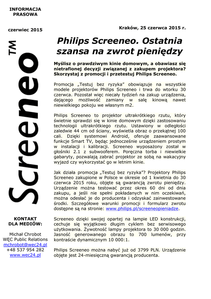 INFORMACJA PRASOWA czerwiec 2015 Kraków, 25 czerwca 2015 r. Philips Screeneo. Ostatnia szansa na zwrot pieniędzy Myślisz o prawdziwym kinie domowym, a obawiasz się nietrafionej decyzji związanej z zakupem projektora? Skorzystaj z promocji i przetestuj Philips Screeneo. Promocja „Testuj bez ryzyka” obowiązuje na wszystkie modele projektorów Philips Screeneo i trwa do wtorku 30 czerwca. Pozostał więc niecały tydzień na zakup urządzenia, dającego możliwość zamiany w salę kinową nawet niewielkiego pokoju we własnym m2. Philips Screeneo to projektor ultrakrótkiego rzutu, który świetnie sprawdzi się w kinie domowym dzięki zastosowaniu technologii ultrakrótkiego rzutu. Ustawiony w odległości zaledwie 44 cm od ściany, wyświetla obraz o przekątnej 100 cali. Dzięki systemowi Android, oferuje zaawansowane funkcje Smart TV, będąc jednocześnie urządzeniem prostym w instalacji i kalibracji. Screeneo wyposażony został w głośniki 2.1 z subwooferem. Poręczna torba i niewielkie gabaryty, pozwalają zabrać projektor ze sobą na wakacyjny wyjazd czy wykorzystać go w letnim kinie. Jak działa promocja „Testuj bez ryzyka”? Projektory Philips Screeneo zakupione w Polsce w okresie od 1 kwietnia do 30 czerwca 2015 roku, objęte są gwarancją zwrotu pieniędzy. Urządzenie można testować przez okres 60 dni od dnia zakupu, a jeśli nie spełni pokładanych w nim oczekiwań, można odesłać je do producenta i odzyskać zainwestowane środki. Szczegółowe warunki promocji i formularz zwrotu dostępne są na stronie: www.philips.pl/screeneopieniadze. KONTAKT DLA MEDIÓW: Michał Chrobot WĘC Public Relations [email protected] +48 537 954 282 www.wec24.pl Screeneo dzięki swojej opartej na lampie LED konstrukcji, cechuje się wyjątkowo długim cyklem bez serwisowego użytkowania. Żywotność lampy projektora to 30 000 godzin. Jasność generowanego obrazu to 700 lumenów, przy kontraście dynamicznym 10 000:1. Philips Screeneo można nabyć już od 3799 PLN. Urządzenie objęte jest 24-miesięczną gwarancją producenta. INFORMACJA PRASOWA czerwiec 2015 Tagi: projektory, Philips Screeneo, kino domowe, Ultra-Short Throw, ultra krótki rzut, LED, Android, SD, HDMI, WiFi, DLNA, Miracast, projektor do domu, promocje, Sagemcom, okazje, CashBack, promocja na projektor Szczegółowe warunki oferty promocyjnej: www.philips.pl/screeneopieniadze Więcej informacji o projektorze Screeneo: www.screeneo.eu Philips Screeneo – prezentacje wideo: https://youtu.be/HLoynDI2Zes https://youtu.be/ELjLZFCMno4 O firmie Sagemcom Sagemcom to holding technologiczny o rodowodzie francuskim, działający w skali globalnej. Firma jest uznanym dostawcą nowoczesnych rozwiązań komunikacyjnych. Specjalizuje się w komunikacji szerokopasmowej oraz telekomunikacji, oferując zarówno urządzenia dla profesjonalistów, jak i ogółu społeczeństwa. Marka Philips jest własnością Koninklijke Philips Electronics N.V. i jest wykorzystywana przez Sagemcom na mocy przyznanej licencji. Pozostałe nazwy zostały użyte wyłącznie w celach informacyjnych i mogą być zastrzeżonymi znakami handlowymi ich prawnych właścicieli. KONTAKT DLA MEDIÓW: Michał Chrobot WĘC Public Relations [email protected] +48 537 954 282 www.wec24.pl