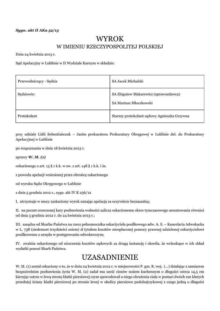 Sygn. akt II AKa 52/13 WYROK W IMIENIU RZECZYPOSPOLITEJ POLSKIEJ Dnia 24 kwietnia 2013 r. Sąd Apelacyjny w Lublinie w II Wydziale Karnym w składzie: Przewodniczący - Sędzia SA Jacek Michalski Sędziowie: SA Zbigniew Makarewicz (sprawozdawca) SA Mariusz Młoczkowski Protokolant Starszy protokolant sądowy Agnieszka Grzywna przy udziale Lidii Sobestiańczuk – Jasim prokuratora Prokuratury Okręgowej w Lublinie del. do Prokuratury Apelacyjnej w Lublinie po rozpoznaniu w dniu 18 kwietnia 2013 r. sprawy W. M. (1) oskarżonego z art. 13 § 1 k.k. w zw. z art. 148 § 1 k.k. i in. z powodu apelacji wniesionej przez obrońcę oskarżonego od wyroku Sądu Okręgowego w Lublinie z dnia 5 grudnia 2012 r., sygn. akt IV K 256/12 I. utrzymuje w mocy zaskarżony wyrok uznając apelację za oczywiście bezzasadną; II. na poczet orzeczonej kary pozbawienia wolności zalicza oskarżonemu okres tymczasowego aresztowania również od dnia 5 grudnia 2012 r. do 24 kwietnia 2013 r.; III. zasądza od Skarbu Państwa na rzecz pełnomocnika oskarżyciela posiłkowego adw. A. S. – Kancelaria Adwokacka w L. 738 (siedemset trzydzieści osiem) zł tytułem kosztów nieopłaconej pomocy prawnej udzielonej oskarżycielowi posiłkowemu z urzędu w postępowaniu odwoławczym; IV. zwalnia oskarżonego od uiszczenia kosztów sądowych za drugą instancję i określa, że wchodzące w ich skład wydatki ponosi Skarb Państwa. UZASADNIENIE W. M. (1) został oskarżony o to, że w dniu 24 kwietnia 2012 r. w miejscowości P. gm. R. woj. (...) działając z zamiarem bezpośrednim pozbawienia życia W. M. (2) zadał mu sześć ciosów nożem kuchennym o długości ostrza 14,5 cm kierując ostrze w lewą stronę klatki piersiowej czym spowodował u niego obrażenia ciała w postaci dwóch ran kłutych przedniej ściany klatki piersiowej po stronie lewej w okolicy piersiowo podobojczykowej z czego jedną o długości 2,5 cm drążącą przyśrodkowo i w górę do przestrzeni międzyżebrowej oraz do jamy opłucnej a drugą o długości 3 cm drążącą ku dołowi w obszar mięśnia piersiowego z jego uszkodzeniem i krwiakiem, odmy i krwiaka opłucnej lewej, czterech ran ręki prawej w tym ranę punktową na grzbiecie prawego śródręcza zlokalizowaną na poziomie fałdu międzypalcowego I - II, ranę paliczka prawego z uszkodzeniem ścięgna prostownika, ranę prawego śródręcza na poziomie I kości śródręcza oraz ranę dłoniowej powierzchni prawej ręki - ranę ziejącą z głębokim uszkodzeniem mięśni kłębu kciuka, które to obrażenia spowodowały u pokrzywdzonego naruszenie czynności narządów ciała na okres powyżej 7 dni, przy czym zamierzonego celu nie osiągnął z uwagi na postawę pokrzywdzonego i natychmiastowe udzielenie pokrzywdzonemu pomocy medycznej tj. przestępstwo z art. 13 § 1 kk w zw. z art. 148 § 1 kk w zb. z art. 157 § 1 kk w zw. z art. 11 § 2 kk Wyrokiem z dnia 5 grudnia 2012 roku Sąd Okręgowy w Lublinie oskarżonego W. M. (1) uznał za winnego tego, że: w dniu 24 kwietnia 2012 roku w miejscowości P. gm. R. woj. (...) przewidując możliwość pozbawienia życia W. M. (2) i godząc się na to zadał mu co najmniej cztery ciosy nożem kuchennym o długości ostrza 14,5 cm w okolice lewej strony klatki piersiowej w wyniku czego doznał on obrażeń ciała w postaci dwóch ran kłutych przedniej ściany klatki piersiowej po stronie lewej w okolicy piersiowo podobojczykowej z czego jedna o długości 2,5 cm drążąca przyśrodkowo i w górę do przestrzeni międzyżebrowej oraz do jamy opłucnej, a druga o długości 3 cm drążąca ku dołowi w obszar mięśnia piersiowego z jego uszkodzeniem i krwiakiem, odmy i krwiaka opłucnej lewej, czterech ran ręki prawej w tym ranę punktową na grzbiecie prawego śródręcza zlokalizowaną na poziomie fałdu międzypalcowego I - II, ranę paliczka prawego z uszkodzeniem ścięgna prostownika, ranę prawego śródręcza na poziomie I kości śródręcza oraz ranę dłoniowej powierzchni prawej ręki - ranę ziejącą z głębokim uszkodzeniem mięśni kłębu kciuka, które to obrażenia spowodowały u pokrzywdzonego naruszenie czynności narządów ciała na okres powyżej 7 dni, przy czym zamierzonego celu nie osiągnął z uwagi na postawę pokrzywdzonego i natychmiastowe udzielenie pokrzywdzonemu pomocy medycznej tj. czynu z art. 13 § 1 kk w zw. z art. 148 § 1 kk w zb. z art. 157 § 1 kk w zw. z art. 11 § 2 kk i za czyn ten na mocy powołanych przepisów przyjmując za podstawę wymiaru kary art. 14 § 1 kk w zw. z art. 148 § 1 kk w zw. z art. 11 § 3 kk skazał go na karę 8 ( ośmiu ) lat pozbawienia wolności; Na podstawie art. 63 § 1 kk na poczet orzeczonej kary pozbawienia wolności zaliczył oskarżonemu okres rzeczywistego pozbawienia wolności w sprawie od dnia 24 kwietnia 2012 r. do dnia 5 grudnia 2012 r.; Na zasadzie art. 44 § 2 kk orzekł przepadek dowodu rzeczowego w postaci noża kuchennego ujętego w wykazie dowodów rzeczowych na k. 173 11/123/12 pod poz. 11; Na podstawie art. 46 § 2 kk orzekł od oskarżonego na rzecz pokrzywdzonego W. M. (2) nawiązkę w kwocie 10.000 zł ( dziesięć tysięcy złotych ); Na zasadzie art. 230 § 2 kpk orzekł zwrot W. M. (1) dowodów rzeczowych ujętych w wykazie na k. 171 1/122/12 pod poz. 1-7, na k. 173 11/123/12 pod poz. 8-10 i na k. 247 Y/135/12 pod poz. 1 oraz W. M. (2) ujętych w wykazie na k. 175 III/124/12 pod poz. 12-15; Zasądził od Skarbu Państwa na rzecz pełnomocnika oskarżyciela posiłkowego adw. A. S. - Kancelaria Adwokacka w L. kwotę 885,60 zł ( osiemset osiemdziesiąt pięć złotych 60/100 ) tytułem udzielonej pomocy prawnej z urzędu; Zwolnił oskarżonego od uiszczenia kosztów sądowych, zaś wydatkami obciążył Skarb Państwa. Obrońca oskarżonego: I. Na podstawie art. 444 k.p.k. zaskarżył powyższy wyrok w całości na korzyść oskarżonego. II a. Na mocy art. 427 § 2 k.p.k. w zw. z art. 438 pkt 3 k.p.k. zaskarżonemu wyrokowi zarzucił: - b