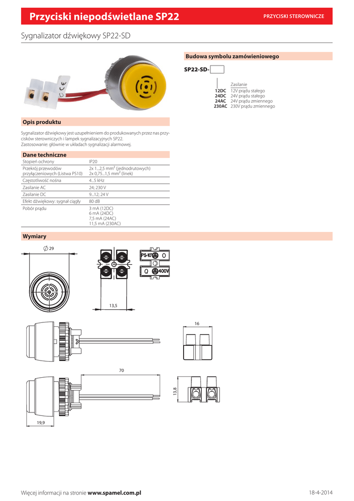 Przyciski niepodświetlane SP22 PRZYCISKI STEROWNICZE Sygnalizator dźwiękowy SP22-SD Budowa symbolu zamówieniowego SP22-SD12DC 24DC 24AC 230AC Zasilanie 12V prądu stałego 24V prądu stałego 24V prądu zmiennego 230V prądu zmiennego Opis produktu Sygnalizator dźwiękowy jest uzupełnieniem do produkowanych przez nas przycisków sterowniczych i lampek sygnalizacyjnych SP22. Zastosowanie: głównie w układach sygnalizacji alarmowej. Dane techniczne Stopień ochrony Przekrój przewodów przyłączeniowych (Listwa PS10) Częstotliwość nośna Zasilanie AC Zasilanie DC Efekt dźwiękowy: sygnał ciągły Pobór prądu IP20 2x 1...2,5 mm² (jednodrutowych) 2x 0,75...1,5 mm² (linek) 4...5 kHz 24; 230 V 9...12; 24 V 80 dB 3 mA (12DC) 6 mA (24DC) 7,5 mA (24AC) 11,5 mA (230AC) Wymiary 29 13,5 16 13,8 70 19,9 Więcej informacji na stronie www.spamel.com.pl 18-4-2014