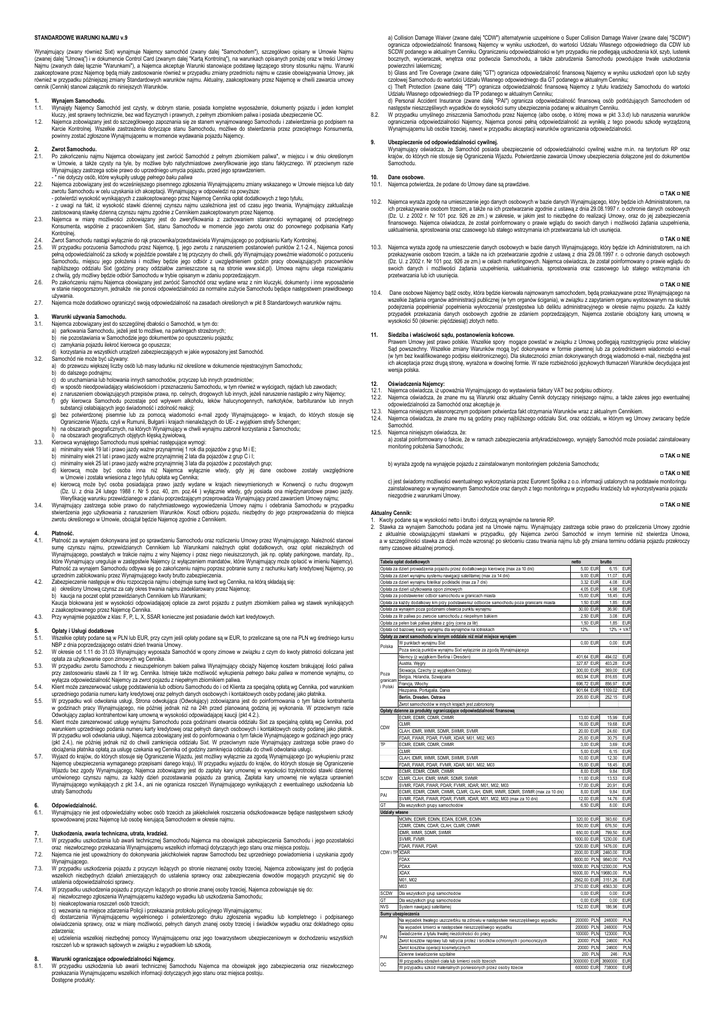 STANDARDOWE WARUNKI NAJMU v.9 Wynajmujący (zwany również Sixt) wynajmuje Najemcy samochód (zwany dalej "Samochodem"), szczegółowo opisany w Umowie Najmu (zwanej dalej "Umową") i w dokumencie Control Card (zwanym dalej "Kartą Kontrolną"), na warunkach opisanych poniżej oraz w treści Umowy Najmu (zwanych dalej łącznie "Warunkami"), a Najemca akceptuje Warunki stanowiące podstawę łączącego strony stosunku najmu. Warunki zaakceptowane przez Najemcę będą miały zastosowanie również w przypadku zmiany przedmiotu najmu w czasie obowiązywania Umowy, jak również w przypadku późniejszej zmiany Standardowych warunków najmu. Aktualny, zaakceptowany przez Najemcę w chwili zawarcia umowy cennik (Cennik) stanowi załącznik do niniejszych Warunków. 1. 1.1. 1.2. 2. 2.1. 2.2. 2.3. 2.4. 2.5. 2.6. 2.7. 3. 3.1. 3.2. 3.3. 3.4. 4. 4.1. 4.2. 4.3. 5. 5.1. 5.2. 5.3. 5.4. 5.5. 5.6. 5.7. Wynajem Samochodu. Wynajęty Najemcy Samochód jest czysty, w dobrym stanie, posiada kompletne wyposażenie, dokumenty pojazdu i jeden komplet kluczy, jest sprawny technicznie, bez wad fizycznych i prawnych, z pełnym zbiornikiem paliwa i posiada ubezpieczenie OC. Najemca zobowiązany jest do szczegółowego zapoznania się ze stanem wynajmowanego Samochodu i zatwierdzenia go podpisem na Karcie Kontrolnej. Wszelkie zastrzeżenia dotyczące stanu Samochodu, możliwe do stwierdzenia przez przeciętnego Konsumenta, powinny zostać zgłoszone Wynajmującemu w momencie wydawania pojazdu Najemcy. Zwrot Samochodu. Po zakończeniu najmu Najemca obowiązany jest zwrócić Samochód z pełnym zbiornikiem paliwa*, w miejscu i w dniu określonym w Umowie, a także czysty na tyle, by możliwe było natychmiastowe zweryfikowanie jego stanu faktycznego. W przeciwnym razie Wynajmujący zastrzega sobie prawo do uprzedniego umycia pojazdu, przed jego sprawdzeniem. - * nie dotyczy osób, które wykupiły usługę pełnego baku paliwa Najemca zobowiązany jest do wcześniejszego pisemnego zgłoszenia Wynajmującemu zmiany wskazanego w Umowie miejsca lub daty zwrotu Samochodu w celu uzyskania ich akceptacji. Wynajmujący w odpowiedzi na powyższe: - potwierdzi wysokość wynikających z zaakceptowanego przez Najemcę Cennika opłat dodatkowych z tego tytułu, - z uwagi na fakt, iż wysokość stawki dziennej czynszu najmu uzależniona jest od czasu jego trwania, Wynajmujący zaktualizuje zastosowaną stawkę dzienną czynszu najmu zgodnie z Cennikiem zaakceptowanym przez Najemcę. Najemca w miarę możliwości zobowiązany jest do zweryfikowania z zachowaniem staranności wymaganej od przeciętnego Konsumenta, wspólnie z pracownikiem Sixt, stanu Samochodu w momencie jego zwrotu oraz do ponownego podpisania Karty Kontrolnej. Zwrot Samochodu nastąpi wyłącznie do rąk pracownika/przedstawiciela Wynajmującego po podpisaniu Karty Kontrolnej. W przypadku porzucenia Samochodu przez Najemcę, tj. jego zwrotu z naruszeniem postanowień punktów 2.1-2.4., Najemca ponosi pełną odpowiedzialność za szkody w pojeździe powstałe z tej przyczyny do chwili, gdy Wynajmujący poweźmie wiadomość o porzuceniu Samochodu, miejscu jego położenia i możliwy będzie jego odbiór z uwzględnieniem godzin pracy obowiązujących pracowników najbliższego oddziału Sixt (godziny pracy oddziałów zamieszczone są na stronie www.sixt.pl). Umowa najmu ulega rozwiązaniu z chwilą, gdy możliwy będzie odbiór Samochodu w trybie opisanym w zdaniu poprzedzającym. Po zakończeniu najmu Najemca obowiązany jest zwrócić Samochód oraz wydane wraz z nim kluczyki, dokumenty i inne wyposażenie w stanie niepogorszonym, jednakże nie ponosi odpowiedzialności za normalne zużycie Samochodu będące następstwem prawidłowego używania. Najemca może dodatkowo ograniczyć swoją odpowiedzialność na zasadach określonych w pkt 8 Standardowych warunków najmu. Warunki używania Samochodu. Najemca zobowiązany jest do szczególnej dbałości o Samochód, w tym do: a) parkowania Samochodu, jeżeli jest to możliwe, na parkingach strzeżonych; b) nie pozostawiania w Samochodzie jego dokumentów po opuszczeniu pojazdu; c) zamykania pojazdu ilekroć kierowca go opuszcza; d) korzystania ze wszystkich urządzeń zabezpieczających w jakie wyposażony jest Samochód. Samochód nie może być używany: a) do przewozu większej liczby osób lub masy ładunku niż określone w dokumencie rejestracyjnym Samochodu; b) do dalszego podnajmu; c) do uruchamiania lub holowania innych samochodów, przyczep lub innych przedmiotów; d) w sposób nieodpowiadający właściwościom i przeznaczeniu Samochodu, w tym również w wyścigach, rajdach lub zawodach; e) z naruszeniem obowiązujących przepisów prawa, np. celnych, drogowych lub innych, jeżeli naruszenie nastąpiło z winy Najemcy; f) gdy kierowca Samochodu pozostaje pod wpływem alkoholu, leków halucynogennych, narkotyków, barbituranów lub innych substancji osłabiających jego świadomość i zdolność reakcji; g) bez potwierdzonej pisemnie lub za pomocą wiadomości e-mail zgody Wynajmującego- w krajach, do których stosuje się Ograniczenie Wjazdu, czyli w Rumunii, Bułgarii i krajach nienależących do UE- z wyjątkiem strefy Schengen; h) na obszarach geograficznych, na których Wynajmujący w chwili wynajmu zabronił korzystania z Samochodu; i) na obszarach geograficznych objętych klęską żywiołową. Kierowca wynajętego Samochodu musi spełniać następujące wymogi: a) minimalny wiek 19 lat i prawo jazdy ważne przynajmniej 1 rok dla pojazdów z grup M i E; b) minimalny wiek 21 lat i prawo jazdy ważne przynajmniej 2 lata dla pojazdów z grup C i I; c) minimalny wiek 25 lat i prawo jazdy ważne przynajmniej 3 lata dla pojazdów z pozostałych grup; d) kierowcą może być osoba inna niż Najemca wyłącznie wtedy, gdy jej dane osobowe zostały uwzględnione w Umowie i została wniesiona z tego tytułu opłata wg Cennika; e) kierowcą może być osoba posiadająca prawo jazdy wydane w krajac