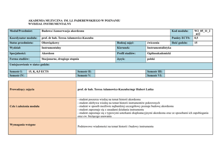 AKADEMIA MUZYCZNA IM. I.J. PADEREWSKIEGO W POZNANIU WYDZIAŁ INSTRUMENTALNY Moduł/Przedmiot: Budowa i konserwacja akordeonu Kod modułu: Koordynator modułu: prof. dr hab. Teresa Adamowicz-Kaszuba Punkty ECTS: W2_05_11_2 _022 0,5 Status przedmiotu: Obowiązkowy Rodzaj zajęć: ćwiczenia Ilość godzin: 15 Wydział: Instrumentalny Kierunek: Instrumentalistyka Specjalności: Akordeon Profil studiów: Ogólnoakademicki Forma studiów: Stacjonarne, drugiego stopnia Język: polski Umiejscowienie w siatce godzin: Semestr I: Semestr IV: 15, K, 0,5 ECTS Prowadzący zajęcia Cele i założenia modułu Wymagania wstępne Semestr II: Semestr V: Semestr III: Semestr VI: prof. dr hab. Teresa Adamowicz-Kaszuba/mgr Hubert Lutka - student poszerza wiedzę na temat historii akordeonu - student zdobywa wiedzę na temat historii instrumentów pokrewnych - student w sposób możliwie najbardziej szczegółowy poznaje budowę akordeonu - student zapoznaje się z zasadami działania instrumentu - student zapoznaje się z typowymi usterkami eksploatacyjnymi akordeonu oraz ze sposobami ich zapobiegania oraz ew. bieżącego usuwania Podstawowe wiadomości na temat historii i budowy instrumentu TREŚCI PROGRAMOWE MODUŁU (przedmiotu) Semestr I Historia instrumentów ze stroikiem przelotowym oraz instrumentów z ręcznym miechem Historia akordeonu – tradycja, stan aktualny, tendencje rozwojowe Budowa akordeonu: podstawowe części instrumentu, ich rola, wielkość i skala instrumentu, systemy klawiatur, miech, stroiki, używane materiały, waga Systemy regestrowe – zasady działania Strojenie akordeonu – zasady, konieczne warunki, oprzyrządowanie i kompetencje stroiciela akordeonów Sposoby korygowania typowych usterek akordeonów w warunkach lekcyjnych czy koncertowych Liczba godzin 15 2 2 2 3 3 3 Kod efektu Wiedza (W) Umiejętności (U) Kompetencje społeczne (K) EFEKTY KSZTAŁCENIA MODUŁU (przedmiotu) W01 Student posiada gruntowną wiedzę dotyczącą budowy instrumentu, zasad eksploatacji, konserwacji. W02 Student rozumie wzajemne relacje pomiędzy teoretycznymi i praktycznymi elementami studiów. U01 Student posiada zdolność do integrowania nabytej wiedzy z praktycznymi umiejętnościami. U02 Student potrafi dokonać korekty typowych usterek instrumentu Student dostosowuje się do warunków stawianych przez współczesny rynek pracy K01 Efekt kształcenia w obszarze kształcenia K_W08 K_W07 K_U01 K_U03 K_U05 K_K01 K_K03 K_K05 Metody kształcenia Metody weryfikacji efektów kształcenia Forma i warunki zaliczenia przedmiotu wykład problemowy wykład konwersatoryjny rozwiązywanie zadań praca indywidualna sesje rozwiązywania problemu inne metody stosowane przez prowadzącego Wymagania końcowe – zaliczenie roku, forma oceny zaliczenie realizacja zleconego zadania wszystkie inne metody stosowane przez prowadzącego Warunki zaliczenia: Nr efektu W01 U01 K01 W02 U02 U01 K01 W01 U02 W02 Zaliczenie przedmiotu uwarunkowane jest uczęszczaniem na zajęcia (kontrola obecności), osiągnięciem założonych efektów kształcenia (w minimalnym akceptowalnym stopniu – w wysokości powyżej 50%) oraz wykonywaniem zadań zleconych przez prowadzącego w czasie trwania zajęć. Warunki egzaminu: Inne: Semestr I: Zaliczenie Semestr II: Semestr III: Semestr IV: Semestr V: Semestr VI: NAKŁAD PRACY STUDENTA – ILOŚĆ PUNKTÓW ECTS Godziny realizowane przy bezpośrednim udziale nauczyciela akademickiego Ilość godzin samodzielnej pracy studenta w czasie trwania przedmiotu Zajęcia dydaktyczne: Konsultacje: Ilość godzin egzaminu: Suma: Przygotowywanie się do zajęć Przygotowywanie się do ostatecznego zaliczenia/zdania egzaminu Przygotowywanie się do prezentacji w czasie trwania semestru Suma: Inne Sumaryczny nakład pracy: Ilość godzin: 15 x x 15 Punkty ECTS: x x x x 0,5 x x 0,5 (100 %) x x x x 15 0,5 Literatura podstawowa W.L. Puchnowski Z historii akordeonu i instrumentów pokrewnych [w:]Akordeon ad A do Z, PWM Kraków 1966 The New Grove Dictionary of Music and Musicians J. Łukasiewicz Współczesne metody strojenia akordeonów, AMFC Warszawa 2001 Literatura uzupełniająca H. Lutka Stan aktualny i tendecje rozwojowe instrumentarium ze stroikiem przelotowym w świetle doświadczeń z praktyki zawodowej w ramach programu Erasmus w fabryce akordeonów Scandalli w Castelfidardo, Włochy, niepublikowana praca dyplomowa, AM Poznań 2014 Biblioteki wirtualne i zasoby on-line MOŻLIWOŚCI KARIERY ZAWODOWEJ Zasady budowy i strojenia instrumentu to przedmiot niezbędny dla klawesynisty, koncertującego zarówno solo, jak i w zespołach kameralnych. Umiejętność strojenia instrumentu jest bazą dla dobrego wykonania utworu muzycznego oraz dla właściwego współdziałania w zespole kameralnym. Przedmiot ten w sposób bardzo praktyczny przygotowuje studenta do przyszłego życia zawodowego.
