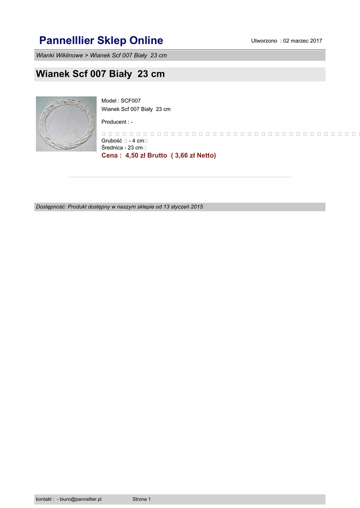 Pannelllier Sklep Online Utworzono : 02 marzec 2017 Wianki Wiklinowe > Wianek Scf 007 Biały 23 cm Wianek Scf 007 Biały 23 cm Model : SCF007 Wianek Scf 007 Biały 23 cm Producent : - �������������������������������������� Grubość �- 4 cm� Średnica - 23 cm� Cena : 4,50 zł Brutto ( 3,66 zł Netto) Dostępność: Produkt dostępny w naszym sklepie od 13 styczeń 2015 kontakt : - [email protected] Strona 1