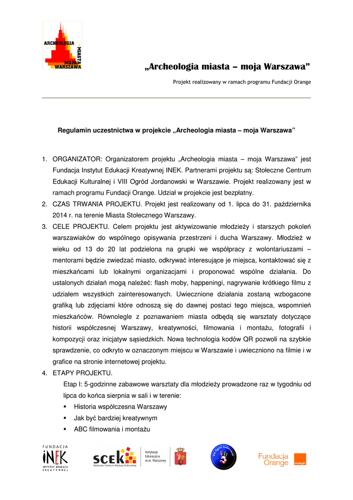 „Archeologia miasta – moja Warszawa” Projekt realizowany w ramach programu Fundacji Orange Regulamin uczestnictwa w projekcie „Archeologia miasta – moja Warszawa” 1. ORGANIZATOR: Organizatorem projektu „Archeologia miasta – moja Warszawa” jest Fundacja Instytut Edukacji Kreatywnej INEK. Partnerami projektu są: Stołeczne Centrum Edukacji Kulturalnej i VIII Ogród Jordanowski w Warszawie. Projekt realizowany jest w ramach programu Fundacji Orange. Udział w projekcie jest bezpłatny. 2. CZAS TRWANIA PROJEKTU. Projekt jest realizowany od 1. lipca do 31. października 2014 r. na terenie Miasta Stołecznego Warszawy. 3. CELE PROJEKTU. Celem projektu jest aktywizowanie młodzieży i starszych pokoleń warszawiaków do wspólnego opisywania przestrzeni i ducha Warszawy. Młodzież w wieku od 13 do 20 lat podzielona na grupki we współpracy z wolontariuszami – mentorami będzie zwiedzać miasto, odkrywać interesujące je miejsca, kontaktować się z mieszkańcami lub lokalnymi organizacjami i proponować wspólne działania. Do ustalonych działań mogą należeć: flash moby, happeningi, nagrywanie krótkiego filmu z udziałem wszystkich zainteresowanych. Uwiecznione działania zostaną wzbogacone grafiką lub zdjęciami które odnoszą się do dawnej postaci tego miejsca, wspomnień mieszkańców. Równolegle z poznawaniem miasta odbędą się warsztaty dotyczące historii współczesnej Warszawy, kreatywności, filmowania i montażu, fotografii i kompozycji oraz inicjatyw sąsiedzkich. Nowa technologia kodów QR pozwoli na szybkie sprawdzenie, co odkryto w oznaczonym miejscu w Warszawie i uwieczniono na filmie i w grafice na stronie internetowej projektu. 4. ETAPY PROJEKTU. Etap I: 5-godzinne zabawowe warsztaty dla młodzieży prowadzone raz w tygodniu od lipca do końca sierpnia w sali i w terenie: Historia współczesna Warszawy Jak być bardziej kreatywnym ABC filmowania i montażu – moja Warszawa” Projekt realizowany w ramach programu Fundacji Orange Co zrobić ze zdjęciami, czyli okiem artysty Jak rozkręcić dzielnicę, czyli inicjatywy sąsiedzkie Terminy warsztatów zostaną ustalone pod koniec rekrutacji. Etap II: Zwiedzanie Warszawy z przewodnikami i pasjonatami historykami. W tym czasie powstają zdjęcia, które zostaną wybrane i poddane graficznej obróbce celem umieszczenia na stronie projektu. W tym czasie młodzież uczy się na warsztatach i w praktyce kompozycji, filmowania i montażu, a także podstaw grafiki. Etap III: Młodzież podzielona na zespoły, wraz z opiekunami i liderami zespołów odkrywa Warszawę, podróżując komunikacją miejską lub rowerami. Młodzież inicjuje kontakty z lokalnymi organizacjami i mieszkańcami w celu nagrania wywiadów z chętnymi osobami. Etap IV: Młodzież namawia innych do kolejnego etapu, którym jest przygotowanie happeningu w wybranej formie i w wybranym miejscu. W happeningu biorą udział wszyscy zainteresowani, również mieszkańcy wybranej dzielnicy lub osiedla. Organizator projektu może pokryć część kosztów happeningu. Etap V: Młodzież przygotowuje ostateczne wersje filmów i galerii na stronę projektu. Chętne osoby zamieszczają wywiady, stare zdjęcia, grafiki, mogą też prowadzić bloga. Etap ten kończy się najpóźniej 15 października i zakończony jest ankietą ewaluacyjną. 5. Na prośbę uczestnika Organizator zapewnia bilet miesięczny ZTM. Organizator pokrywa koszty materiałów plastycznych i poczęstunku na czas warsztatów. 6. Organizator wykupuje uczestnikom i opiekunom grup – wolontariuszom ubezpieczenie NNW na czas zwiedzania miasta. 7. Grupa młodzieży uczestniczącej w warsztatach jest ograniczona. Liczy się kolejność zgłoszeń. Powstaje lista osób oczekujących, z którymi Organizator kontaktuje się w razie wycofania się innego uczestnika. 8. W projekcie rekrutowani są też wolontariusze – opiekunowie grup. Ich głównym zadaniem jest dopilnowanie, aby działania projektu i komunikacja między uczestnikami przebiegały sprawnie. Ponadto oczekuje się od opiekuna pomocy merytorycznej, np. przy wyborze miejsc do zwiedzania, kontaktowaniu się z organizacjami i mieszkańcami, przygotowaniu happeningu. Praca opiekuna trwa do końca projektu. Opiekun jest – moja Warszawa” Projekt realizowany w ramach programu Fundacji Orange zobowiązany do podpisania umowy wolontariackiej i otrzymuje ubezpieczenie NNW. Opiekun może korzystać z uczestnictwa w wycieczkach z przewodnikiem, w warsztatach i z możliwości zakupu biletu miesięcznego ZTM. 9. Pozostali uczestnicy, to jest warszawiacy – wolontariusze chętni do współdziałania w projekcie przyjmowani są bez ograniczeń. Forma współdziałania zostaje uzgodniona z Organizatorem w momencie zgłaszania się i może być modyfikowana lub rozszerzona w trakcie trwania projektu. Wszyscy wolontariusze biorący udział w projekcie wypełniają krótkie karty pracy, zawierające datę, ilość godzin i rodzaj działania. 10. ZGŁOSZENIA I REKRUTACJA: Rekrutacja młodzieży do projektu trwa do 25 lipca. W przypadku niewystarczającej liczby zgłaszających się termin ten może zostać przedłużony. Osoby zgłaszające się do projektu i do warsztatów są zobowiązane do uczestniczenia we wszystkich etapach projektu. Rezygnacja w trakcie trwania projektu jest możliwa tylko w wyjątkowych przypadkach i musi być uzasadniona pisemnie przez opiekuna uczestnika. Przyjmowanie zgłoszeń pozostałych chętnych trwa do 31 sierpnia z możliwością przedłużenia. Zapisy odbywają się poprzez wypełnienie i podpisanie odręczne kart zgłoszeniowych do pobrania na stronie: www.inek.pl w zakładce projektu „Archeologia miasta – moja Warszawa” oraz odesłanie ich na adres: [email protected]. 11. DANE OSOBOWE. W przypadku młodzieży uczestniczącej w projekcie niezbędne jest podanie danych osobowych i kontaktowych w celu wykupienia ubezpieczenia NNW. Przyjęcie zaproszenia do udziału w projekcie, oznacza zgod