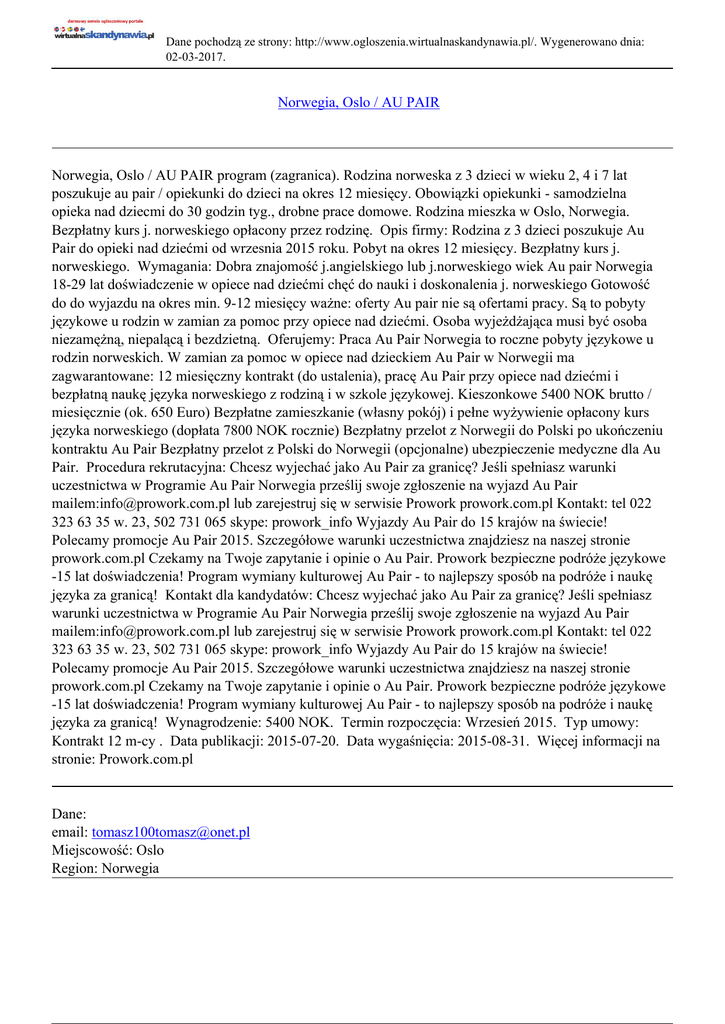 Dane pochodzą ze strony: http://www.ogloszenia.wirtualnaskandynawia.pl/. Wygenerowano dnia: 02-03-2017. Norwegia, Oslo / AU PAIR Norwegia, Oslo / AU PAIR program (zagranica). Rodzina norweska z 3 dzieci w wieku 2, 4 i 7 lat poszukuje au pair / opiekunki do dzieci na okres 12 miesięcy. Obowiązki opiekunki - samodzielna opieka nad dziecmi do 30 godzin tyg., drobne prace domowe. Rodzina mieszka w Oslo, Norwegia. Bezpłatny kurs j. norweskiego opłacony przez rodzinę. Opis firmy: Rodzina z 3 dzieci poszukuje Au Pair do opieki nad dziećmi od wrzesnia 2015 roku. Pobyt na okres 12 miesięcy. Bezpłatny kurs j. norweskiego. Wymagania: Dobra znajomość j.angielskiego lub j.norweskiego wiek Au pair Norwegia 18-29 lat doświadczenie w opiece nad dziećmi chęć do nauki i doskonalenia j. norweskiego Gotowość do do wyjazdu na okres min. 9-12 miesięcy ważne: oferty Au pair nie są ofertami pracy. Są to pobyty językowe u rodzin w zamian za pomoc przy opiece nad dziećmi. Osoba wyjeżdżająca musi być osoba niezamężną, niepalącą i bezdzietną. Oferujemy: Praca Au Pair Norwegia to roczne pobyty językowe u rodzin norweskich. W zamian za pomoc w opiece nad dzieckiem Au Pair w Norwegii ma zagwarantowane: 12 miesięczny kontrakt (do ustalenia), pracę Au Pair przy opiece nad dziećmi i bezpłatną naukę języka norweskiego z rodziną i w szkole językowej. Kieszonkowe 5400 NOK brutto / miesięcznie (ok. 650 Euro) Bezpłatne zamieszkanie (własny pokój) i pełne wyżywienie opłacony kurs języka norweskiego (dopłata 7800 NOK rocznie) Bezpłatny przelot z Norwegii do Polski po ukończeniu kontraktu Au Pair Bezpłatny przelot z Polski do Norwegii (opcjonalne) ubezpieczenie medyczne dla Au Pair. Procedura rekrutacyjna: Chcesz wyjechać jako Au Pair za granicę? Jeśli spełniasz warunki uczestnictwa w Programie Au Pair Norwegia prześlij swoje zgłoszenie na wyjazd Au Pair mailem:[email protected] lub zarejestruj się w serwisie Prowork prowork.com.pl Kontakt: tel 022 323 63 35 w. 23, 502 731 065 skype: prowork_info Wyjazdy Au Pair do 15 krajów na świecie! Polecamy promocje Au Pair 2015. Szczegółowe warunki uczestnictwa znajdziesz na naszej stronie prowork.com.pl Czekamy na Twoje zapytanie i opinie o Au Pair. Prowork bezpieczne podróże językowe -15 lat doświadczenia! Program wymiany kulturowej Au Pair - to najlepszy sposób na podróże i naukę języka za granicą! Kontakt dla kandydatów: Chcesz wyjechać jako Au Pair za granicę? Jeśli spełniasz warunki uczestnictwa w Programie Au Pair Norwegia prześlij swoje zgłoszenie na wyjazd Au Pair mailem:[email protected] lub zarejestruj się w serwisie Prowork prowork.com.pl Kontakt: tel 022 323 63 35 w. 23, 502 731 065 skype: prowork_info Wyjazdy Au Pair do 15 krajów na świecie! Polecamy promocje Au Pair 2015. Szczegółowe warunki uczestnictwa znajdziesz na naszej stronie prowork.com.pl Czekamy na Twoje zapytanie i opinie o Au Pair. Prowork bezpieczne podróże językowe -15 lat doświadczenia! Program wymiany kulturowej Au Pair - to najlepszy sposób na podróże i naukę języka za granicą! Wynagrodzenie: 5400 NOK. Termin rozpoczęcia: Wrzesień 2015. Typ umowy: Kontrakt 12 m-cy . Data publikacji: 2015-07-20. Data wygaśnięcia: 2015-08-31. Więcej informacji na stronie: Prowork.com.pl Dane: email: [email protected] Miejscowość: Oslo Region: Norwegia