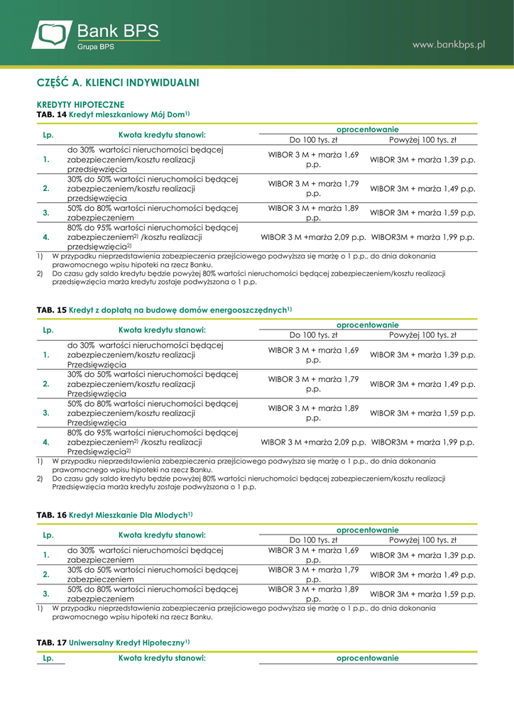 CZĘŚĆ A. KLIENCI INDYWIDUALNI KREDYTY HIPOTECZNE TAB. 14 Kredyt mieszkaniowy Mój Dom1) Lp. do 30% wartości nieruchomości będącej zabezpieczeniem/kosztu realizacji przedsięwzięcia 30% do 50% wartości nieruchomości będącej zabezpieczeniem/kosztu realizacji przedsięwzięcia 50% do 80% wartości nieruchomości będącej zabezpieczeniem 80% do 95% wartości nieruchomości będącej zabezpieczeniem2) /kosztu realizacji przedsięwzięcia2) 1. 2. 3. 4. 1) 2) Kwota kredytu stanowi: oprocentowanie Do 100 tys. zł Powyżej 100 tys. zł WIBOR 3 M + marża 1,69 p.p. WIBOR 3M + marża 1,39 p.p. WIBOR 3 M + marża 1,79 p.p. WIBOR 3M + marża 1,49 p.p. WIBOR 3 M + marża 1,89 p.p. WIBOR 3M + marża 1,59 p.p. WIBOR 3 M +marża 2,09 p.p. WIBOR3M + marża 1,99 p.p. W przypadku nieprzedstawienia zabezpieczenia przejściowego podwyższa się marżę o 1 p.p., do dnia dokonania prawomocnego wpisu hipoteki na rzecz Banku. Do czasu gdy saldo kredytu będzie powyżej 80% wartości nieruchomości będącej zabezpieczeniem/kosztu realizacji przedsięwzięcia marża kredytu zostaje podwyższona o 1 p.p. TAB. 15 Kredyt z dopłatą na budowę domów energooszczędnych1) Lp. do 30% wartości nieruchomości będącej zabezpieczeniem/kosztu realizacji Przedsięwzięcia 30% do 50% wartości nieruchomości będącej zabezpieczeniem/kosztu realizacji Przedsięwzięcia 50% do 80% wartości nieruchomości będącej zabezpieczeniem/kosztu realizacji Przedsięwzięcia 80% do 95% wartości nieruchomości będącej zabezpieczeniem2) /kosztu realizacji Przedsięwzięcia2) 1. 2. 3. 4. 1) 2) Kwota kredytu stanowi: oprocentowanie Do 100 tys. zł Powyżej 100 tys. zł WIBOR 3 M + marża 1,69 p.p. WIBOR 3M + marża 1,39 p.p. WIBOR 3 M + marża 1,79 p.p. WIBOR 3M + marża 1,49 p.p. WIBOR 3 M + marża 1,89 p.p. WIBOR 3M + marża 1,59 p.p. WIBOR 3 M +marża 2,09 p.p. WIBOR3M + marża 1,99 p.p. W przypadku nieprzedstawienia zabezpieczenia przejściowego podwyższa się marżę o 1 p.p., do dnia dokonania prawomocnego wpisu hipoteki na rzecz Banku. Do czasu gdy saldo kredytu będzie powyżej 80% wartości nieruchomości będącej zabezpieczeniem/kosztu realizacji Przedsięwzięcia marża kredytu zostaje podwyższona o 1 p.p. TAB. 16 Kredyt Mieszkanie Dla Mlodych1) Lp. do 30% wartości nieruchomości będącej zabezpieczeniem 30% do 50% wartości nieruchomości będącej zabezpieczeniem 50% do 80% wartości nieruchomości będącej zabezpieczeniem 1. 2. 3. 1) Kwota kredytu stanowi: oprocentowanie Do 100 tys. zł Powyżej 100 tys. zł WIBOR 3 M + marża 1,69 WIBOR 3M + marża 1,39 p.p. p.p. WIBOR 3 M + marża 1,79 WIBOR 3M + marża 1,49 p.p. p.p. WIBOR 3 M + marża 1,89 WIBOR 3M + marża 1,59 p.p. p.p. W przypadku nieprzedstawienia zabezpieczenia przejściowego podwyższa się marżę o 1 p.p., do dnia dokonania prawomocnego wpisu hipoteki na rzecz Banku. TAB. 17 Uniwersalny Kredyt Hipoteczny1) Lp. Kwota kredytu stanowi: oprocentowanie do 100 tys. zł do 50% wartości nieruchomości będącej zabezpieczeniem powyżej 50% wartości nieruchomości będącej zabezpieczeniem 1. 2. 1) powyżej 100 tys. zł WIBOR 3M + marża 2,85 p.p. WIBOR 3M + marża 2,60 p.p. WIBOR 3M + marża 3,35 p.p. WIBOR 3M + marża 3,10 p.p. W przypadku nieprzedstawienia zabezpieczenia przejściowego podwyższa się marżę o 1 p.p., do dnia dokonania prawomocnego wpisu hipoteki na rzecz Banku. TAB. 18 Kredyt Konsolidacyjny1) Lp. 1 2 1) Kwota kredytu stanowi: do 50% wartości nieruchomości będącej zabezpieczeniem od 50% do 80% wartości nieruchomości będącej zabezpieczeniem oprocentowanie do 100 tys. zł powyżej 100 tys. zł WIBOR 3M WIBOR 3M + marża 3,99 p.p. + marża 4,49 p.p. WIBOR 3M WIBOR 3M + marża 4,99 p.p. + marża 5,49 p.p. W przypadku nieprzedstawienia zabezpieczenia przejściowego podwyższa się marżę o 1 p.p., do dnia dokonania prawomocnego wpisu hipoteki na rzecz Banku.