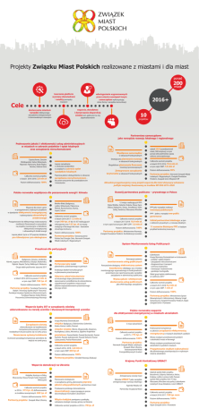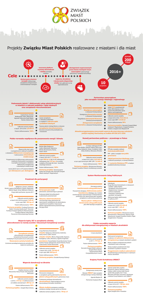 Projekty Związku Miast Polskich realizowane z miastami i dla miast ponad 200 miast tworzenie platform wymiany doświadczeń i wiedzy pomiędzy Cele udostępnianie wypracowanych przez miasta rozwiązań innym samorządom wykorzystując miastami wsparcie, doradztwo i dostarczanie eksperckiej wiedzy tam, gdzie jest na nią dostarczenie miastom narzędzi efektywnego zarządzania zintegrowanym i zrównoważonym rozwojem 2016+ różne formy i narzędzia komunikacji zapotrzebowanie 10 projektów Partnerstwa samorządowe jako narzędzie rozwoju lokalnego i regionalnego Podnoszenie jakości i efektywności usług administracyjnych w miastach w zakresie podatków i opłat lokalnych oraz zarządzania nieruchomościami Współpraca samorządów w obszarach funkcjonalnych Częstochowa, Gorzów Wielkopolski, Kalisz, Milanówek, Rejowiec Fabryczny, Ruda Śląska, Tarnów, Zielona Góra Strategiczne planowanie rozwoju w obszarach funkcjonalnych Lepsze zarządzanie w obsłudze podatników w urzędach w zakresie opłat i podatków lokalnych Całkowita wartość projektu w latach 2016-2018: 2,8 mln zł Poziom dofinansowania: 100% Poprawa jakości obsługi klienta w obszarze zarządzania nieruchomościami – kluczowe znaczenie dla przedsiębiorców i inwestorów Polsko-norweska współpraca dla poszanowania energii i klimatu Wsparcie dla miast i gmin w przygotowaniu większych projektów w dziedzinie efektywności energetycznej i wykorzystania odnawialnych źródeł energii Przygotowanie do efektywnego wykorzystania możliwości finansowych w przyszłości na projekty inwestycyjne w dziedzinie efektywności energetycznej i odnawialnych źródeł energii Lepsza jakość życia w JST poprzez działania pro-klimatyczne i pro-ekologiczne Bielsko-Biała, Bydgoszcz, Lublin, Milanówek, Pałecznica, Płońsk, Raciechowice, Rumia, Sopot, Sztum Długofalowe planowanie finansowe inwestycji prorozwojowych Zintegrowane zarządzanie terytorialne w obszarach funkcjonalnych udział 2553 przedstawicieli miast, 940 instytucji, w tym ponad 230 podmiotów spoza sektora samorządowego Całkowita wartość projektu w latach 2012-2016: 10,6 mln zł, w tym część ZMP: 7,8 mln zł Poziom dofinansowania: 90% Partnerzy projektu: Norweski Związek Władz Lokalnych i Regionalnych, Związek Powiatów Polskich, Związek Gmin Wiejskich RP Aktualnie przygotowujemy nowy projekt wsparcia dla miast dotyczący wdrażania polityki miejskiej, finansowany ze środków MF EOG 2015-2020 Rozwój partnerstwa publiczno – prywatnego w Polsce 12 miejsc realizujących PPP: Dębe Wielkie, Gdańsk, Kraków, Nowy Sącz, Oława, Radzymin, Sierpc, Smołdzino, Solec Zdrój, Świdnica, Warszawa, Wrocław PPP jako narzędzie realizacji inwestycji publicznych PPP – jedno z narzędzi new public Całkowita wartość projektu w latach 2016-2017: 1,5 mln zł, w tym 500 tys. zł dla 10 JST realizujących mikrogranty oraz 157 tys. zł na wizytę studyjną w Norwegii dla miast - laureatów otwartego konkursu Poziom dofinansowania: 100% Partnerzy projektu: Stowarzyszenie governance Całkowita wartość projektu w latach 2017-2019: 10,9 mln zł, w tym część konsorcjum ZMP i ZPP: 1,6 mln zł Poziom dofinansowania: 100% Partnerzy projektu: Ministerstwo Rozwoju, Udział partnerstwa lokalnego, w tym z sektorem prywatnym, w rozwoju lokalnym 11 numerów Biuletynu PPP, w każdym przykład konkretnej inwestycji Związek Powiatów Polskich, Konfederacja Lewiatan Polska Sieć Energie Cités, Norweski Związek Władz Lokalnych i Regionalnych System Monitorowania Usług Publicznych Przestrzeń dla partycypacji Bydgoszcz, Cieszyn, Jordanów, Kórnik, Legnica, Michałowice, Olsztyn, Radomsko, Rybnik, Słupsk, Tychy, Wałbrzych, Wołomin Drugi nabór pod koniec stycznia 2017 Koncepcja systemu Partycypacyjny model planowania przestrzennego w gminach Ewaluacja działań konsultacyjnych w planowaniu przestrzennym Całkowita wartość projektu w latach 2016-2018 to prawie 2 mln zł, w tym część ZMP: 182 tys. zł Poziom dofinansowania: 100% Partnerzy projektu: Fundacja Pracownia Badań i Innowacji Społecznych "Stocznia", Fundacja Inicjatyw Społeczno-Ekonomicznych, Fundacja Napraw Sobie Miasto, Pracownia Zrównoważonego Rozwoju Aktywny udział mieszkańców od wczesnego etapu planowania do opracowania i przedłożenia do zatwierdzenia uzgodnionych projektów miejscowych planów zagospodarowania przestrzennego lub jego zmian ukierunkowane na kształtowanie kompetencji kluczowych uczniów niezbędnych do poruszania się na rynku pracy Nowoczesne systemy kształcenia Uczniowie posiadają kompetencje potrzebne do wejścia na rynek pracy Wyższa jakość i efektywność dostarczania usług publicznych jako efekt lepszego zarządzania Skład grup będzie zdefiniowany w I półroczu 2017 Całkowita wartość projektu w latach 2017-2018: 9,2 mln zł, w tym część ZMP: 1 mln zł Poziom dofinansowania: 100% Partnerzy projektu: Ministerstwo Spraw Wewnętrznych i Administracji, Główny Urząd Statystyczny, Związek Powiatów Polskich, Śląski Związek Gmin i Powiatów Wsparcie kadry JST w zarządzaniu oświatą ukierunkowane na rozwój uczniów i kluczowych kompetencji uczniów Zarządzanie oświatą monitorowania usług publicznych Powszechnie dostępny, elektroniczny system bazodanowy składający się z modułu monitorującego wyposażonego w funkcjonalności prezentacji oraz raportowania jako narzędzie zarządzania w administracji publicznej Członkowie Grupy Wymiany Doświadczeń w 6 obszarach: - podatki i opłaty lokalne - zarządzanie nieruchomościami - drogownictwo i transport - ochrona środowiska - inwestycje i budownictwo - geodezja i kartografia Grupy Wymiany Doświadczeń miejska: Bydgoszcz, Dzierżoniów, Goleniów, Kielce, Kutno, Lublin, Poznań miejsko-wiejska: Błonie, Długosiodło, Dopiewo, Koziegłowy, Lubicz, Morawica, Sępólno Krajeńskie powiatowa: Powiat Bialski, Powiat Bocheński, Powiat Gorlicki, Powiat Jędrzejowski, Powiat Kielecki, Powiat Lubaczowski,