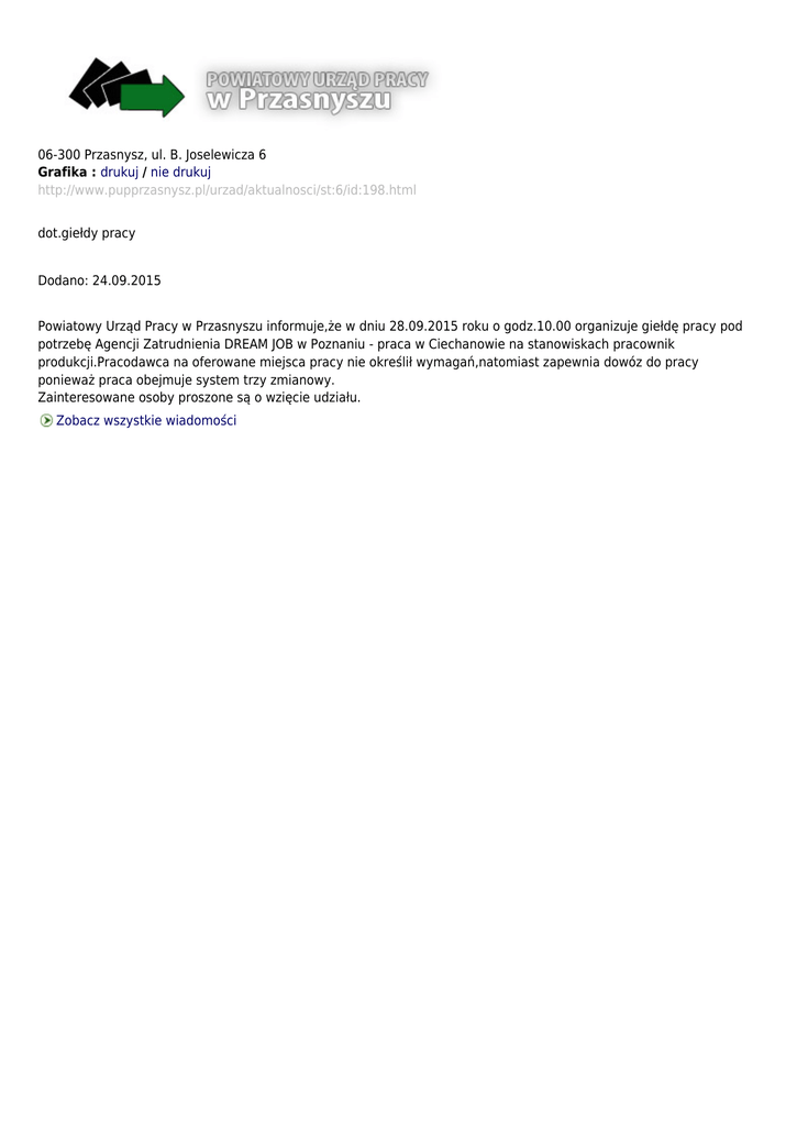 06-300 Przasnysz, ul. B. Joselewicza 6 Grafika : drukuj / nie drukuj http://www.pupprzasnysz.pl/urzad/aktualnosci/st:6/id:198.html dot.giełdy pracy Dodano: 24.09.2015 Powiatowy Urząd Pracy w Przasnyszu informuje,że w dniu 28.09.2015 roku o godz.10.00 organizuje giełdę pracy pod potrzebę Agencji Zatrudnienia DREAM JOB w Poznaniu - praca w Ciechanowie na stanowiskach pracownik produkcji.Pracodawca na oferowane miejsca pracy nie określił wymagań,natomiast zapewnia dowóz do pracy ponieważ praca obejmuje system trzy zmianowy. Zainteresowane osoby proszone są o wzięcie udziału. Zobacz wszystkie wiadomości