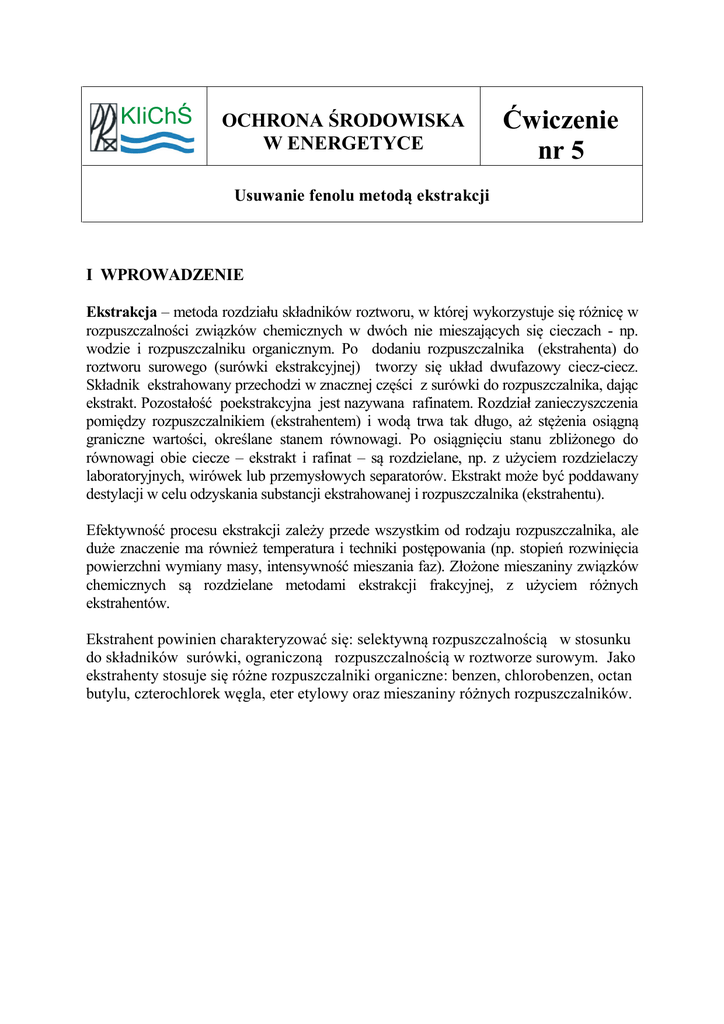 KIiChŚ OCHRONA ŚRODOWISKA W ENERGETYCE Ćwiczenie nr 5 Usuwanie fenolu metodą ekstrakcji I WPROWADZENIE Ekstrakcja – metoda rozdziału składników roztworu, w której wykorzystuje się różnicę w rozpuszczalności związków chemicznych w dwóch nie mieszających się cieczach - np. wodzie i rozpuszczalniku organicznym. Po dodaniu rozpuszczalnika (ekstrahenta) do roztworu surowego (surówki ekstrakcyjnej) tworzy się układ dwufazowy ciecz-ciecz. Składnik ekstrahowany przechodzi w znacznej części z surówki do rozpuszczalnika, dając ekstrakt. Pozostałość poekstrakcyjna jest nazywana rafinatem. Rozdział zanieczyszczenia pomiędzy rozpuszczalnikiem (ekstrahentem) i wodą trwa tak długo, aż stężenia osiągną graniczne wartości, określane stanem równowagi. Po osiągnięciu stanu zbliżonego do równowagi obie ciecze – ekstrakt i rafinat – są rozdzielane, np. z użyciem rozdzielaczy laboratoryjnych, wirówek lub przemysłowych separatorów. Ekstrakt może być poddawany destylacji w celu odzyskania substancji ekstrahowanej i rozpuszczalnika (ekstrahentu). Efektywność procesu ekstrakcji zależy przede wszystkim od rodzaju rozpuszczalnika, ale duże znaczenie ma również temperatura i techniki postępowania (np. stopień rozwinięcia powierzchni wymiany masy, intensywność mieszania faz). Złożone mieszaniny związków chemicznych są rozdzielane metodami ekstrakcji frakcyjnej, z użyciem różnych ekstrahentów. Ekstrahent powinien charakteryzować się: selektywną rozpuszczalnością w stosunku do składników surówki, ograniczoną rozpuszczalnością w roztworze surowym. Jako ekstrahenty stosuje się różne rozpuszczalniki organiczne: benzen, chlorobenzen, octan butylu, czterochlorek węgla, eter etylowy oraz mieszaniny różnych rozpuszczalników. II WYKONANIE 1. 2. 3. 4. 5. Sprawdzić czy rozdzielacze mają dobrze nasmarowane szlify. Do 2 rozdzielaczy wprowadzić równe objętości ścieków fenolowych - 50 cm3. Do każdego rozdzielacza dodać inny ekstrahent w ilości 10 cm3. Wytrząsać ręcznie 10 minut w celu przeprowadzenia ekstrakcji. Wstawić do statywu i pozostawić na 20 minut do odstania, w celu oddzielenia ekstraktu (ekstrahenta z rozpuszczonym fenolem) i rektyfikatu (oczyszczonych z fenolu ścieków – warstwy wodnej). 6. Pobrać próbę ścieków fenolowych przed ekstrakcją o objętości 5 cm3 i oznaczyć fenol. 7. Po zakończeniu fazy rozdziału pobrać próbę rektyfikatu (warstwy wodnej) z każdego rozdzielacza o objętości 5 cm3 i oznaczyć fenol UWAGA: Resztki ekstrahentów z rozdzielaczy wylać do pojemnika pod wyciągiem. 8. Fenol oznaczać wg poniższej instrukcji. Sporządzić roztwory odczynników: o 4-aminoantypiryny - w kolbie miarowej o pojemności 25 ml rozpuścić 0,5 g 4-aminoantypiryny i uzupełnić wodą destylowaną do kreski. o żelazicyjanku potasowego - w kolbie miarowej o pojemności 25 ml rozpuścić 2,0 g K3Fe(CN)6 cz.d.a. w wodzie destylowanej i dopełnić do kreski. Do cylindrów miarowych o poj. 50 ml odmierzyć 5 ml ścieków fenolowych. Uzupełnić cylindry wodą destylowaną do 50 cm3. Dodać 0,5 ml r-ru buforowego i wymieszać. Dodać 1 ml r-ru 4-aminoantypiryny i wymieszać. Dodać 1,0 ml r-ru żelazicyjanku potasowego i wymieszać natychmiast zawartość cylindra. Po 5 min. odczytać stężenie fenolu na fotometrze. Zawartość fenolu obliczyć wg wzoru: X a 1000 2 V , mg/l fenolu gdzie : a - stężenie fenolu odczytane na fotometrze, V - objętość ścieków użyta do oznaczania w przeliczeniu na ścieki wyjściowe , ml. 9. Obliczyć współczynnik rozdziału wg wzoru: ce cw gdzie: Ce = Co – Cw Co – początkowe stężenie fenolu w ściekach surowych, mg/dm3 Cw – stężenie fenolu w wodzie (ściekach) po ekstrakcji, mg/dm3 10. Uzyskane wyniki przedstawić tabelarycznie i graficznie (wykresy słupkowe). Tabela Zestawienie wyników dla ćwiczenia 5. Ekstrahent 1 ……………….…..… Ekstrahent 2 ……………………… Początkowe stężenie fenolu w próbce, mg/dm3 Końcowe stężenie fenolu po ekstrakcji, mg/dm3 Współczynnik rozdziału K 11. Na podstawie przeprowadzonych analiz i wykresów dokonać wyboru lepszego ekstrahenta i uzasadnić.