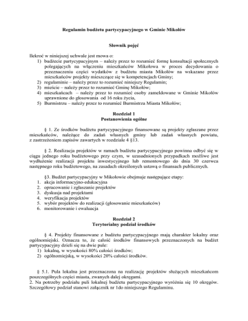 Regulamin budżetu partycypacyjnego w Gminie Mikołów Słownik pojęć Ilekroć w niniejszej uchwale jest mowa o: 1) budżecie partycypacyjnym – należy przez to rozumieć formę konsultacji społecznych polegających na włączeniu mieszkańców Mikołowa w proces decydowania o przeznaczeniu części wydatków z budżetu miasta Mikołów na wskazane przez mieszkańców projekty mieszczące się w kompetencjach Gminy; 2) regulaminie – należy przez to rozumieć niniejszy Regulamin; 3) mieście – należy przez to rozumieć Gminę Mikołów; 4) mieszkańcach – należy przez to rozumieć osoby zameldowane w Gminie Mikołów uprawnione do głosowania od 16 roku życia, 5) Burmistrzu – należy przez to rozumieć Burmistrza Miasta Mikołów; Rozdział 1 Postanowienia ogólne § 1. Ze środków budżetu partycypacyjnego finansowane są projekty zgłaszane przez mieszkańców, należące do zadań własnych gminy lub zadań własnych powiatu, z zastrzeżeniem zapisów zawartych w rozdziale 4 §13. § 2. Realizacja projektów w ramach budżetu partycypacyjnego powinna odbyć się w ciągu jednego roku budżetowego przy czym, w uzasadnionych przypadkach możliwe jest wydłużenie realizacji projektu inwestycyjnego lub remontowego do dnia 30 czerwca następnego roku budżetowego, na zasadach określonych ustawą o finansach publicznych. 1. 2. 3. 4. 5. 6. §3. Budżet partycypacyjny w Mikołowie obejmuje następujące etapy: akcja informacyjno-edukacyjna opracowanie i zgłaszanie projektów dyskusja nad projektami weryfikacja projektów wybór projektów do realizacji (głosowanie mieszkańców) monitorowanie i ewaluacja Rozdział 2 Terytorialny podział środków § 4. Projekty finansowane z budżetu partycypacyjnego mają charakter lokalny oraz ogólnomiejski. Oznacza to, że całość środków finansowych przeznaczonych na budżet partycypacyjny dzieli się na dwie pule: 1) lokalną, w wysokości 80% całości środków; 2) ogólnomiejską, w wysokości 20% całości środków. § 5.1. Pula lokalna jest przeznaczona na realizację projektów służących mieszkańcom poszczególnych części miasta, zwanych dalej okręgami. 2. Na potrzeby podziału puli lokalnej budżetu partycypacyjnego wyróżnia się 10 okręgów. Szczegółowy podział stanowi załącznik nr 1do niniejszego Regulaminu. 3. Podział puli lokalnej na poszczególne okręgi odbywa się wg następujących reguł: 1) 15% puli lokalnej zostanie podzielona w równych częściach pomiędzy wszystkie okręgi; 2) 85% puli lokalnej zostanie podzielona pomiędzy okręgi proporcjonalnie do liczby mieszkańców poszczególnych okręgów ustalonej wg stanu na dzień 1 stycznia roku, w którym obliczana jest pula; § 6. Pula ogólnomiejska jest przeznaczona na realizację projektów służących mieszkańcom całego miasta, co oznacza, że finansowane z niej projekty dotyczą potrzeb więcej niż jednego okręgu lub miejsce ich realizacji nie jest przypisane do jednego okręgu. Rozdział 3 Zgłaszanie propozycji projektów § 7.1. Propozycje projektów do budżetu partycypacyjnego może składać każdy mieszkaniec Mikołowa, który w momencie wypełniania wniosku ma ukończone 16 lat. 2. Projekty o charakterze lokalnym dotyczące danego okręgu mogą zgłaszać jedynie mieszkańcy tego okręgu. § 8.1. O terminie składania propozycji projektów do budżetu partycypacyjnego oraz o kwocie środków przeznaczonych na pulę ogólnomiejską oraz pule lokalne, Burmistrz informuje co najmniej na 14 dni przed rozpoczęciem tego terminu. 2. Informacja, o której mowa w ust. 1 będzie podana do publicznej wiadomości za pośrednictwem miejskiej strony internetowej www.mikolow.eu, www.obywatelski.mikolow.eu, wywieszona na tablicach znajdujących się w Punktach Informacyjnych Urzędu Miasta Mikołów oraz innych miejscach, o ile zostaną wskazane przez Burmistrza, a także przekazana lokalnym mediom na konferencji prasowej lub za pośrednictwem środków komunikacji elektronicznej. 3. Czas na składanie projektu do budżetu partycypacyjnego nie może być krótszy niż 21 dni. § 9.1. Zgłoszenie projektu następuje na formularzu, którego wzór stanowi załącznik nr 2 do Regulaminu. 2. Do formularza zgłoszenia projektu wnioskujący dołącza listę poparcia dla projektu, podpisaną przez co najmniej 15 mieszkańców Mikołowa (danego okręgu), którzy ukończyli 16 rok życia, mapę sytuacyjną (dopuszcza się odręczny szkic, rysunek sytuacyjny) oraz wstępny kosztorys. Wzór listy stanowi załącznik nr 3 do Regulaminu. Mieszkańcy mogą popierać dowolną liczbę propozycji. § 10.1. Każdy mieszkaniec może zgłosić dowolną liczbę projektów do puli lokalnej, z której będą realizowane projekty dotyczące okręgu, w którym mieszka oraz dowolną liczbę projektów do puli ogólnomiejskiej 2. Ta sama propozycja nie może być zgłoszona do dwóch puli środków. O wyborze puli, do której propozycja zostaje zgłoszona decyduje zgłaszający. Rozdział 4 Weryfikacja zgłoszonych projektów § 11.1. Zgłoszone przez mieszkańców propozycje projektów do budżetu partycypacyjnego podlegają weryfikacji, której dokonują właściwe merytorycznie działy Urzędu Miasta Mikołów lub miejskie jednostki organizacyjne. § 12.1. W razie stwierdzenia podczas weryfikacji, że złożony projekt nie zawiera istotnych informacji potrzebnych do analizy propozycji lub przekracza dostępną pulę środków, osoba składająca projekt zostanie niezwłocznie poinformowana, telefonicznie lub pocztą elektroniczną, o konieczności dokonania uzupełnień lub modyfikacji wniosku. 2. Modyfikacja, o której mowa w ust.1 musi być dokonana z zachowaniem zasady racjonalności gospodarowania środkami publicznymi oraz wymogów § 13, w szczególności pkt 6. 3. Od momentu zawiadomienia o brakach we wniosku lub konieczności dokonania modyfikacji wniosku, składający projekt ma 5 dni roboczych na dokonanie korekty. 4. Projekt może być korygowany w term