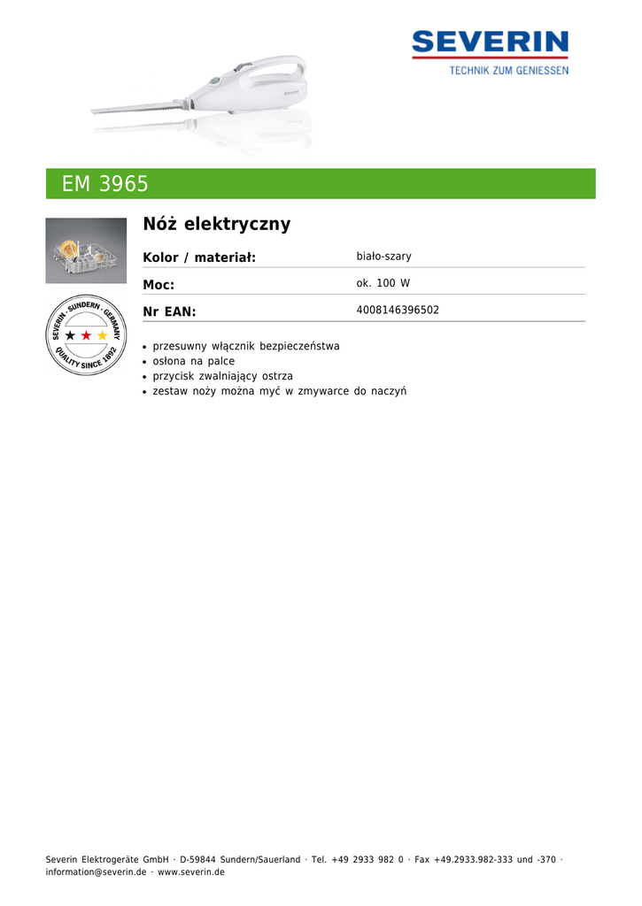 EM 3965 Nóż elektryczny Kolor / materiał: biało-szary Moc: ok. 100 W Nr EAN: 4008146396502 ● ● ● ● przesuwny włącznik bezpieczeństwa osłona na palce przycisk zwalniający ostrza zestaw noży można myć w zmywarce do naczyń Severin Elektrogeräte GmbH · D-59844 Sundern/Sauerland · Tel. +49 2933 982 0 · Fax +49.2933.982-333 und -370 · [email protected] · www.severin.de
