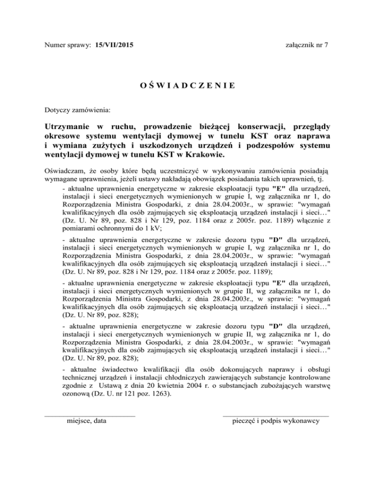 Numer sprawy: 15/VII/2015 załącznik nr 7 OŚWIADCZENIE Dotyczy zamówienia: Utrzymanie w ruchu, prowadzenie bieŜącej konserwacji, przeglądy okresowe systemu wentylacji dymowej w tunelu KST oraz naprawa i wymiana zuŜytych i uszkodzonych urządzeń i podzespołów systemu wentylacji dymowej w tunelu KST w Krakowie. Oświadczam, Ŝe osoby które będą uczestniczyć w wykonywaniu zamówienia posiadają wymagane uprawnienia, jeŜeli ustawy nakładają obowiązek posiadania takich uprawnień, tj. - aktualne uprawnienia energetyczne w zakresie eksploatacji typu "E" dla urządzeń, instalacji i sieci energetycznych wymienionych w grupie I, wg załącznika nr 1, do Rozporządzenia Ministra Gospodarki, z dnia 28.04.2003r., w sprawie: "wymagań kwalifikacyjnych dla osób zajmujących się eksploatacją urządzeń instalacji i sieci…" (Dz. U. Nr 89, poz. 828 i Nr 129, poz. 1184 oraz z 2005r. poz. 1189) włącznie z pomiarami ochronnymi do 1 kV; - aktualne uprawnienia energetyczne w zakresie dozoru typu "D" dla urządzeń, instalacji i sieci energetycznych wymienionych w grupie I, wg załącznika nr 1, do Rozporządzenia Ministra Gospodarki, z dnia 28.04.2003r., w sprawie: "wymagań kwalifikacyjnych dla osób zajmujących się eksploatacją urządzeń instalacji i sieci…" (Dz. U. Nr 89, poz. 828 i Nr 129, poz. 1184 oraz z 2005r. poz. 1189); - aktualne uprawnienia energetyczne w zakresie eksploatacji typu "E" dla urządzeń, instalacji i sieci energetycznych wymienionych w grupie II, wg załącznika nr 1, do Rozporządzenia Ministra Gospodarki, z dnia 28.04.2003r., w sprawie: "wymagań kwalifikacyjnych dla osób zajmujących się eksploatacją urządzeń instalacji i sieci…" (Dz. U. Nr 89, poz. 828); - aktualne uprawnienia energetyczne w zakresie dozoru typu "D" dla urządzeń, instalacji i sieci energetycznych wymienionych w grupie II, wg załącznika nr 1, do Rozporządzenia Ministra Gospodarki, z dnia 28.04.2003r., w sprawie: "wymagań kwalifikacyjnych dla osób zajmujących się eksploatacją urządzeń instalacji i sieci…" (Dz. U. Nr 89, poz. 828); - aktualne świadectwo kwalifikacji dla osób dokonujących naprawy i obsługi technicznej urządzeń i instalacji chłodniczych zawierających substancje kontrolowane zgodnie z Ustawą z dnia 20 kwietnia 2004 r. o substancjach zuboŜających warstwę ozonową (Dz. U. nr 121 poz. 1263). ________________________ miejsce, data ____________________________ pieczęć i podpis wykonawcy