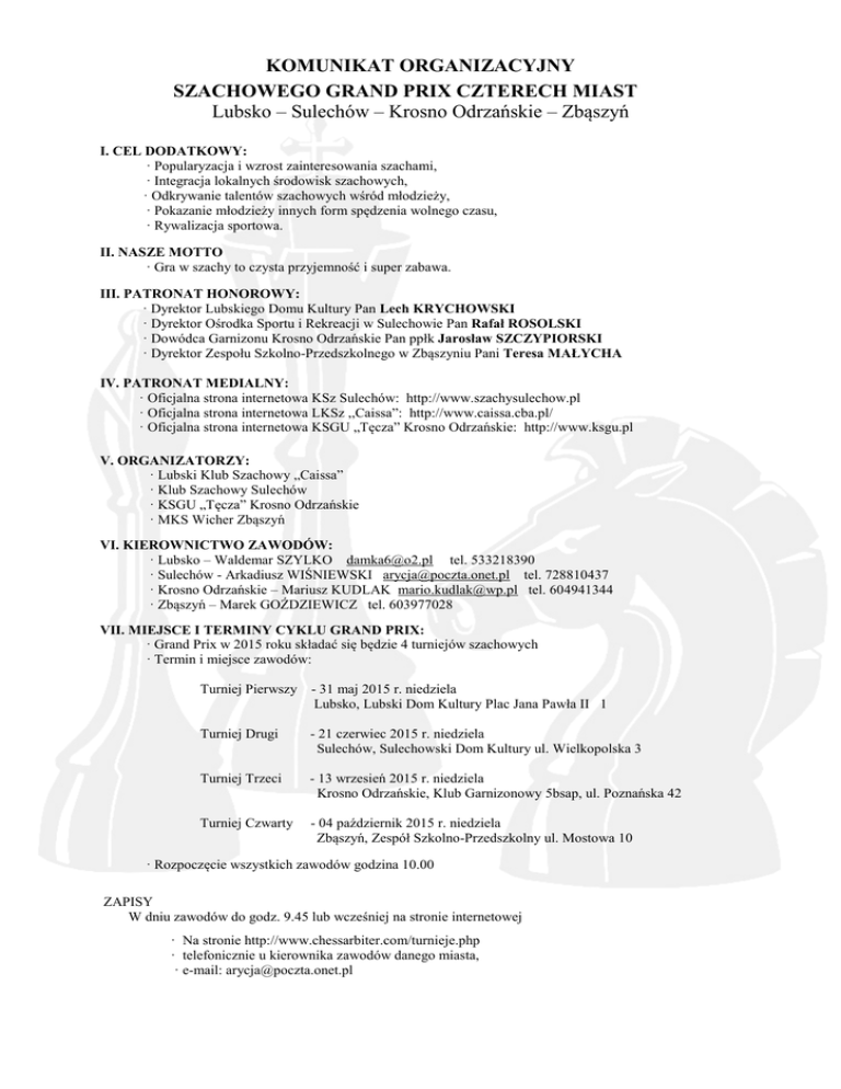 KOMUNIKAT ORGANIZACYJNY SZACHOWEGO GRAND PRIX CZTERECH MIAST Lubsko – Sulechów – Krosno Odrzańskie – Zbąszyń I. CEL DODATKOWY: · Popularyzacja i wzrost zainteresowania szachami, · Integracja lokalnych środowisk szachowych, · Odkrywanie talentów szachowych wśród młodzieży, · Pokazanie młodzieży innych form spędzenia wolnego czasu, · Rywalizacja sportowa. II. NASZE MOTTO · Gra w szachy to czysta przyjemność i super zabawa. III. PATRONAT HONOROWY: · Dyrektor Lubskiego Domu Kultury Pan Lech KRYCHOWSKI · Dyrektor Ośrodka Sportu i Rekreacji w Sulechowie Pan Rafał ROSOLSKI · Dowódca Garnizonu Krosno Odrzańskie Pan ppłk Jarosław SZCZYPIORSKI · Dyrektor Zespołu Szkolno-Przedszkolnego w Zbąszyniu Pani Teresa MAŁYCHA IV. PATRONAT MEDIALNY: · Oficjalna strona internetowa KSz Sulechów: http://www.szachysulechow.pl · Oficjalna strona internetowa LKSz ,,Caissa”: http://www.caissa.cba.pl/ · Oficjalna strona internetowa KSGU „Tęcza” Krosno Odrzańskie: http://www.ksgu.pl V. ORGANIZATORZY: · Lubski Klub Szachowy „Caissa” · Klub Szachowy Sulechów · KSGU „Tęcza” Krosno Odrzańskie · MKS Wicher Zbąszyń VI. KIEROWNICTWO ZAWODÓW: · Lubsko – Waldemar SZYLKO [email protected] tel. 533218390 · Sulechów - Arkadiusz WIŚNIEWSKI [email protected] tel. 728810437 · Krosno Odrzańskie – Mariusz KUDLAK [email protected] tel. 604941344 · Zbąszyń – Marek GOŹDZIEWICZ tel. 603977028 VII. MIEJSCE I TERMINY CYKLU GRAND PRIX: · Grand Prix w 2015 roku składać się będzie 4 turniejów szachowych · Termin i miejsce zawodów: Turniej Pierwszy - 31 maj 2015 r. niedziela Lubsko, Lubski Dom Kultury Plac Jana Pawła II 1 Turniej Drugi - 21 czerwiec 2015 r. niedziela Sulechów, Sulechowski Dom Kultury ul. Wielkopolska 3 Turniej Trzeci - 13 wrzesień 2015 r. niedziela Krosno Odrzańskie, Klub Garnizonowy 5bsap, ul. Poznańska 42 Turniej Czwarty - 04 październik 2015 r. niedziela Zbąszyń, Zespół Szkolno-Przedszkolny ul. Mostowa 10 · Rozpoczęcie wszystkich zawodów godzina 10.00 ZAPISY W dniu zawodów do godz. 9.45 lub wcześniej na stronie internetowej · Na stronie http://www.chessarbiter.com/turnieje.php · telefonicznie u kierownika zawodów danego miasta, · e-mail: [email protected] VIII. KLASYFIKACJA GENERALNA: Cały cykl składa się z 4 turniejów. Do klasyfikacji generalnej liczy się suma punktów uzyskanych we wszystkich czterech turniejach. W przypadku równej ilości punktów o kolejności decydować będzie: • Większa liczba I miejsc, • Bezpośredni pojedynek, • Liczba zwycięstw, • Większa liczba II miejsc itd. WAŻNE: Do podsumowania cyklu Grand Prix pod uwagę będą brane wszystkie turnieje. IX. SYSTEM ROZGRYWEK: · Szwajcarski na dystansie 7 rund. · W zawodach wszyscy grają razem, ale będzie prowadzona klasyfikacja dla zawodników w niżej wymienionych kategoriach: „A” „OPEN” „B” ranking ELO, PZSzach od 1601 do 1800 (decyduje wyższy ranking) tylko i wyłącznie juniorzy, „C” ranking ELO, PZSzach od 1401 do 1600 (decyduje wyższy ranking) tylko i wyłącznie juniorzy, „D” ranking ELO, PZSzach od 1201 do 1400 (decyduje wyższy ranking) tylko i wyłącznie juniorzy, „E” ranking ELO, PZSzach od 1001 do 1200 (decyduje wyższy ranking) tylko i wyłącznie juniorzy, „F” ranking ELO, PZSzach do 1000 tylko i wyłącznie juniorzy. X. TEMPO I PRZEPISY GRY: · Tempo gry 15 minut dla każdego zawodnika, · W turnieju obowiązują najnowsze przepisy zawarte w Kodeksie Szachowym PZSzach. XI. WARUNKI UCZESTNICTWA W TURNIEJU: · Wpisowe: - Seniorzy 10 zł - Juniorzy bez wpisowego - Junior może być klasyfikowany w rywalizacji o nagrodę finansową po wcześniejszej deklaracji oraz uiszczeniu opłaty wpisowej w turnieju przed rozpoczęciem pierwszej rundy. 100 % WPISOWEGO PRZEZNACZONE NA NAGRODY FINANSOWE XII. NAGRODY I WYRÓŻNIENIA: · W klasyfikacji indywidualnej poszczególnych turniejów tj: I, II, III, IV: - puchar za I miejsce we wszystkich kategoriach, - dyplomy oraz medale za miejsca I-III we wszystkich kategoriach, - nagrody rzeczowe za IV-V miejsca w kategoriach E,F. Podział nagród finansowych: - za I miejsce 50% wpisowego - za II miejsce 30% wpisowego - za III miejsce 20% wpisowego 100 % WPISOWEGO PRZEZNACZONE NA NAGRODY FINANSOWE Nagrody w klasyfikacji generalnej po podliczeniu wyników z czterech turniejów: - puchar za I miejsce we wszystkich kategoriach XIII. SPRAWY WYCHOWAWCZE - W czasie gry obowiązują zasady dobrego zachowania umożliwiające zawodnikom bezproblemowe rozegranie partii, oraz kategoryczny zakaz picia alkoholu i palenia tytoniu. - Opiekę wychowawczą podczas zawodów sprawują SZKOLENIOWCY I OPIEKUNOWIE !!!, we współpracy z Organizatorem. XIV. SPRAWY RÓŻNE - Osoby niepełnoletnie muszą przebywać w trakcie turnieju pod nadzorem opiekuna! - Uczestnicy indywidualnie ubezpieczają się od następstw nieszczęśliwych wypadków i biorą udział w zawodach na własną odpowiedzialność oraz odpowiadają za wyrządzone przez siebie szkody. - Ostateczna interpretacja niniejszego regulaminu oraz weryfikacja zawodników mogących brać udział w turnieju należy do organizatora zawodów oraz sędziego głównego. Z szachowym pozdrowieniem ORGANIZATORZY