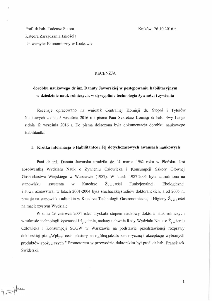 Prof. dr hab. Tadeusz Sikora Kraków, 26.10.2016 r. Katedra Zarządzania Jakością Uniwersytet Ekonomiczny w Krakowie RECENZJA dorobku naukowego dr inż. Danuty Jaworskiej w postępowaniu habilitacyjnym w dziedzinie nauk rolniczych, w dyscyplinie technologia żywności i żywienia Recenzje opracowano na wniosek Centralnej Komisji ds. Stopni i Tytułów Naukowych z dnia 5 września 2016 r. i pisma Pani Sekretarz Komisji dr hab. Ewy Lange z dnia 12 września 2016 r. Do pisma dołączona była dokumentacja dorobku naukowego Habilitantki. 1. Krótka informacja o Habilitantce i Jej dotychczasowych awansach naukowych Pani dr inż. Danuta Jaworska urodziła się 14 marca 1962 roku w Płońsku. Jest absolwentką Wydziału Nauk o Żywieniu Człowieka i Konsumpcji Szkoły Głównej Gospodarstwa Wiejskiego w Warszawie (1987). W latach 1987-2005 była zatrudniona na stanowisku asystenta w Katedrze Ży w n ości Funkcjonalnej, Ekologicznej i Towaroznawstwa; w latach 2001-2004 była słuchaczką studiów doktoranckich, a od 2005 r., pracuje na stanowisku adiunkta w Katedrze Technologii Gastronomicznej i Higieny Ży w n ości na macierzystym Wydziale. W dniu 29 czerwca 2004 roku u.yskała stopień naukowy doktora nauk rolniczych w zakresie technologii żywności i ży w ienia, nadany uchwałą Rady Wydziału Nauk o Ży w ieniu Człowieka i Konsumpcji SGGW w Warszawie na podstawie przedstawionej rozprawy doktorskiej pt.: ,,Wpł y w cech tekstury na ogólną jakość sensoryczną i akceptację wybranych produktów spoży w czych." Promotorem w przewodzie doktorskim był prof. dr hab. Franciszek Świderski. 1 2. Ocena wartości naukowej dorobku stanowiącego największe osiągnięcie habilitantki Pani Danuta Jaworska przedstawiła jako znaczące osi ą g nięcie naukowe siedem publikacji wchodzących w skład jednotematycznego cyklu, których łączna wartość punktowa wynosi 114 punktów, a IF = 6,904. Osi ą g nięcie zostało zatytułowane: ,,Znaczenie analizy sensorycznej w ocenie jakości mięsa i przetworów mięsnych ze względu na aspekty technologiczne i analityczne". Publikacje przedstawione jako kluczowe osi ą g nięcia Habilitantki, to: 1. Jaworska D., Przybylski W., 2014: The effect of selected factors on sensory quality of pork. Żywność, Nauka, Technologia, Jakość, 5, 31-35 (15 pkt MNiSW; IF O,OOO). 2. Jaworska D., Czaudema M., Przybylski W., Rozbicka-Wieczorek A.J., 2016: Sensory quqlity and chemical composition of lambs meat fed diets enriched with fish and rapeseed oils, camosic acid and seleno-compounds. Meat Science, 119, 185-192 (35 pkt MNiSW; IF 2.615). 3. Przybylski W., Jaworska D., Czamiecka-Skubina E., Kajak-Siemaszko K., 2008: Ocena możliwości wyodrębnienia mięsa kulinarnego o wysokiej jakości z uwzględnieniem mięsności tuczników, pomiaru barwy i pH z zastosowaniem analizy skupień. Żywność, Nauka, Technologia, Jakość, 4, 43-51 (4 pkt MNiSW). 4. Jaworska D., Przybylski W., Kajak-Siemaszko K., Czamiecka-Skubina E., 2009: Sensory quality of culinary pork meat in relations to slaughter and technological value. Food Science and Technology Research, 15, 1, 65-74 (IO pkt MNiSW; IF 0,401). 5. Jaworska D., Neffe K., Kołożyn-Krajewska D., Dolatowski Z., 2011: Survival during storage and sensory effect of potentia! probiotic lactic acid bacteria Lactobacillus acidophilus Bauer and Lactobacillus casei Bif3 IV in dry fermented pork loins. International Journal o f Food Science and Technology, 46, 12, 2491-2497 (25 pkt MNiSW; IF 1,259). 6. Neffe-Skocińska K., Jaworska D., Kołożyn-Krajewska D., Dolatowski Z., JachaczJ ówko L., 2015. The effect of LAB as probiotic starter culture and green tea extract addition on dry fermented pork loins quality. Journal o f Biomedicine and Biotechnology (changed for BioMed Research International), Article ID 452757, DOI: 10.l 155/2015/452757 (20 pkt MNiSW; IF 1,579). 2 7. Strydom P.E., Jaworska D., Kołożyn-Krajewska D., 2016: Meat Quality of Slaughter Animals in: Meat Quality. Genetic and Enviromental Factors. (red.) Przybylski W., Hopkins D., CRC Press, pp 32-80 (5 pkt MNiSW). Przedstawione publikacje jako kluczowe osi ą g nięcie były publikowane w latach 20082016 w wysokopunktowych czasopismach, takich jak: Meat Science, Food Science and Technology Research, International Journal o f Food Science and Technology, Journal o f Biomedicine and Biotechnology, czy Ży w ność. Nauka. Technologia. Jakość. We wszystkich przypadkach są to prace zespołowe, co jest oczywiste w tego typu badaniach. W przypadku czterech publikacji dr D. Jaworska jest pierwszym autorem, co wskazuje na jej wiodącą rolę w prowadzonych badaniach. Do publikacji stanowiących os1ą g męc1a naukowe Habilitantka włączyła rozdział w monografii angielskojęzycznej (poz. 7), ale trudno tę publikację uznać jako publikację oryginalną. Świadczy ona raczej o opanowaniu przez dr D. Jaworską wiedzy z zakresu metodycznych aspektów badania jakości mięsa. Tak więc jako kluczowe osi ą g nięcie należy ocenić sześć pierwszych publikacji. W „Autoreferacie" Habilitantka przyjęła cztery hipotezy, jednak są to hipotezy przyjęte post factum, więc nie będę się do nich odnosił. Ważniejsza jest analiza poszczególnych publikacji, które stanowią kluczowe osi ą g nięcie. W publikacjach 1-2 przedstawiono wyniki badań odnoszące się do uwarunkowań jakości sensorycznej mięsa kulinarnego w zależności od wybranych czynników genetycznych (rasa, genotyp, mięsność, zawartość tłuszczu śródmięśniowego, poubojowych (pH) i środowiskowych (żywienie). Autorka przeprowadziła badania sensoryczne mięsa tuczników rasy Neckar wskazując wysoką wartość sensoryczną mięsa pochodzącego od tych zwierząt, wypełniając tym samym lukę w tym obszarze badawczym w odniesieniu do tego surowca. Badając wpływ genotypu zwierząt na jakość sensoryczną mięsa Habilitantka wykorzystała wpływ genu kalpastatyny (CAST/Rsa I) na jakość sensory