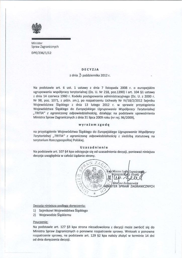 Minister SprawZagranicznych DPE/236|rlL2 DECYZJA z dnia! paidziernika2012 r. Na podstawie art. 5 ust. 1 ustawy z dnia 7 listopada 2008 r. o europejskim ugrupowaniuwsp6fpracyterytorialnej(Dz. U. Nr 218, po2.1390)i art. 104 51 ustawy (Dz. U. z 2000 r. z dnia 14 czerwca1950 r. Kodekspostepowaniaadministracyjnego Nr 98, poz. LO7!, z p6in. zm.), po rozpatrzeniuUchwalyNr lvl18/2/2012 Sejmiku Wojew6dztwa Slqskiego z dnia 13 lutego 2012 r. w sprawie przystApienia Wojew6dztwa Sfqskiego do Europejsktegotlgrupowanio Wspolprocy Terytorialnej z ogroniczonqodpowiedzialnoklq,dziatajqcna podstawie upowainienia "TRITIA' MinistraSprawZagranicznych z dnia31 lipca2009roku (nr rej. 96/2009), w y r a i a m z g o dq na pnystapienie Wojew6dztwa Sl4skiegodo EuropejskiegoaJgtupowanioWsp6lprocy Terytoidlnej ,,TRlTlA" z ogroniczonq odpowiedziolnoiciq z siedzibq statutowa na terytorium Rzeczypospolitej Polskiej. Uzasadnienle Na podstawieart. 107 54 kpaodstqpujesie od uzasadnienia decyzji,poniewaininiejsza decyzjauwzglqdniaw calosci2qdaniestrony. i\ rti Decvzianinieiszapodleqadoreczeniu: 1) SejmikowiWojew6dztwaSleskiego 2) WojewodzieSlqskiemu Pouczenie: Na podstawieart. 127 53 kpa strona niezadowolonaz declzji moie zwr6ci6siq do Ministra SprawZagranicznych o ponownerozpatrzeniesprawy.Wnioseko ponowne rozpatrzeniesprawy,na podstawieart. 129 52 kpa naleiy do|vi w terminie 14 dni od dnia dorqczeniadecyzji.