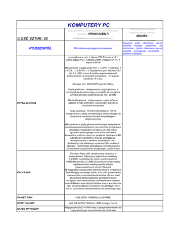 KOMPUTERY PC PROSZĘ WPISAĆ PRODUCENTA OFEROWANEGO ILOŚĆ SZTUK: 52 PODZESPÓŁ SPRZĘTU PRODUCENT: ………………………………… Minimalne wymagania sprzętowe wyposażona w min. 1 złącze PCI Express x16, 1 wolne złącza PCI, 4 złącza DIMM, 2 złącza SATA, 1 złącze eSATA Wbudowane w płytę porty min: 1 x LPT; 1 x RS232, 1 x VGA, 1 x eSATA, 1 x DisplayPort; port sieciowy RJ45, 8 x USB, w tym 8 portów wyprowadzonych bezpośrednio na zewnątrz komputera: 2 z przodu obudowy i 6 z tyłu, Obsługa min. 8GB DDR3 pamięci RAM, Karta graficzna : zintegrowana z płytą główną, z możliwością dynamicznego przydzielenia pamięci w obrębie pamięci systemowej do min. 256MB PŁYTA GŁÓWNA Karta dźwiękowa : zintegrowana z płytą główną, zgodna z High Definition, wewnętrzny głośnik w obudowie komputera Karta sieciowa: 10/100/1000 Ethernet RJ 45, zintegrowana z płytą umożliwiająca zdalny dostęp do komputera z poziomu konsoli zarządzająco – diagnostycznej. PROCESOR PAMIĘĆ RAM DYSK TWARDY NAPĘD OPTYCZNY Wbudowana w płytę główną technologia zarządzania i monitorowania komputerem na poziomie sprzętowym działająca niezależnie od stanu czy obecności systemu operacyjnego oraz stanu włączenia komputera podczas pracy na zasilaczu sieciowym AC, wbudowany sprzętowy firewall, zarządzany i konfigurowany z serwera zarządzania oraz niedostępny dla lokalnego systemu OS i lokalnych aplikacji, Technologia zarządzania i monitorowania komputerem na poziomie sprzętowym powinna być zgodna z otwartymi standardami DMTF WS-MAN Procesor klasy x86, dedykowany do pracy w komputerach, taktowany zegarem co najmniej 2,93GHz, częstotliwość szyny systemowej min. 1066MHz pamięć L2 3MB lub procesor równoważny wydajnościowo według wyniku testów przeprowadzonych przez Oferenta. W przypadku użycia przez oferenta testów wydajności Zamawiający zastrzega sobie, iż w celu sprawdzenia poprawności przeprowadzenia testów oferent musi dostarczyć zamawiającemu oprogramowanie testujące, oba równoważne porównywalne zestawy oraz dokładny opis użytych testów wraz z wynikami w celu ich sprawdzenia w terminie nie dłuższym niż 3 dni od otrzymania zawiadomienia od zamawiającego 4GB DDR3 1066MHz (2x2048MB) 160 GB SATAII 7200rpm, 8MB pamięci Cache Nagrywarka DVD +/-RW wraz z oprogramowaniem do nagrywania płyt zamontowana w obudowie PROSZĘ WPISAĆ MODEL OFEROWANEGO SPRZĘTU MODEL: …………………… Wypełnić jeżeli oferowany sprzęt posiada wyższe parametry niż minimalne. (Jeżeli oferowany sprzęt posiada wymagania minimalne prosimy o podpis). OBUDOWA MYSZ KLAWIATURA SYSTEM OPERACYJNY DODATKOWE OPROGRAMOWANIE Małogabarytowa ( wymiary max 100x350x350 mm), wolna kieszeń 3.5” dostępna z zewnątrz obudowy wyposażona w czujnik otwarcia współpracujący z dostarczonym oprogramowaniem zarządzająco – diagnostycznym Konstrukcja obudowy ma pozwalać na jej otwieranie i demontaż z niej napędów bez użycia narzędzi Zasilacz o mocy max. 240W i wydajności min 88% Mysz laserowa USB z sześcioma klawiszami oraz rolką (scroll) min 1000dpi Klawiatura USB w układzie polski programisty Microsoft Windows 7 Professional. 32 bit z downgrade do Microsoft Windows XP Professional PL z Service Pack 3 zainstalowany system operacyjny niewymagający aktywacji za pomocą telefonu lub Internetu w firmie Microsoft. Dołączony nośnik z oprogramowaniem, Oprogramowanie dostarczone przez producenta komputera pozwalające na zdalną inwentaryzację komputerów w sieci, lokalną i zdalną inwentaryzację komponentów komputera, umożliwiające co najmniej: • Informowanie administratora o otwarciu obudowy • Zdalne zablokowanie stacji dysków, portów szeregowych, równoległych, USB, • Zdalne uaktualnianie BIOS zarówno na pojedynczym komputerze a także na grupie komputerów w tym samym czasie, • Zdalną konfigurację BIOS, wpisanie unikalnego numeru nadanego przez użytkownika, sekwencji startowej, włączenia/wyłączenia portów USB, stacji dysków, portów szeregowych, • Zdalne wyłączanie oraz restart komputera w sieci, • Zdalne przejęcie konsoli tekstowej stacji roboczej przy wyłączonym komputerze • Otrzymywanie informacji WMI – Windows Management Interface, • Monitorowanie stanu komponentów: CPU, Pamięć RAM, HDD, parametrów termicznych, wolnego miejsca na dyskach twardych, wersje BIOS przy wyłączonym komputerze lub nieobecnym/uszkodzonym systemie CERTYFIKATY GWARANCJA • Certyfikat ISO9001 dla producenta sprzętu (załączyć dokument potwierdzający spełnianie wymogu) • Oferowane modele komputerów muszą posiadać certyfikat Microsoft, potwierdzający poprawną współpracę oferowanych modeli komputerów z systemem operacyjnym Windows 7 (załączyć wydruk ze strony Microsoft WHCL) • Głośność jednostki centralnej mierzona zgodnie z normą ISO 7779 oraz wykazana zgodnie z normą ISO 9296 w pozycji obserwatora w trybie jałowym ( IDLE) wynosząca maksymalnie 24dB (załączyć oświadczenie producenta ) • Deklaracja zgodności CE (załączyć do oferty) • Komputer musi spełniać wymogi normy Energy Star 4.0 Wymagany wpis dotyczący oferowanego komputera w internetowym katalogu http://www.euenergystar.org – dopuszcza się wydruk ze strony internetowej • Certyfikat EPEAT na poziomie GOLD Wymagany wpis dotyczący oferowanego komputera w internetowym katalogu http://www.epeat.net dopuszcza się wydruk ze strony internetowej 3-letnia gwarancja świadczona na miejscu u klienta Czas reakcji serwisu - do końca następnego dnia roboczego Oświadczenie producenta komputera, że w przypadku nie wywiązywania się z obowiązków gwarancyjnych oferenta lub firmy serwisującej, przejmie na siebie wszelkie zobowiązania związane z serwisem gwarancyjnym. MONITORY LCD 17" PROSZĘ WPISAĆ PRODUCENTA OFEROWANEGO ILOŚĆ SZTUK: 51 PODZESPÓŁ PRZEKĄTNA Rozdzielczość nominalna KONTRAST SPRZĘTU PRODUCENT: …………………
