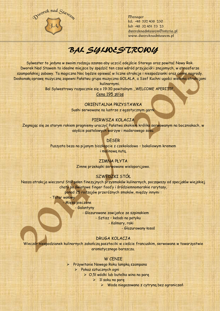 Manager tel. +48 532 438 230 lub +48 32 451 73 23 [email protected] www.dworeknadstawem.pl BAL SYLWESTROWY Sylwester to jedyna w swoim rodzaju szansa aby uczcić odejście Starego oraz powitać Nowy Rok. Dworek Nad Stawem to idealne miejsce by spędzić ten czas wśród przyjaciół i znajomych, w atmosferze szampańskiej zabawy. Ta magiczna Noc będzie opiewać w liczne atrakcje i niespodzianki oraz cenne nagrody. Doskonałą oprawę muzyczną zapewni Państwu grupa muzyczna GOLALA, a Szef Kuchni ugości wieloma atrakcjami kulinarnymi. Bal Sylwestrowy rozpocznie się o 19:30 powitalnym ,,WELCOME APERITIF, Cena 195 zł/os ORIENTALNA PRZYSTAWKA Sushi serwowane na lustrze z egzotycznym garni. PIERWSZA KOLACJA Żegnając się ze starym rokiem pragniemy uraczyć Państwa skokiem królika serwowanym na boczniakach, w asyście pastelowych warzyw i maderowego sosu. DESER Puszysta beza na pijanym biszkopcie z czekoladowo – bakaliowym kremem i malinową nutą. ZIMNA PŁYTA Zimne przekąski serwowane wieloporcjowo. SZWEDZKI STÓŁ Nasza atrakcja wieczoru! Stół pełen finezyjnych przysmaków kulinarnych, począwszy od specjałów wiejskiej chaty po światowe finger food’y i śródziemnomorskie rarytasy, ponad 25 rodzajów przeróżnych smaków, między innymi : - Tatar wołowy - Mięsa pieczone - Galantyny - Glazurowane zawijańce ze szpinakiem - Sztisz – kebab na patyku - Kalmary, raki - Glazurowany łosoś DRUGA KOLACJA Wieczór niespodzianek kulinarnych zakończą paszteciki w cieście francuskim, serwowane w towarzystwie aromatycznego barszczu. W CENIE Przywitanie Nowego Roku lampką szampana Pokaz sztucznych ogni O,5l wódki lub butelka wina na parę 1l soku na parę Woda niegazowana z cytryną bez ograniczeń