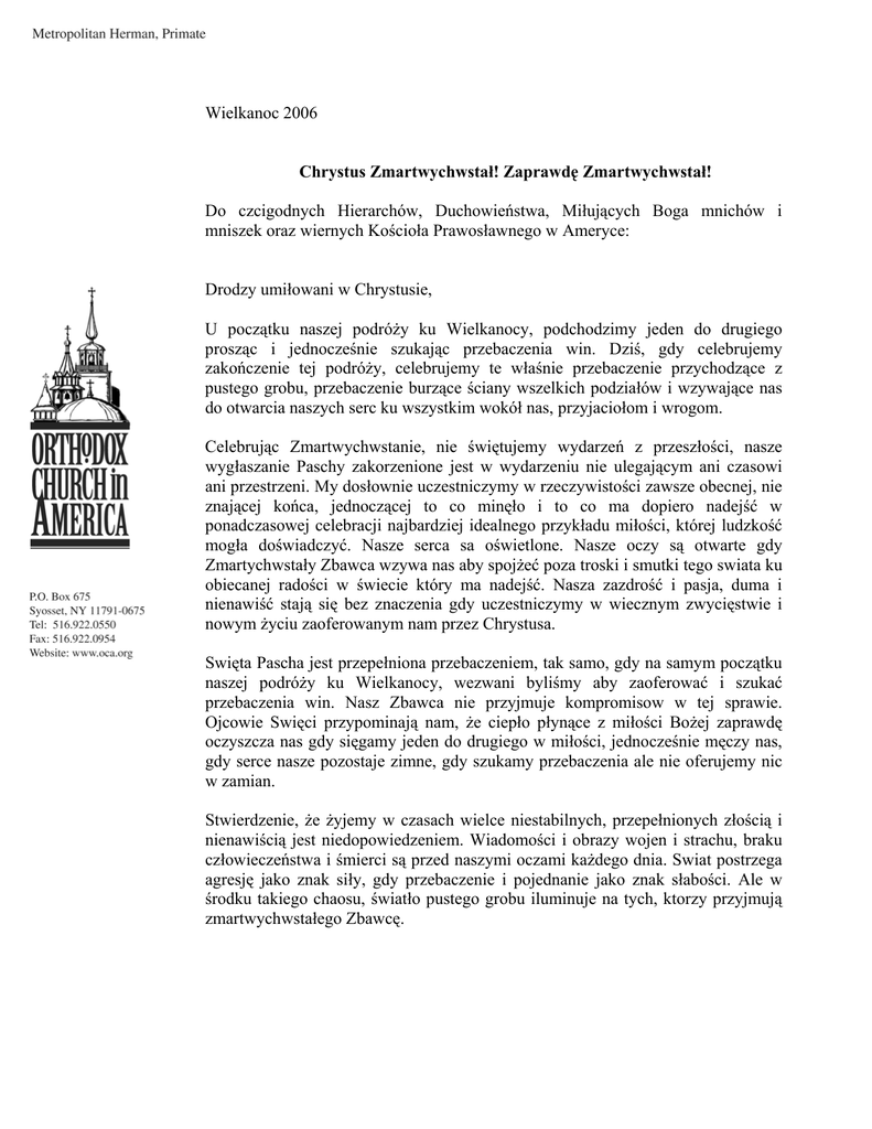 Wielkanoc 2006 Chrystus Zmartwychwstał! Zaprawdę Zmartwychwstał! Do czcigodnych Hierarchów, Duchowieństwa, Miłujących Boga mnichów i mniszek oraz wiernych Kościoła Prawosławnego w Ameryce: Drodzy umiłowani w Chrystusie, U początku naszej podróży ku Wielkanocy, podchodzimy jeden do drugiego prosząc i jednocześnie szukając przebaczenia win. Dziś, gdy celebrujemy zakończenie tej podróży, celebrujemy te właśnie przebaczenie przychodzące z pustego grobu, przebaczenie burzące ściany wszelkich podziałów i wzywające nas do otwarcia naszych serc ku wszystkim wokół nas, przyjaciołom i wrogom. Celebrując Zmartwychwstanie, nie świętujemy wydarzeń z przeszłości, nasze wygłaszanie Paschy zakorzenione jest w wydarzeniu nie ulegającym ani czasowi ani przestrzeni. My dosłownie uczestniczymy w rzeczywistości zawsze obecnej, nie znającej końca, jednoczącej to co minęło i to co ma dopiero nadejść w ponadczasowej celebracji najbardziej idealnego przykładu miłości, której ludzkość mogła doświadczyć. Nasze serca sa oświetlone. Nasze oczy są otwarte gdy Zmartychwstały Zbawca wzywa nas aby spojżeć poza troski i smutki tego swiata ku obiecanej radości w świecie który ma nadejść. Nasza zazdrość i pasja, duma i nienawiść stają się bez znaczenia gdy uczestniczymy w wiecznym zwycięstwie i nowym życiu zaoferowanym nam przez Chrystusa. Swięta Pascha jest przepełniona przebaczeniem, tak samo, gdy na samym początku naszej podróży ku Wielkanocy, wezwani byliśmy aby zaoferować i szukać przebaczenia win. Nasz Zbawca nie przyjmuje kompromisow w tej sprawie. Ojcowie Swięci przypominają nam, że ciepło płynące z miłości Bożej zaprawdę oczyszcza nas gdy sięgamy jeden do drugiego w miłości, jednocześnie męczy nas, gdy serce nasze pozostaje zimne, gdy szukamy przebaczenia ale nie oferujemy nic w zamian. Stwierdzenie, że żyjemy w czasach wielce niestabilnych, przepełnionych złością i nienawiścią jest niedopowiedzeniem. Wiadomości i obrazy wojen i strachu, braku człowieczeństwa i śmierci są przed naszymi oczami każdego dnia. Swiat postrzega agresję jako znak siły, gdy przebaczenie i pojednanie jako znak słabości. Ale w środku takiego chaosu, światło pustego grobu iluminuje na tych, ktorzy przyjmują zmartwychwstałego Zbawcę. Nie bójmy się zaoferować jeden drugiemu te święte przebaczenie, którym nas Pan tak obficie obdarzył. Radujmy się w tym najważniejszym Swięcie Swiąt i niech pokój i miłość Zmartwychwstałego Pana oświetla was. Z miłością w Zmartwychwstałym Chrystusie, + Herman Arcybiskup Waszyngtonu i Nowego Jorku Metropolita Ameryki i Kanady