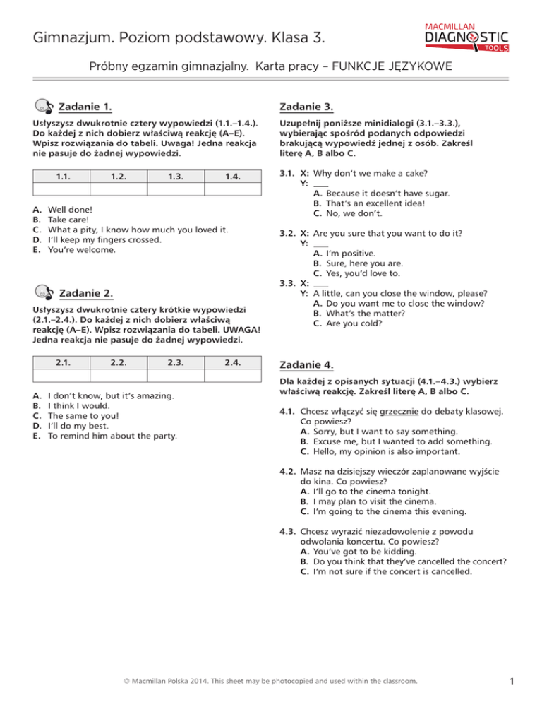 Gimnazjum. Poziom podstawowy. Klasa 3. Próbny egzamin gimnazjalny. Karta pracy – FUNKCJE JĘZYKOWE 01 Zadanie 1. Zadanie 3. Usłyszysz dwukrotnie cztery wypowiedzi (1.1.–1.4.). Do każdej z nich dobierz właściwą reakcję (A–E). Wpisz rozwiązania do tabeli. Uwaga! Jedna reakcja nie pasuje do żadnej wypowiedzi. 1.1. A. B. C. D. E. 02 1.2. 1.3. 1.4. Well done! Take care! What a pity, I know how much you loved it. I’ll keep my fingers crossed. You’re welcome. Zadanie 2. Usłyszysz dwukrotnie cztery krótkie wypowiedzi (2.1.–2.4.). Do każdej z nich dobierz właściwą reakcję (A–E). Wpisz rozwiązania do tabeli. UWAGA! Jedna reakcja nie pasuje do żadnej wypowiedzi. 2.1. A. B. C. D. E. 2.2. 2.3. I don’t know, but it’s amazing. I think I would. The same to you! I’ll do my best. To remind him about the party. 2.4. Uzupełnij poniższe minidialogi (3.1.–3.3.), wybierając spośród podanych odpowiedzi brakującą wypowiedź jednej z osób. Zakreśl literę A, B albo C. 3.1. X: Why don’t we make a cake? Y: A.Because it doesn’t have sugar. B. That’s an excellent idea! C. No, we don’t. 3.2. X: Are you sure that you want to do it? Y: A.I’m positive. B. Sure, here you are. C. Yes, you’d love to. 3.3. X: Y: A little, can you close the window, please? A.Do you want me to close the window? B. What’s the matter? C. Are you cold? Zadanie 4. Dla każdej z opisanych sytuacji (4.1.–4.3.) wybierz właściwą reakcję. Zakreśl literę A, B albo C. 4.1.Chcesz włączyć się grzecznie do debaty klasowej. Co powiesz? A.Sorry, but I want to say something. B. Excuse me, but I wanted to add something. C. Hello, my opinion is also important. 4.2.Masz na dzisiejszy wieczór zaplanowane wyjście do kina. Co powiesz? A.I’ll go to the cinema tonight. B. I may plan to visit the cinema. C. I’m going to the cinema this evening. 4.3.Chcesz wyrazić niezadowolenie z powodu odwołania koncertu. Co powiesz? A.You’ve got to be kidding. B. Do you think that they’ve cancelled the concert? C. I’m not sure if the concert is cancelled. © Macmillan Polska 2014. This sheet may be photocopied and used within the classroom. 1