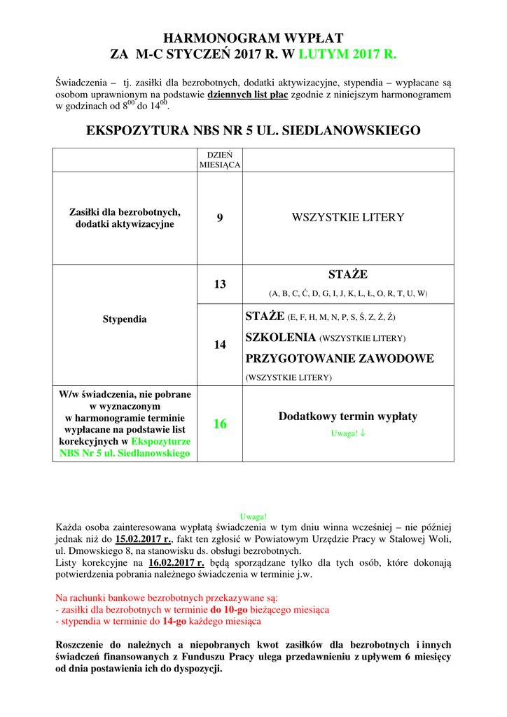 HARMONOGRAM WYPŁAT ZA M-C STYCZEŃ 2017 R. W LUTYM 2017 R. Świadczenia – tj. zasiłki dla bezrobotnych, dodatki aktywizacyjne, stypendia – wypłacane są osobom uprawnionym na podstawie dziennych list płac zgodnie z niniejszym harmonogramem w godzinach od 800 do 1400. EKSPOZYTURA NBS NR 5 UL. SIEDLANOWSKIEGO DZIEŃ MIESIĄCA Zasiłki dla bezrobotnych, dodatki aktywizacyjne WSZYSTKIE LITERY 9 STAŻE 13 (A, B, C, Ć, D, G, I, J, K, L, Ł, O, R, T, U, W) STAŻE (E, F, H, M, N, P, S, Ś, Z, Ż, Ź) Stypendia 14 SZKOLENIA (WSZYSTKIE LITERY) PRZYGOTOWANIE ZAWODOWE (WSZYSTKIE LITERY) W/w świadczenia, nie pobrane w wyznaczonym w harmonogramie terminie wypłacane na podstawie list korekcyjnych w Ekspozyturze NBS Nr 5 ul. Siedlanowskiego Dodatkowy termin wypłaty 16 Uwaga! ↓ Uwaga! Każda osoba zainteresowana wypłatą świadczenia w tym dniu winna wcześniej – nie później jednak niż do 15.02.2017 r., fakt ten zgłosić w Powiatowym Urzędzie Pracy w Stalowej Woli, ul. Dmowskiego 8, na stanowisku ds. obsługi bezrobotnych. Listy korekcyjne na 16.02.2017 r. będą sporządzane tylko dla tych osób, które dokonają potwierdzenia pobrania należnego świadczenia w terminie j.w. Na rachunki bankowe bezrobotnych przekazywane są: - zasiłki dla bezrobotnych w terminie do 10-go bieżącego miesiąca - stypendia w terminie do 14-go każdego miesiąca Roszczenie do należnych a niepobranych kwot zasiłków dla bezrobotnych i innych świadczeń finansowanych z Funduszu Pracy ulega przedawnieniu z upływem 6 miesięcy od dnia postawienia ich do dyspozycji.